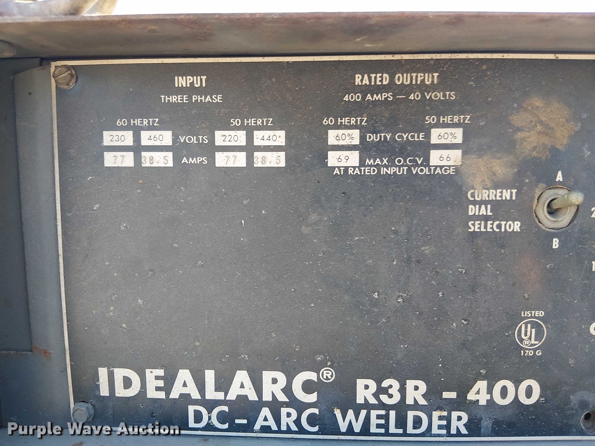 Purple Wave is selling a used Welder (Manual) in Kansas. This item is a Lincoln Idealarc R3R-400 welder with the following: Welder, Capabilities: DC, Stick, Leads, Ground lead: 54", Work lead: 96', (2) carbon arch leads,, Generator, Phase: Three