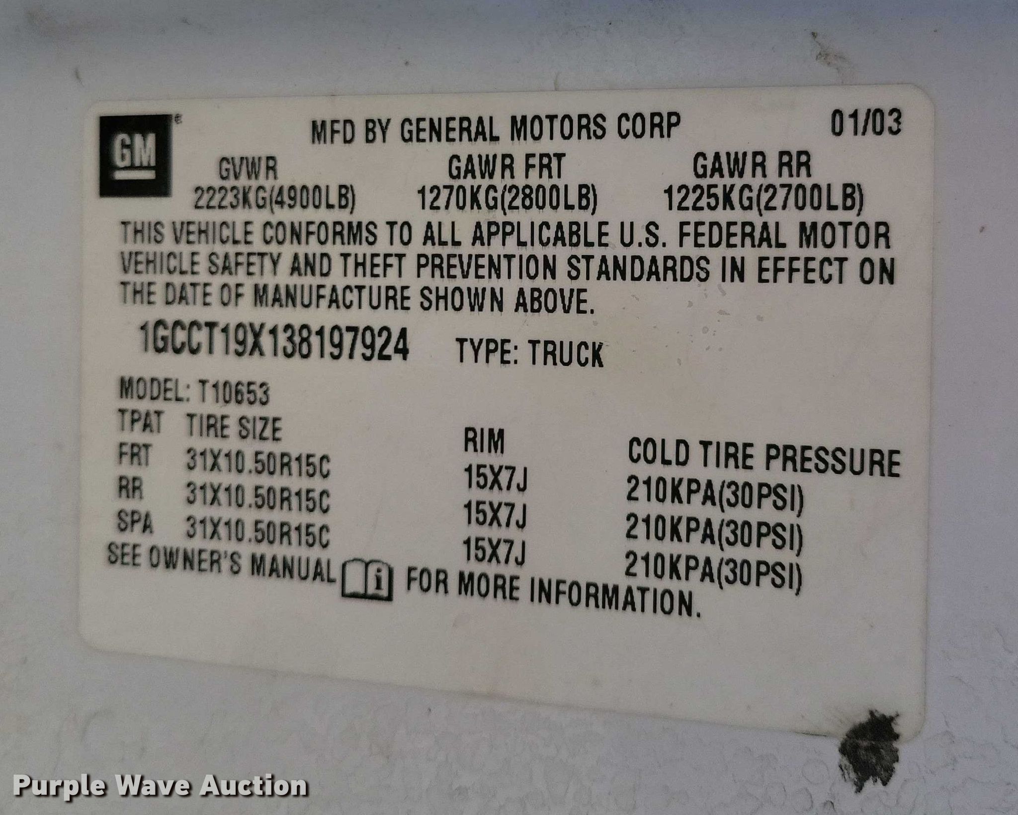 Purple Wave is selling a used Compact Pickup or Van in Iowa. This item is a 2003 Chevrolet S10 Ext. Cab pickup truck with the following: VIN: 1GCCT19X138197924