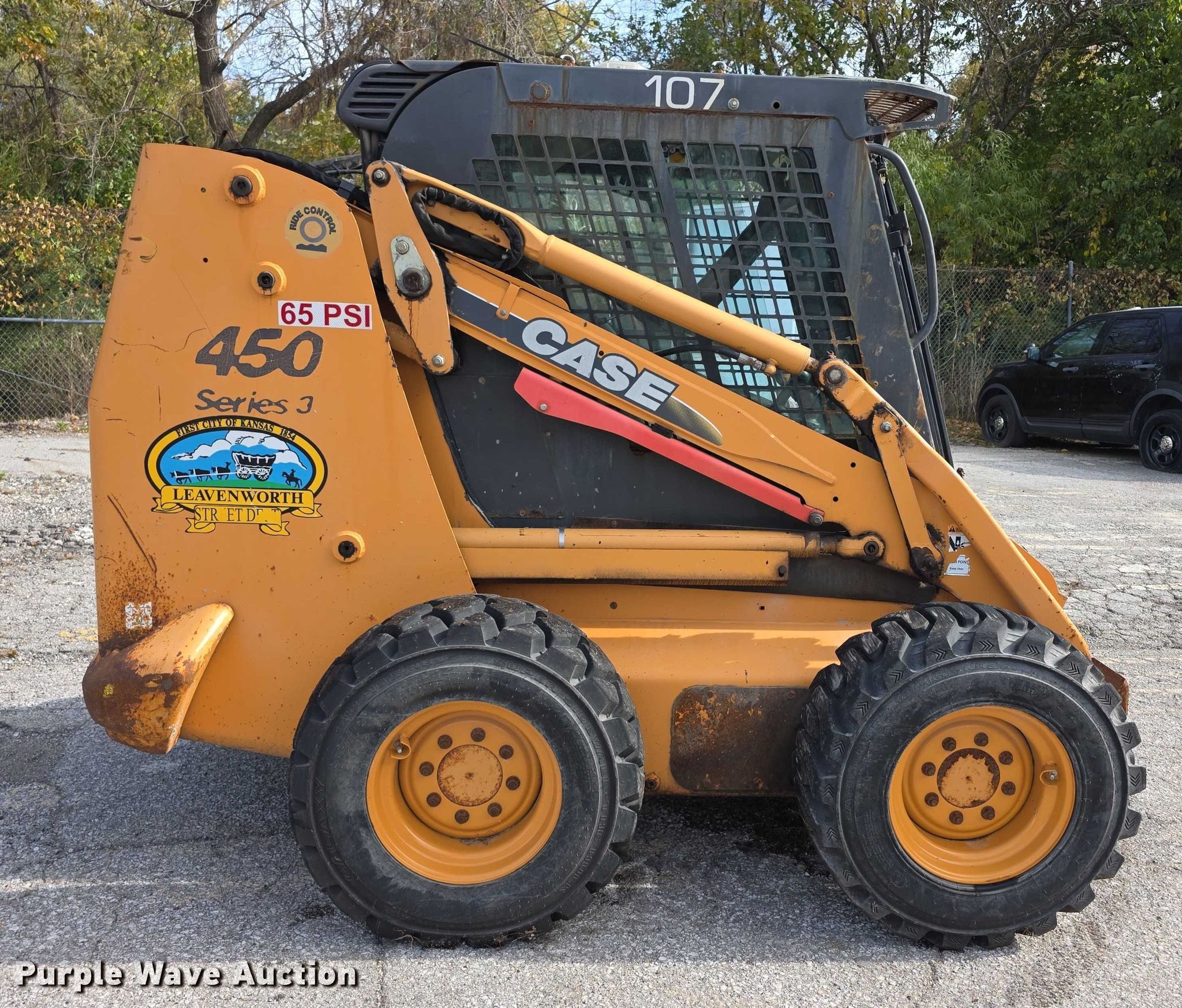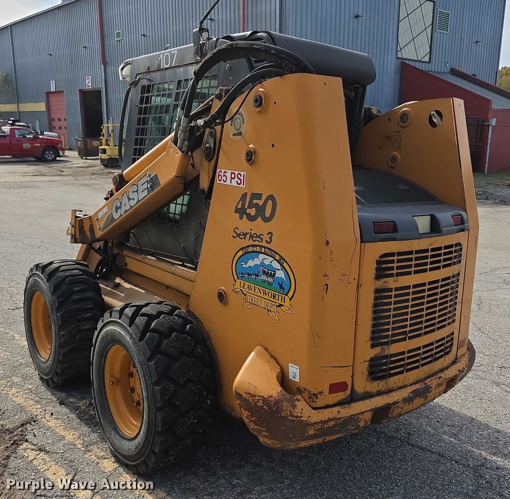 Purple Wave is selling a used Skid Steer Loader in Kansas. This item is a 2007 Case 450 series 3 skid steer loader with the following: Hours: 281 on meter, Serial: N8M484170, Unit #: 107