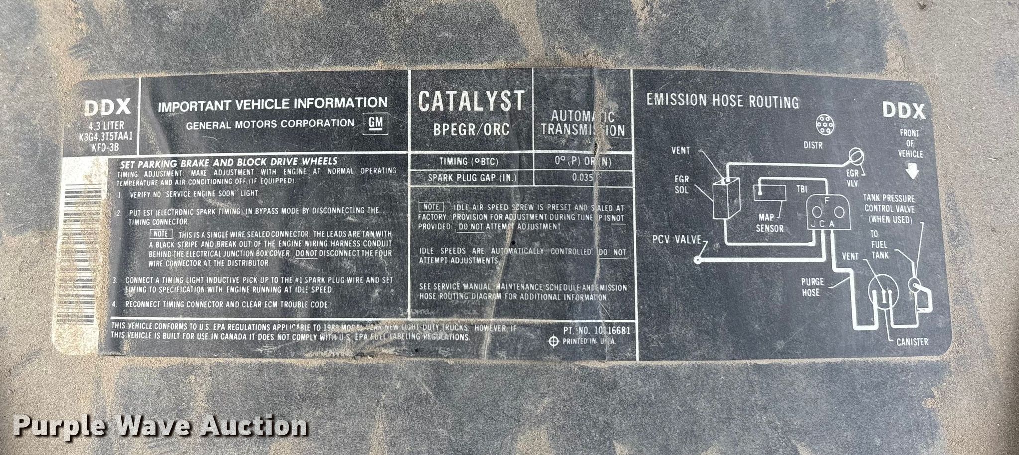 1989 GMC Sierra C1500 utility bed pickup truck. Miles: 55,005 on odometer, Hours: 4,845 on meter, VIN: 1GTDC14Z5KE539887. Engine Displacement: 4.3L V6 OHV 12V, Cylinders: 6, Fuel type: Gas. Transmission Automatic. Interior Heat. Features Bed Utility bed, Knapheide, Length: 9', Width: 78". Tires Size: 235/75R15. Notes CB radio included, Dash warning indicator: Brake, Unknown operating condition of odometer. Nebraska title. Title distribution may be delayed up to 14 days from verification of funds. St. Paul Police Department - Nebraska. Saint Paul, NE 68873