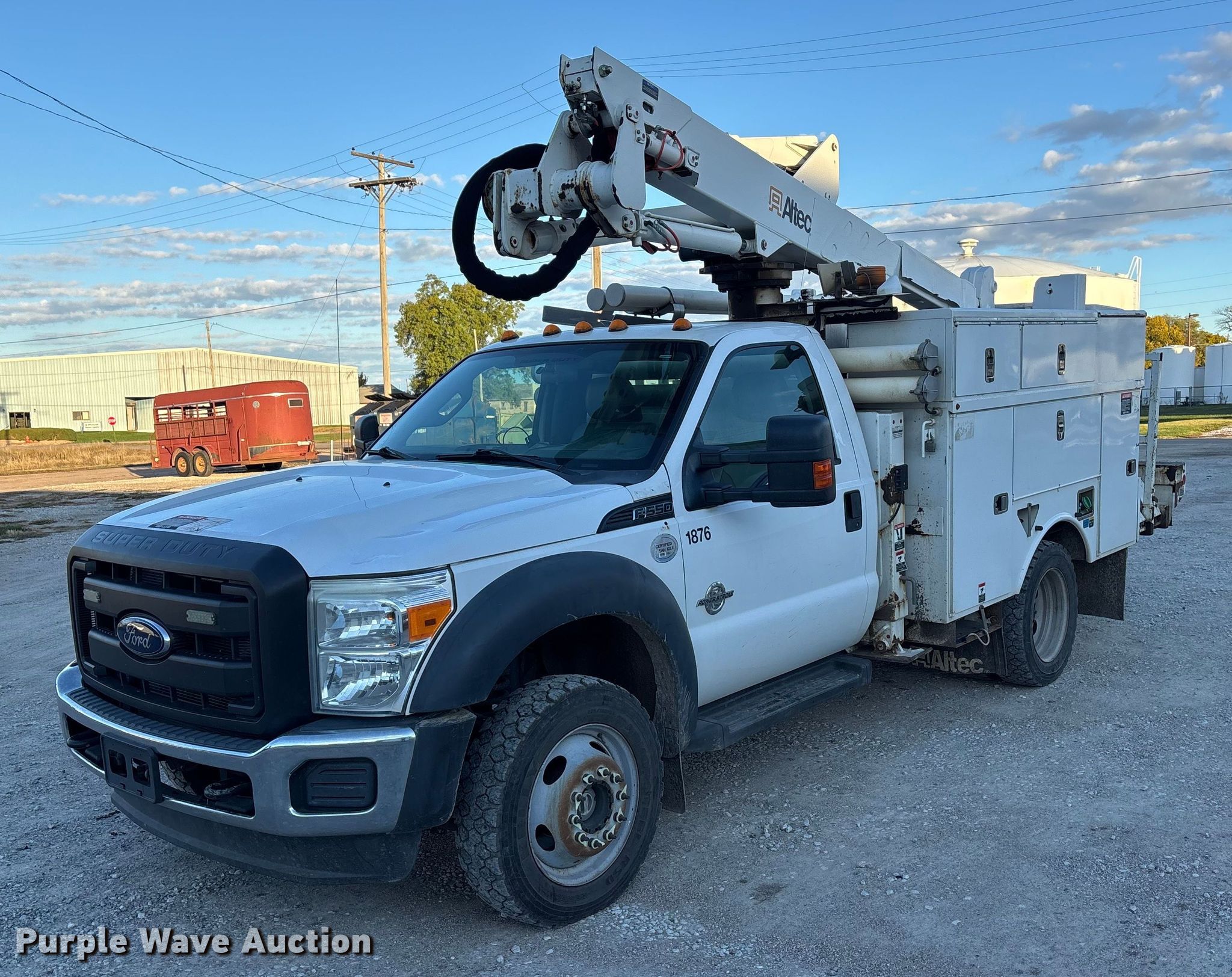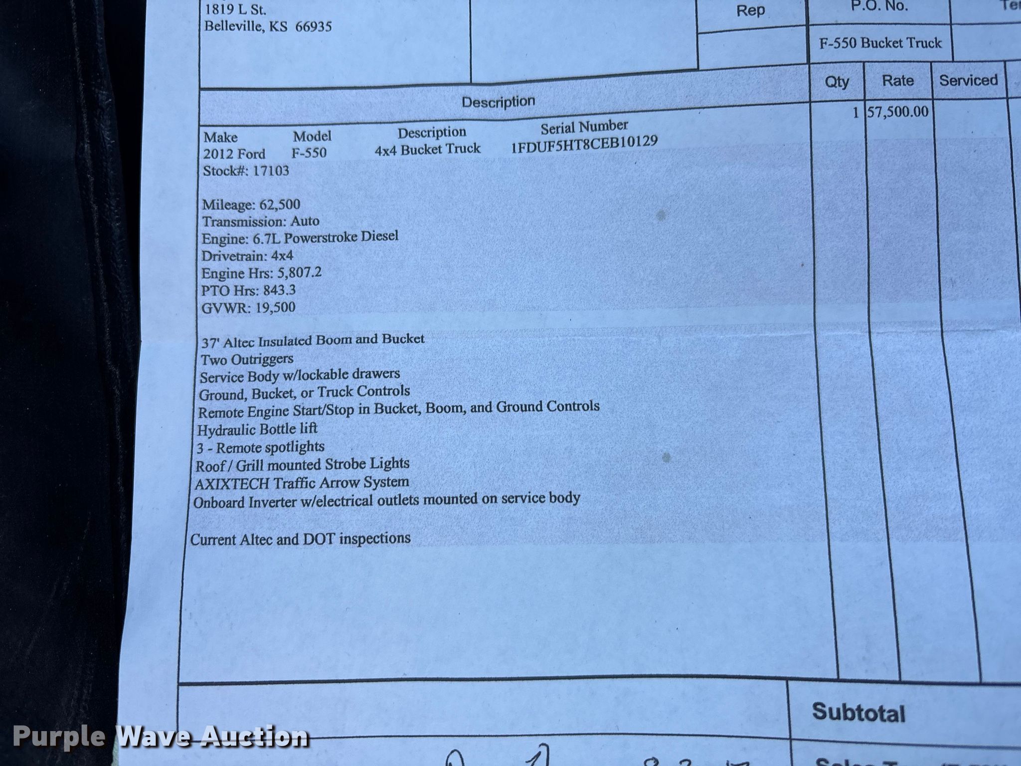 Purple Wave is selling a used Bucket Truck in Kansas. This item is a 2012 Ford F550 bucket truck with the following: Miles: 86,487 on odometer, Hours: 9,617 on meter, Miles or hours may vary, unit still in use, VIN: 1FDUF5HT8CEB10129