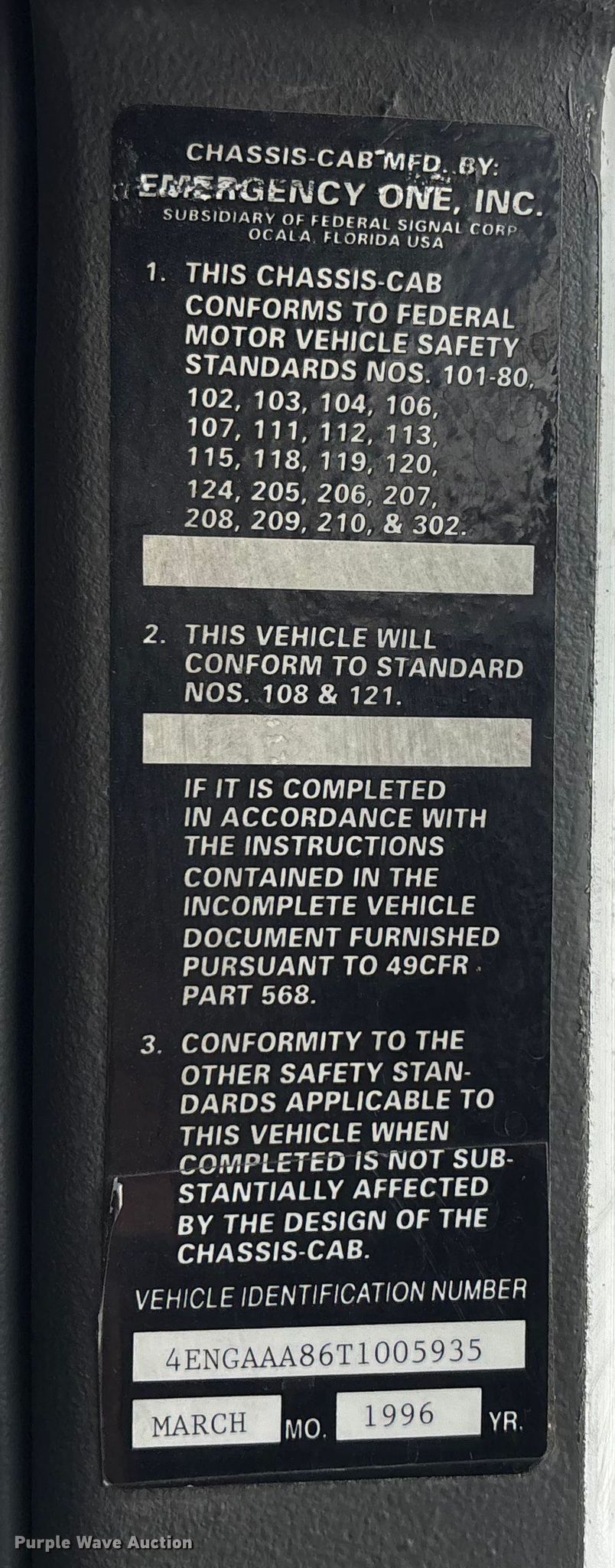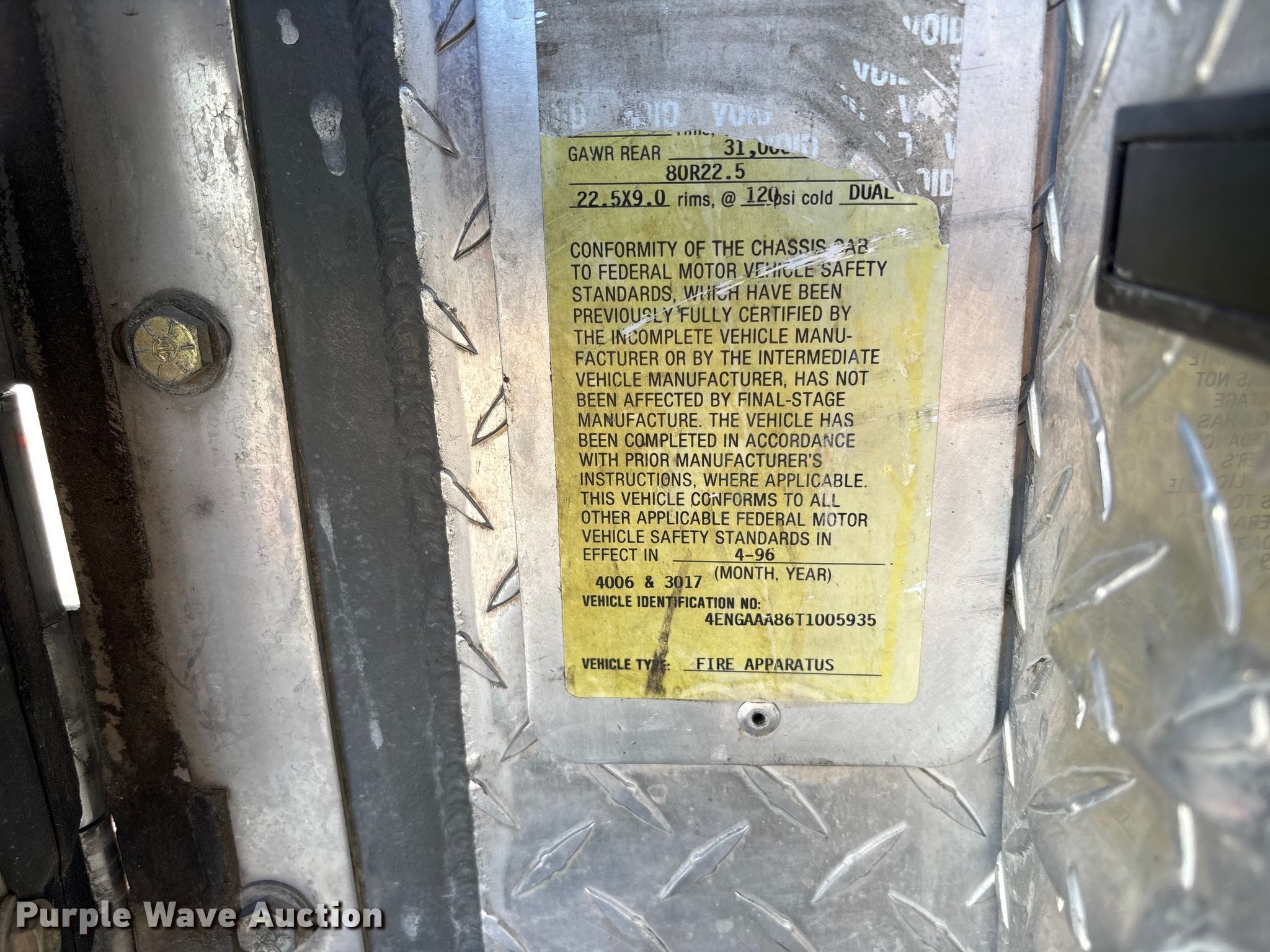 Purple Wave is selling a used Fire Truck or Emergency Vehicle in Nebraska. This item is a 1996 E-One pumper fire truck with the following: Miles: 191,667 on odometer, Hours: 3,276 on meter, VIN: 4ENGAAA86T1005935