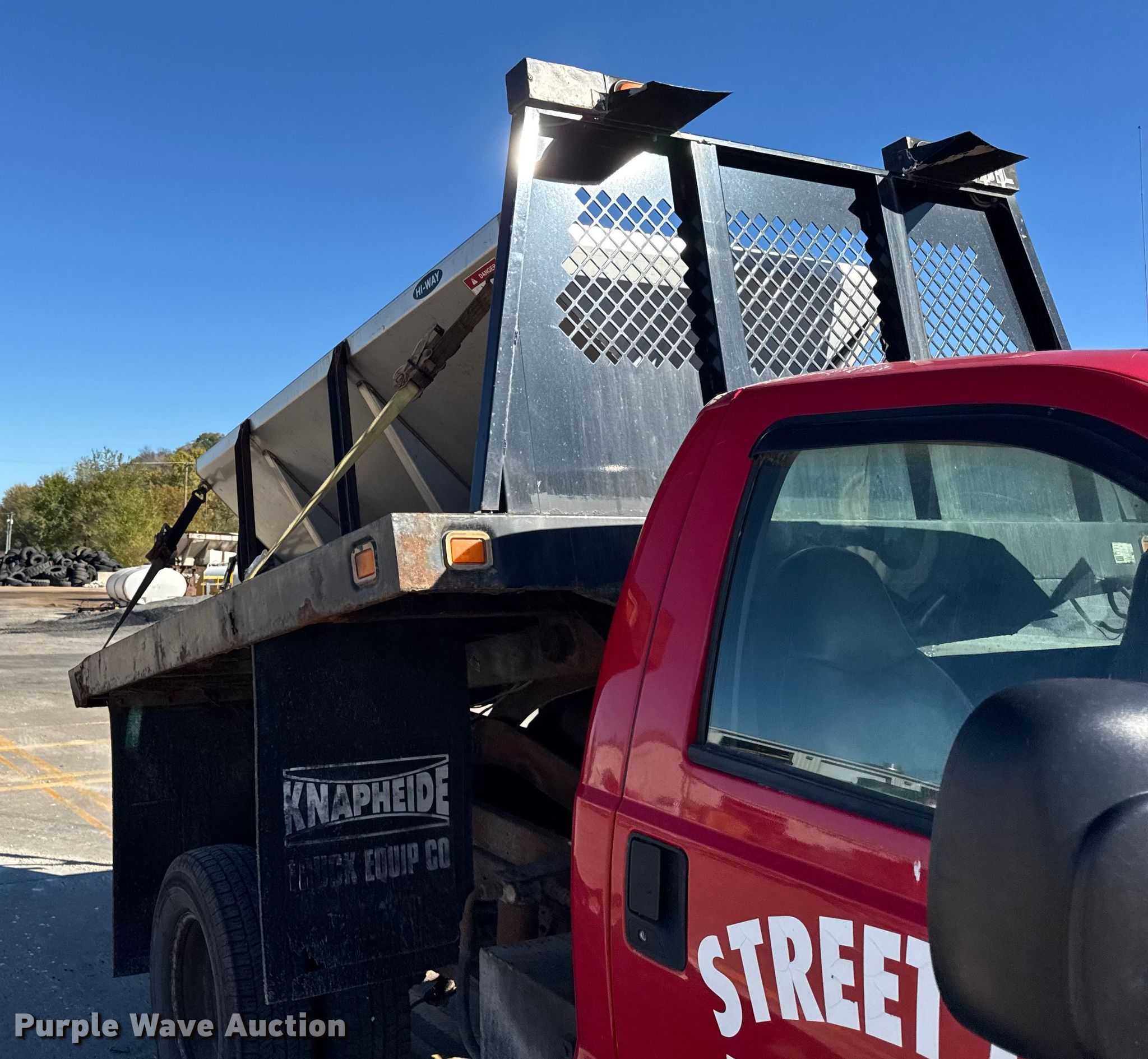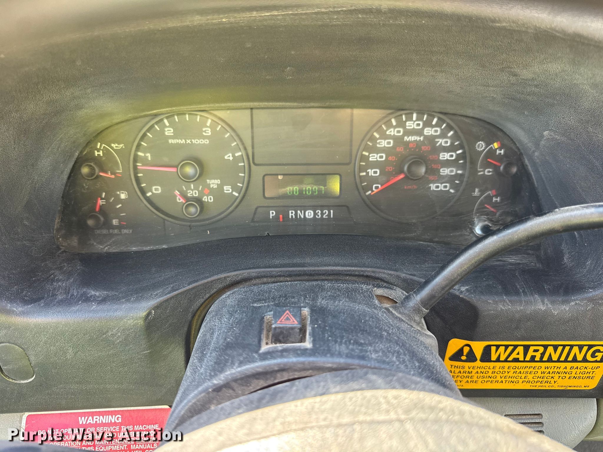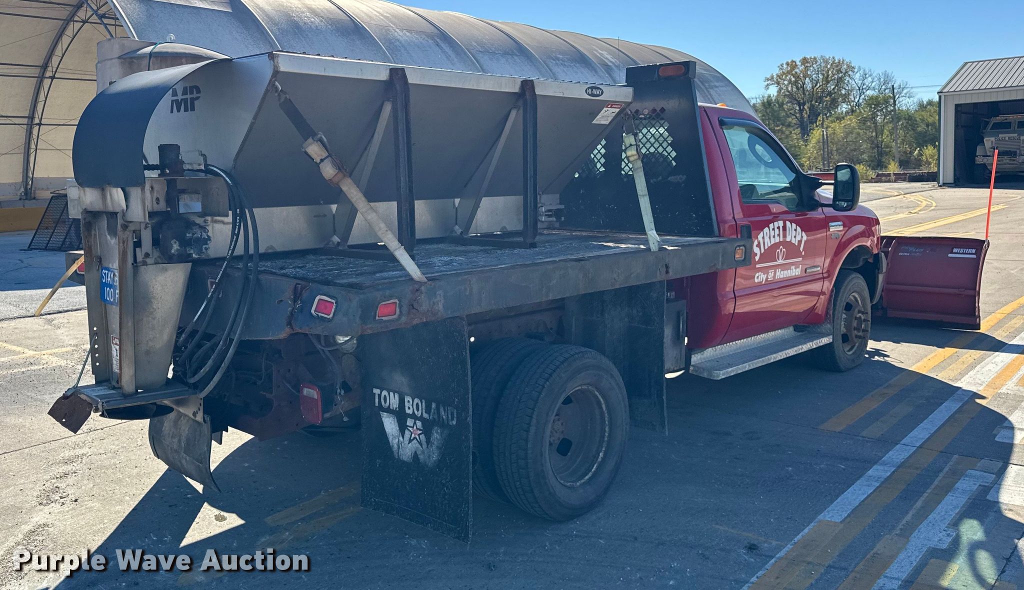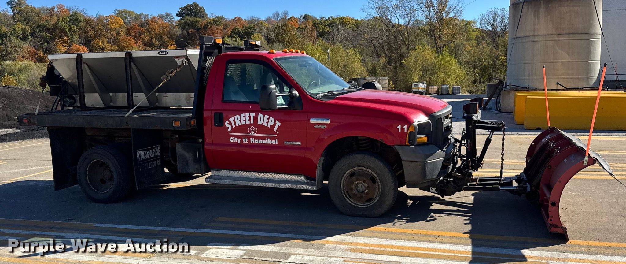 2005 Ford F350 Super Duty dump flatbed pickup truck. Miles: 81,097 on odometer, Hours: 7,495 on meter, VIN: 1FDWF37P35EA25008, Unit #: 17. Engine Displacement: 6.0L, Cylinders: 8, Fuel type: Diesel. Transmission Automatic, Four wheel drive. Interior AC, Heat. Features Bed Dump flatbed, Knapheide PVMX 93C, Length: 9' 3", Width: 96", Hi way MP 8 spreader, Western Pro Plus Ultra Finish snowplow Width: 8' 6". Tires Size: 225/70R17. Notes Two way radio not included, Front drivers side tire flat, Jump start required during on-site data collection. Missouri title. Title distribution may be delayed up to 14 days from verification of funds. City Of Hannibal. Hannibal, MO 63401
