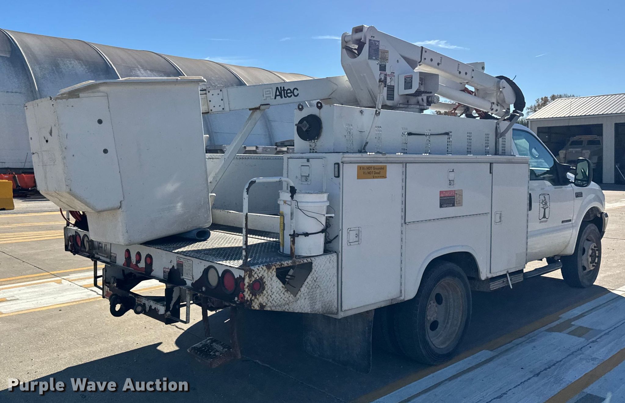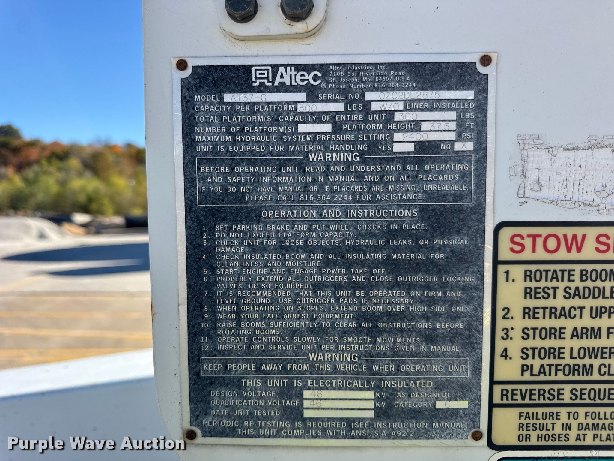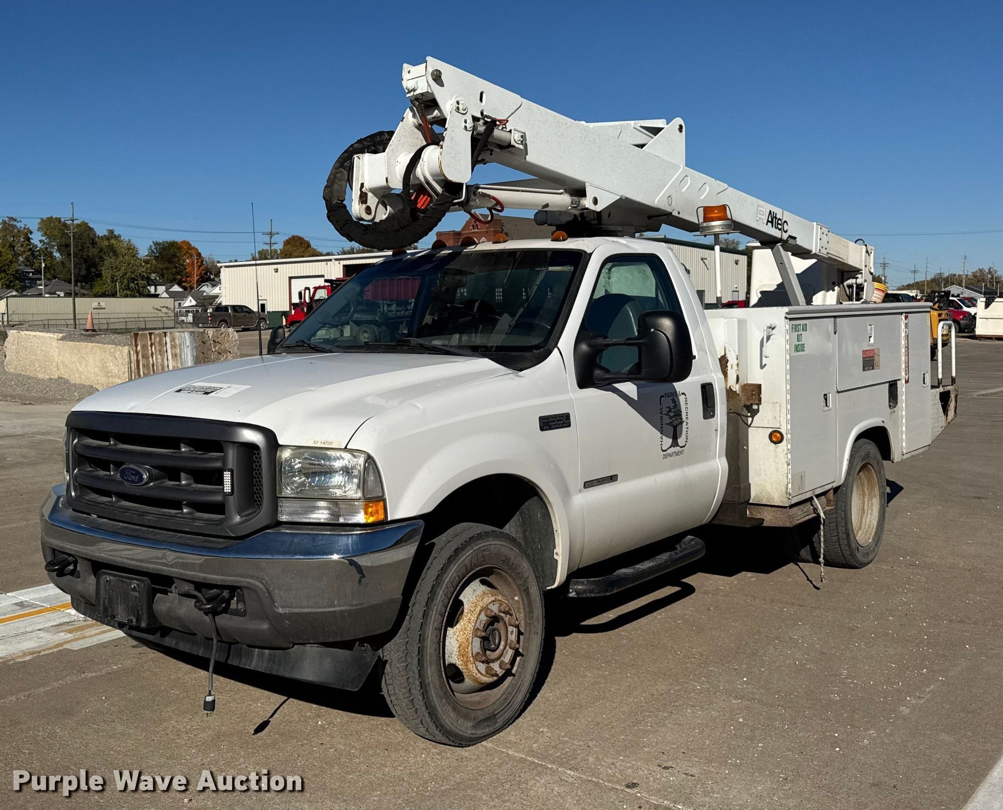2002 Ford F550 bucket truck. Miles: 128,449 on odometer, VIN: 1FDAF57F72EC33238. Engine Displacement: 7.3L, Cylinders: 8, Fuel type: Diesel. Transmission Automatic. Chassis Four wheel drive, Axles: Single, Suspension: Spring, Brakes: Hydraulic, PTO, GVWR: 17,500 lbs. Interior AC, Heat, Cruise control. Features Bed Utility bed, Knapheide 6101D54J, Serial: 015292, Length: 11', Width: 94", Boom Altec AT37-G, Maximum lift capacity: 300 lbs, Maximum lift height: 37', Boom type: Articulating, Insulated, Telescopic, Man basket, Boom controls Ground, Platform/ basket.. Tires Size: 225/70R19.5. Notes Jump start required during on-site data collection, Non-operational boom, Hydraulic line issues, leaks. Missouri title. Title distribution may be delayed up to 14 days from verification of funds. City Of Hannibal. Hannibal, MO 63401