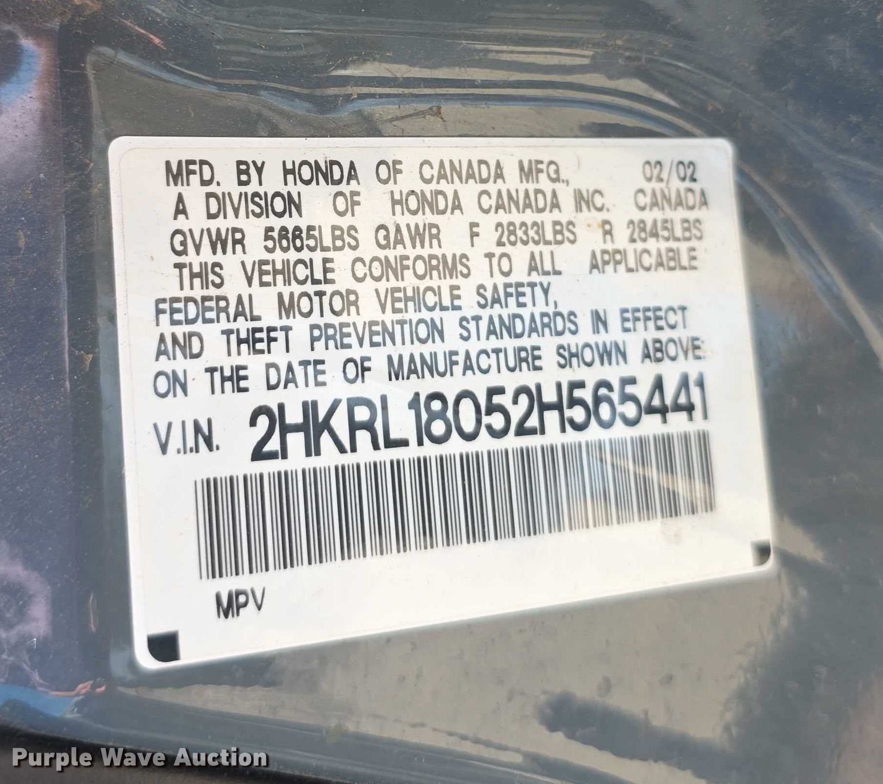 - VIN: 2HKRL18052H565441