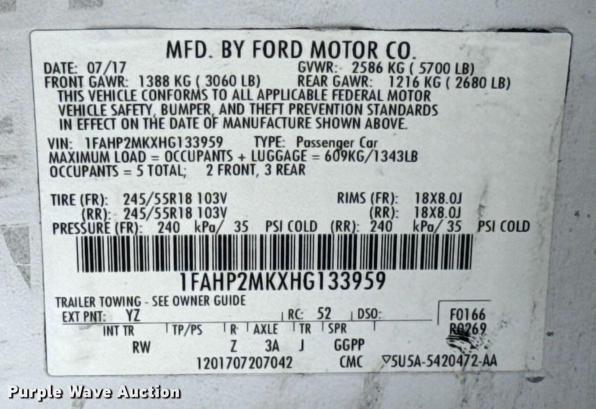 2017 Ford Taurus Police. Miles: 94,362 on odometer, VIN: 1FAHP2MKXHG133959, Unit #: 104. Engine Displacement: 3.7L V6 DOHC, Cylinders: 6, Fuel type: Gas. Transmission Automatic. Interior AC, Heat, Seat: Power driver, Power windows, Power locks, Cruise control, Backup camera. Tires Size: 245/55R18. Notes Jump start required during on-site data collection. Oklahoma title. Mileage has not been verified. Odometer discrepancy will be marked on the title. Seller is a government entity who will be assigning and distributing the title. Please contact the seller for distribution questions. Title distribution may be delayed up to 30 days from verification of funds. City of Tulsa. 108 N Trenton Ave. Tulsa, OK 74120