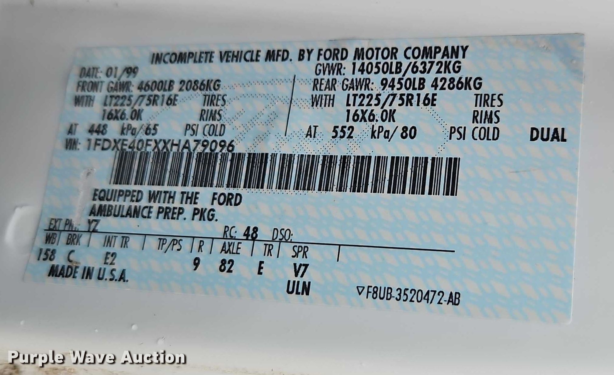 1999 Ford E450 ambulance. Miles: 218,047 on odometer, VIN: 1FDXE40FXXHA79096. Engine Navistar, Displacement: 7.3L, Cylinders: 8, Fuel type: Diesel. Transmission Automatic. Chassis Axles: Single, Suspension: Air, Brakes: Hydraulic, GVWR: 14,050 lbs, Wheelbase: 158". Interior AC, Heat, Power windows, Power locks, Cruise control, Auxiliary controls. Features Ambulance body Braun, PA/ siren controls, Oxygen hookups. Tires Size: 225/75R16. Notes Suspension damage , Unit must be towed or hauled , Additional suspension parts included, Non-operational unit. Missouri title. Title distribution may be delayed up to 14 days from verification of funds. City of Rich Hill. Rich Hill, MO 64779
