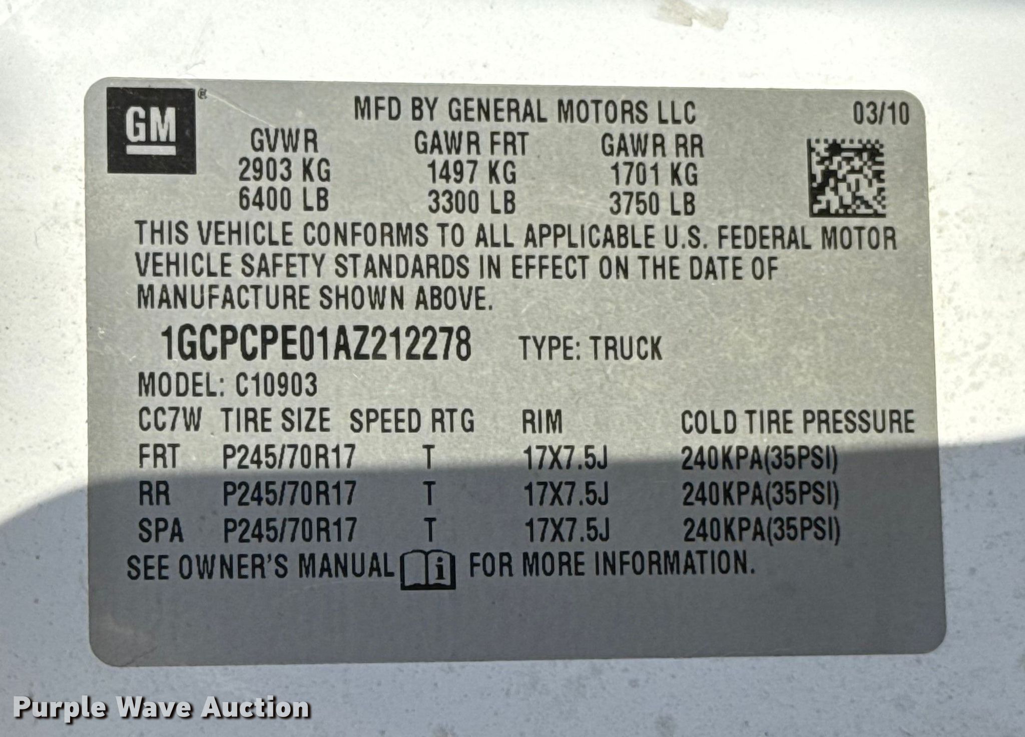 Purple Wave is selling a used 1/2 Ton Pickup or Van in Oklahoma. This item is a 2010 Chevrolet Silverado 1500 pickup truck with the following: Miles: 96,537 on odometer, VIN: 1GCPCPE01AZ212278, Unit #: 0210