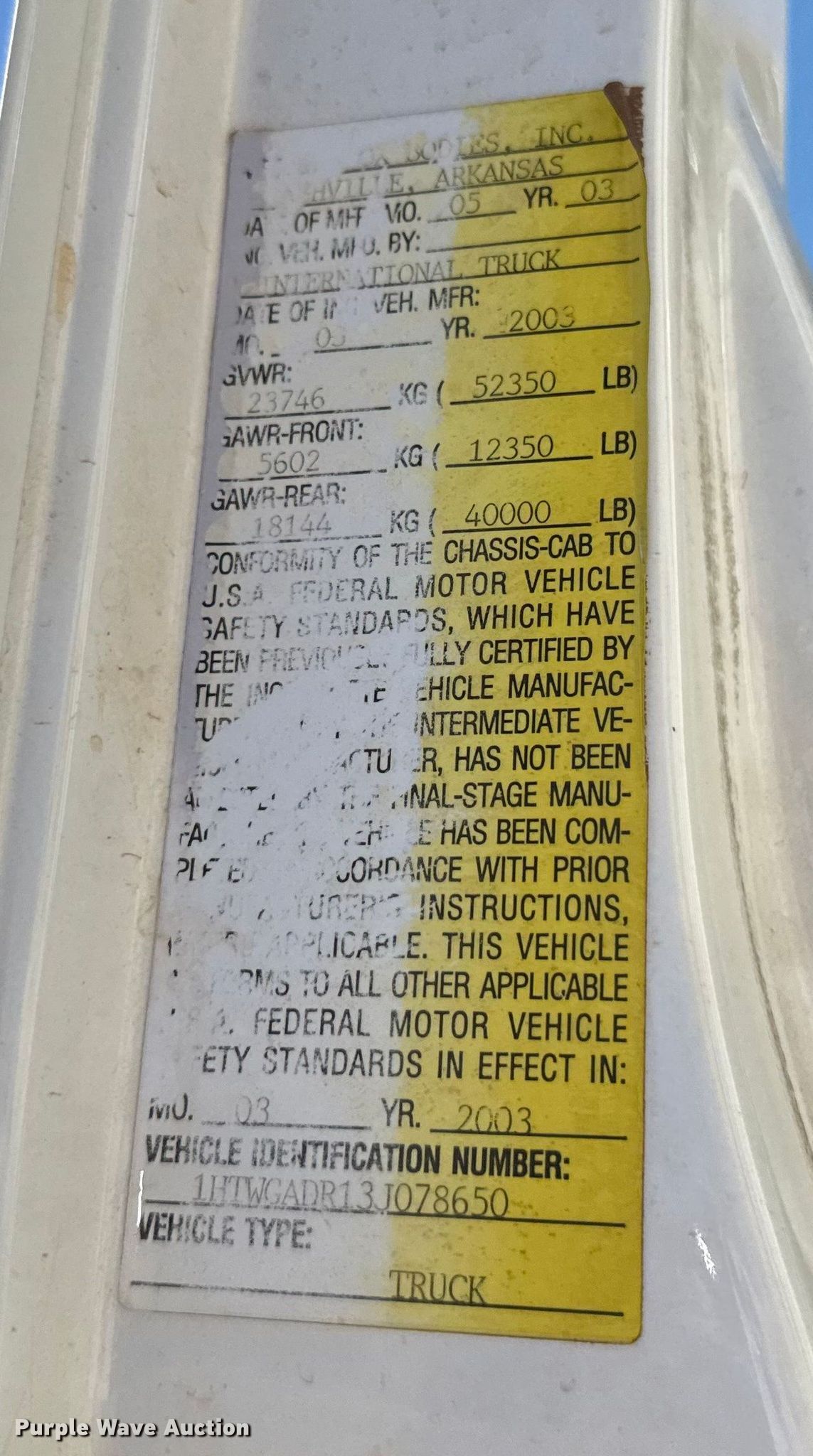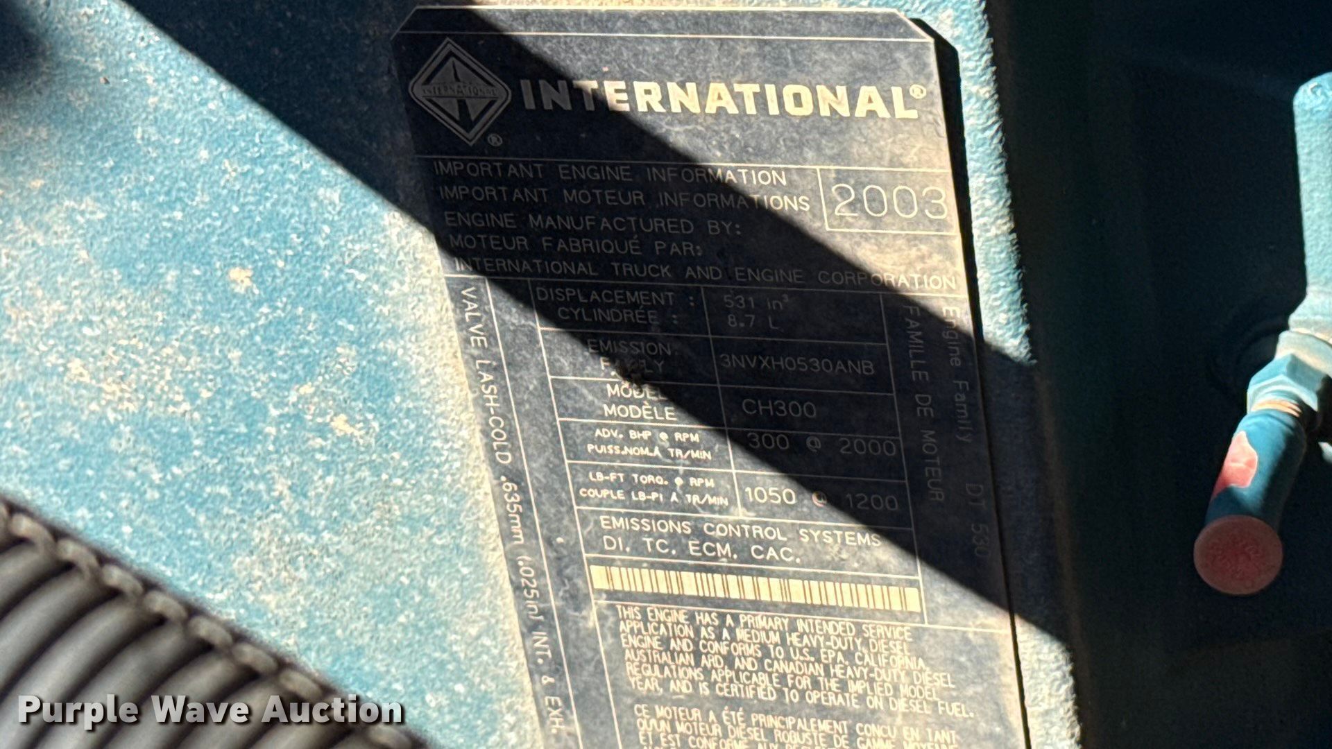 2003 International 7400 dump truck. Miles: 49,796 on odometer, Hours: 4,713 on meter, VIN: 1HTWGADR13J078650, Unit #: 0468. Engine International CH300, Displacement: 8.7L, Cylinders: 6, Fuel type: Diesel, HP: 300. Transmission Allison, Automatic. Chassis Axles: Tandem, Differential lock: Inter-axle, Suspension: Spring over walking beam, Brakes: Air, PTO, GVWR: 52,350 lbs FAWR: 12,350 lbs, IAWR: 20,000 lbs, RAWR: 20,000 lbs, Wheelbase: 175". Interior AC, Heat, Heated mirrors, Cruise control. Features Bed Dump bed, Ox Bodies 14FT, Serial: 503378AR, Length: 14', Width: 96", Capacity: 15 cu.yd., Side height: 57", Bed type: Steel, Bed vibrator, Roll tarp, Ram: Single, End gate: Air operated. Tires Size: 11R22.5. Notes Dash warning indicator: Check engine, Jump start required during on-site data collection, Acceleration issues. Oklahoma title. Title distribution may be delayed up to 30 days from verification of funds. City Of Norman. Norman, OK 73069