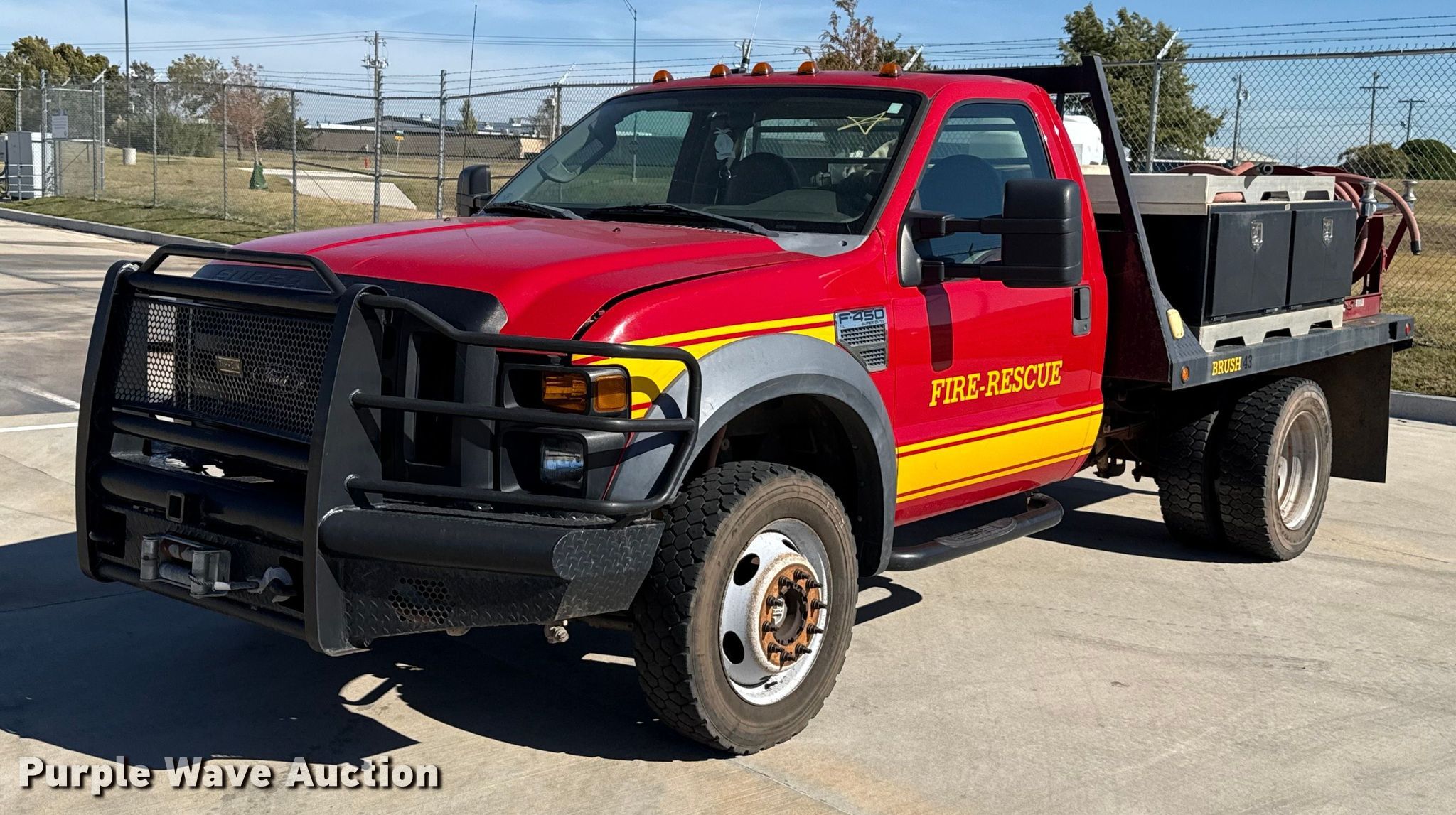 2009 Ford F450 flatbed truck. Miles: 86,580 on odometer, VIN: 1FDAF47Y89EB12529, Unit #: 43. Engine Displacement: 6.8L, Cylinders: 10, Fuel type: Gas. Transmission Automatic. Chassis Four wheel drive, Axles: Single, Suspension: Spring, Brakes: Hydraulic, GVWR: 16,500 lbs, Wheelbase: 141". Interior AC, Heat, Cruise control, Auxiliary controls. Features Bed Flatbed, Length: 9', Width: 96", Tank, (2) hose reels. Tires Size: 225/70R19.5. Notes Windshield chipped or cracked, Jump start required during on-site data collection, Unknown operating condition of 2 cylinder gasoline engine. Oklahoma title. Title distribution may be delayed up to 30 days from verification of funds. City Of Norman. Norman, OK 73069