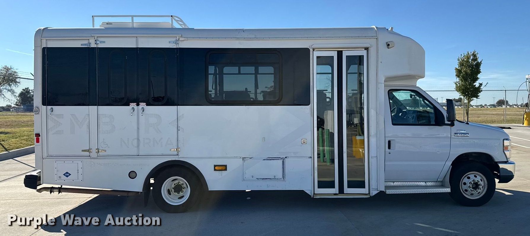 2014 Ford E450 Super Duty shuttle bus. Miles: 192,577 on odometer, Hours: 8,514 on meter, VIN: 1FDXE4FS3EDB10276, Unit #: 1475. Engine Displacement: 6.8L, Cylinders: 10, Fuel type: CNG. Transmission Automatic. Chassis Axles: Single, Suspension: Spring, Brakes: Hydraulic, GVWR: 14,500 lbs, Wheelbase: 158". Interior AC, Heat, Cruise control, Backup camera, Passengers: 14, Wheelchair lift. Tires Size: LT225/75R16. Notes Dash warning indicator: Check engine. Oklahoma title. Title distribution may be delayed up to 30 days from verification of funds. City Of Norman. Norman, OK 73069
