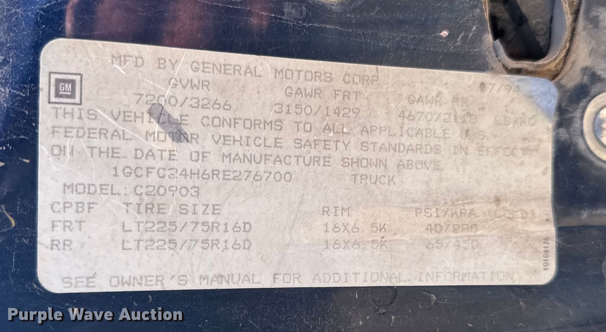 1994 Chevrolet C2500 pickup truck. Miles: 106,079 on odometer, VIN: 1GCFC24H6RE276700. Engine Displacement: 5.0L, Cylinders: 8, Fuel type: Gas. Transmission Automatic. Interior AC, Heat. Tires Size: 225/75R16. Notes Jump start required during on-site data collection. Kansas title. Title distribution may be delayed up to 14 days from verification of funds. Norton, KS 67654