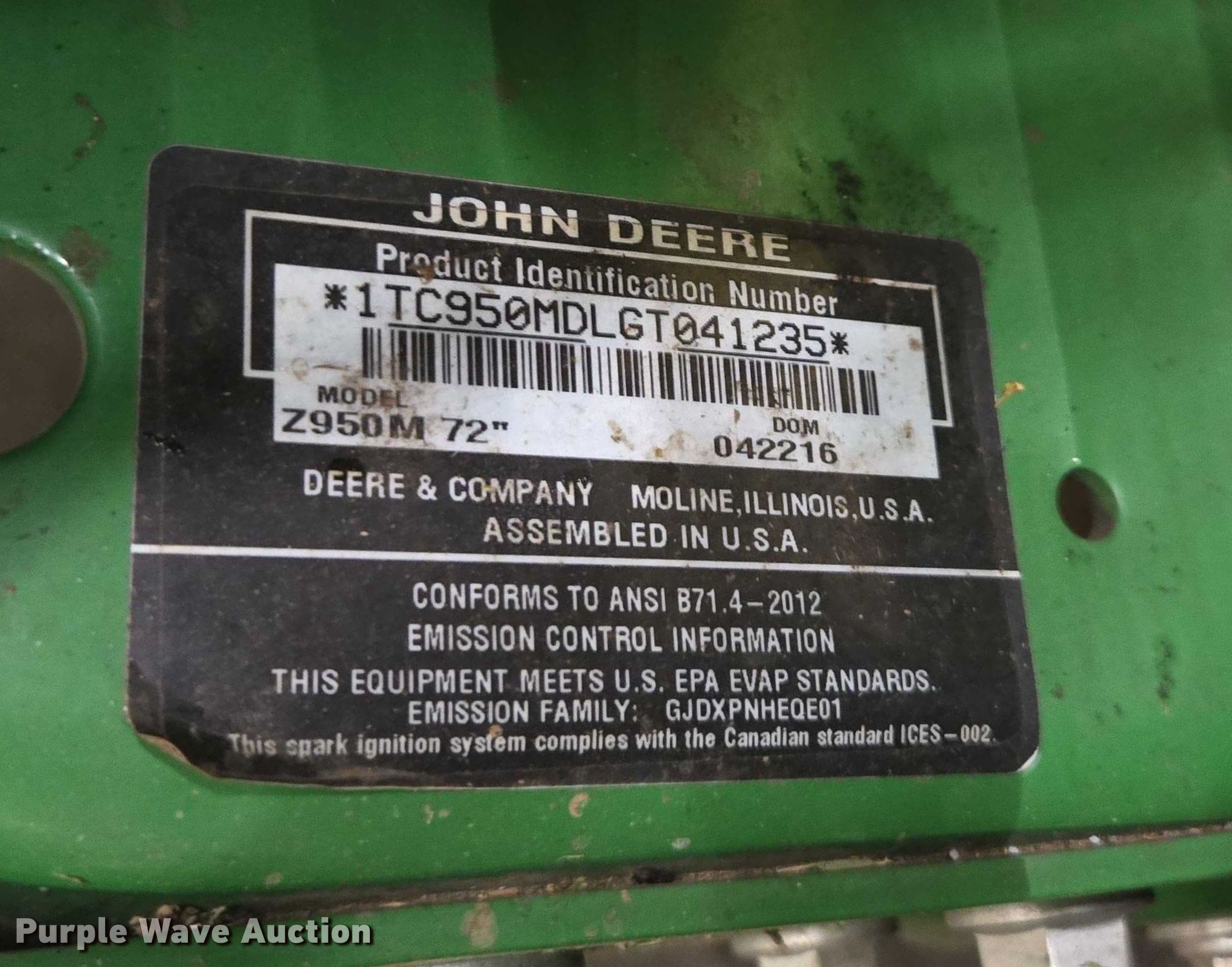 Purple Wave is selling a used Commercial Turf Mower in Kansas. This item is a John Deere Z950M ZTR lawn mower with the following: Hours: 1,453 on meter, Cutting width: 72", Serial: 1TC950MDLGT041235