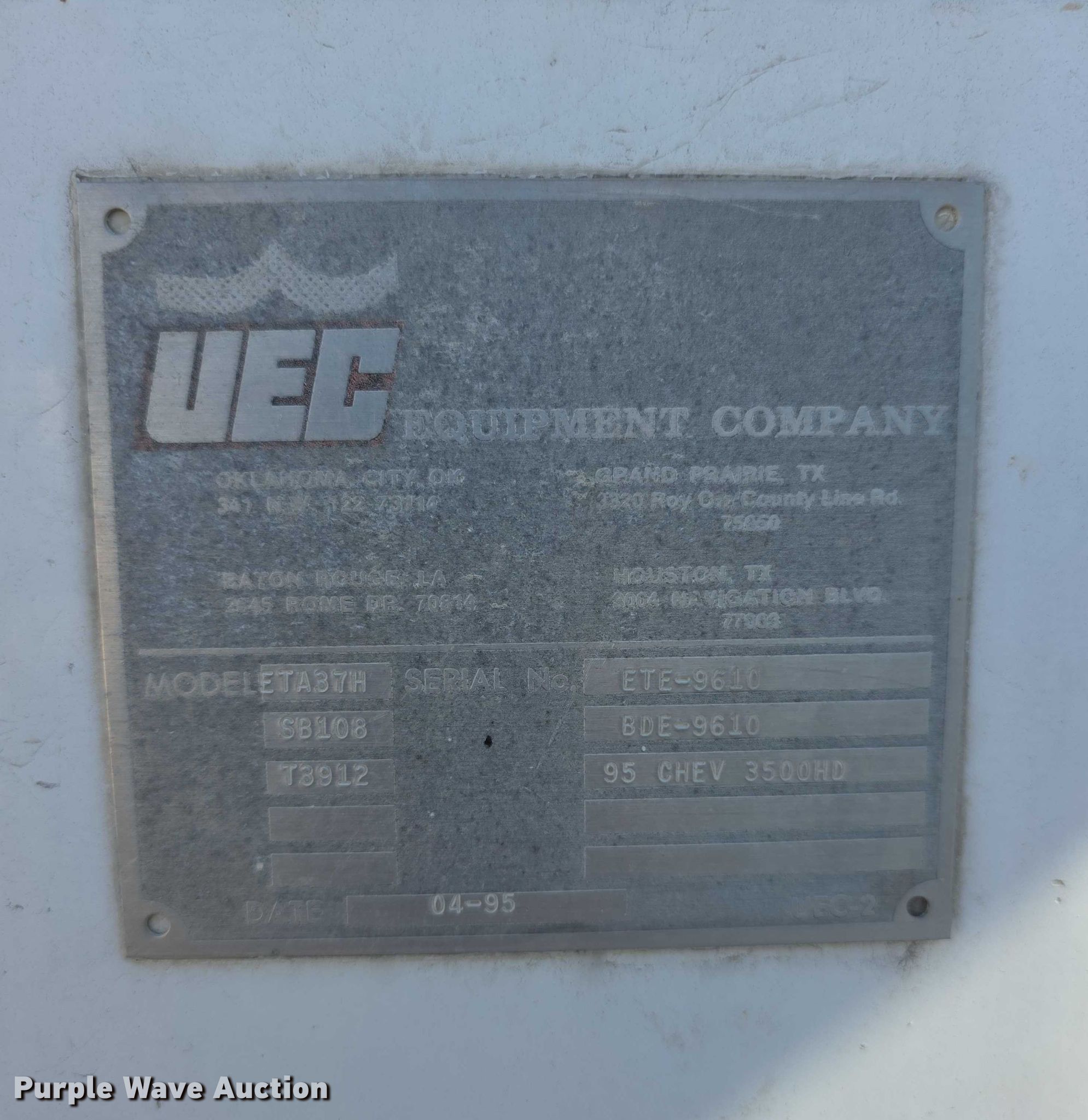 1995 Chevrolet C3500 bucket truck. Miles: 55,475 on odometer, Hours: 5,223 on meter, VIN: 1GBKC34F6SJ107412. Engine Displacement: 6.5L, Cylinders: 8, Fuel type: Diesel. Transmission Manual, Speed: 5. Chassis Axles: Single, Suspension: Spring, Brakes: Hydraulic, PTO, GVWR: 15,000 lbs, Wheelbase: 134". Interior AC, Heat. Features Bed Utility bed, UEC ETA37H, Serial: ETE9610, Length: 9', Width: 7' 5", Height: 40", Boom 1995 ETI ETA37H, Serial: 495A7166, Boom length: 37', Maximum lift capacity: 300 lbs, Man basket, Boom controls Platform/ basket.. Tires Size: 225/70R19.5, Brand: Bridgestone. Notes Dash warning indicator: service throttle soon, Jump start required during on-site data collection, Bucket removed but included, Boom issues. Kansas title. Title distribution may be delayed up to 14 days from verification of funds. City Manager of Herington. Herington, KS 67449