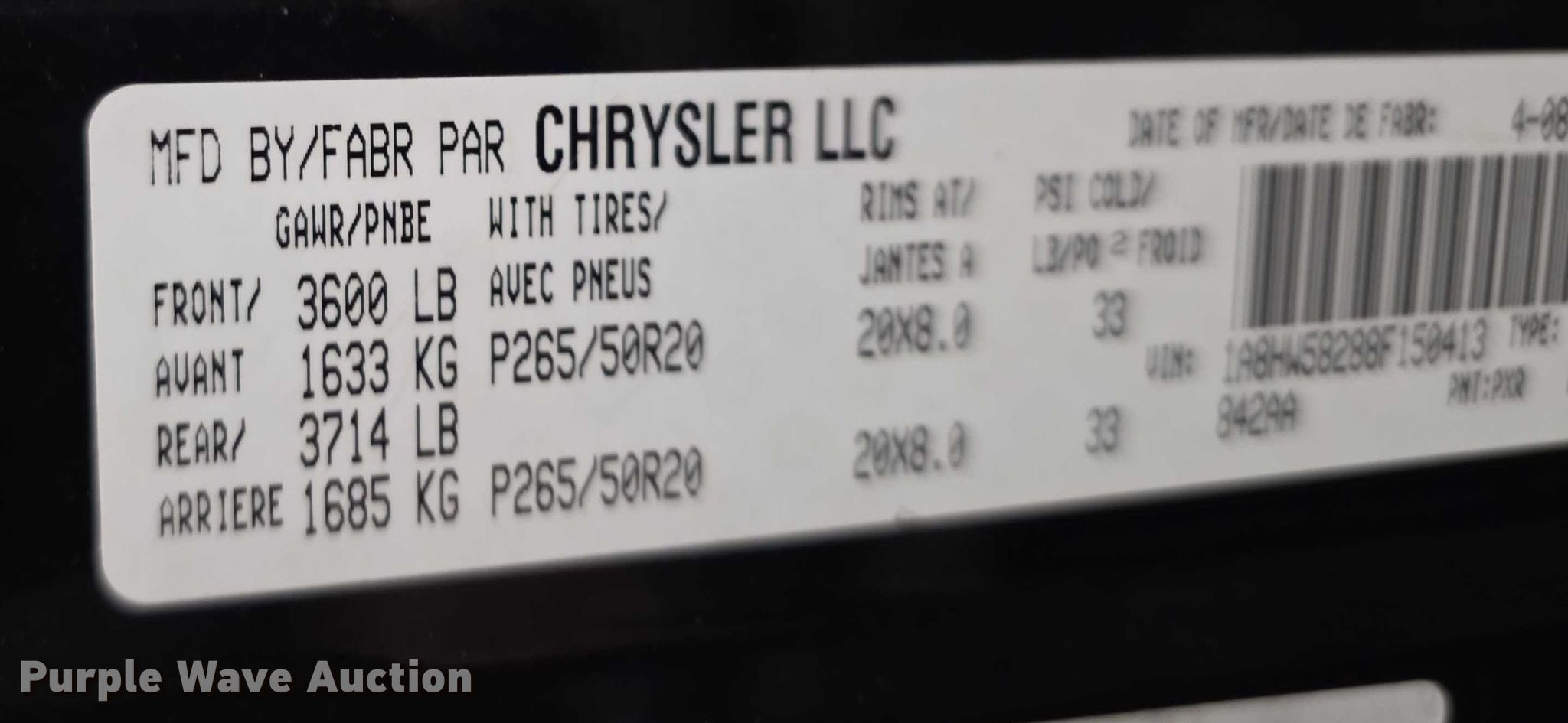 2008 Chrysler Aspen Limited SUV. Miles: 195,571 on odometer, VIN: 1A8HW58288F150413. Engine Displacement: 5.7L, Cylinders: 8, Fuel type: Gas. Transmission Automatic, Four wheel drive. Interior AC, Heat, Seat: Heated, Power driver, Power passenger, Heated mirrors, Power windows, Power locks, Cruise control, Backup camera, Powered sunroof. Tires Size: 275/45R20. Notes Dash warning indicator: Check engine, TPMS, Jump start required during on-site data collection. Title history is unknown. Seized vehicle. Condition and history are unknown. No additional information is available. Kansas title. Seller is a government entity who will be assigning and distributing the title. Please contact the seller for distribution questions. Kansas Highway Patrol. Topeka, KS 66618