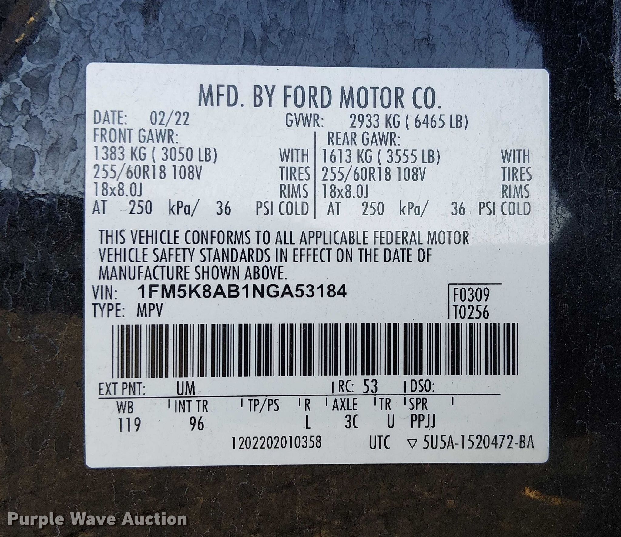 - VIN: 1FM5K8AB1NGA53184