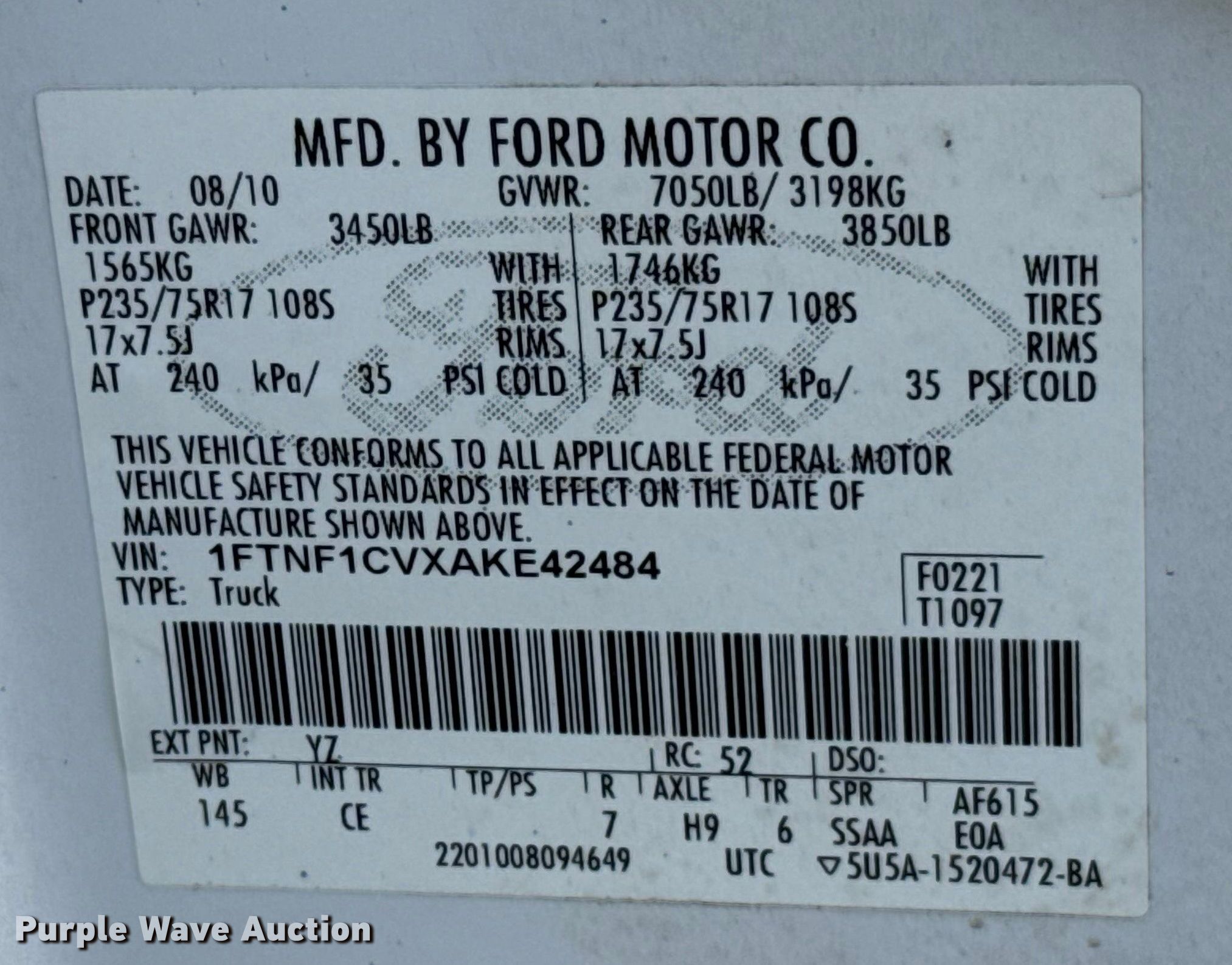 Purple Wave is selling a used 1/2 Ton Pickup or Van in Oklahoma. This item is a 2010 Ford F150 pickup truck with the following: Miles: 218,339 on odometer, VIN: 1FTNF1CVXAKE42484