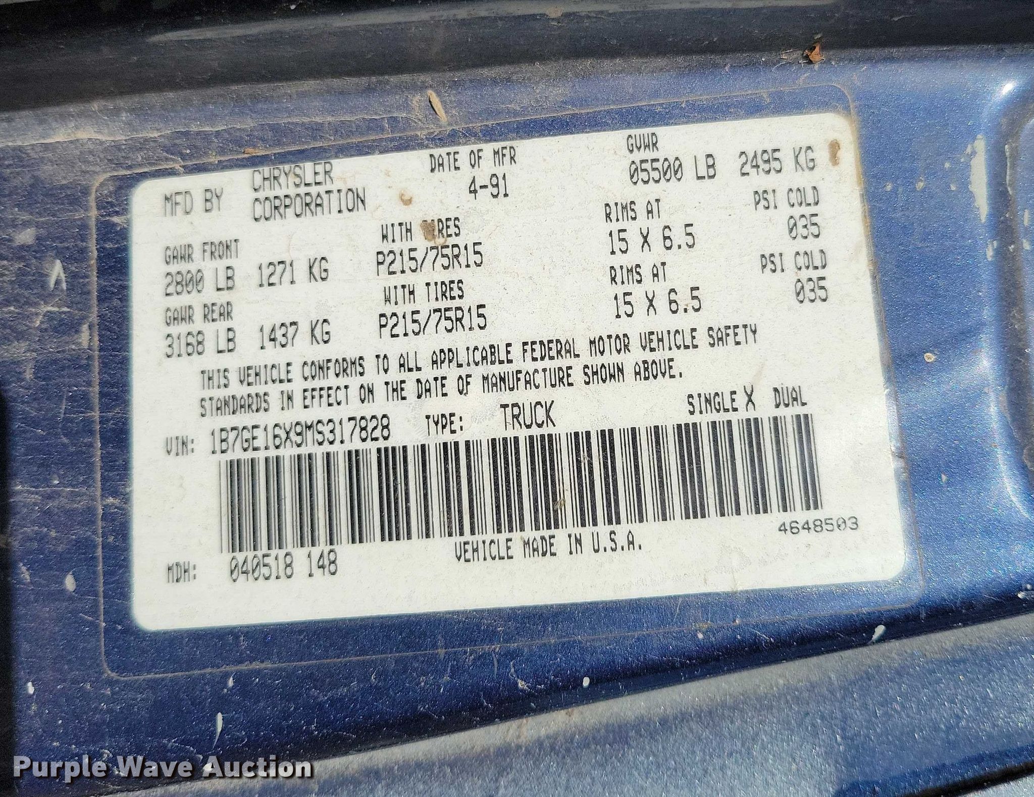 Purple Wave is selling a used 1/2 Ton Pickup or Van in Iowa. This item is a 1991 Dodge D150 pickup truck with the following: Miles: 39,523 on odometer, VIN: 1B7GE16X9MS317828