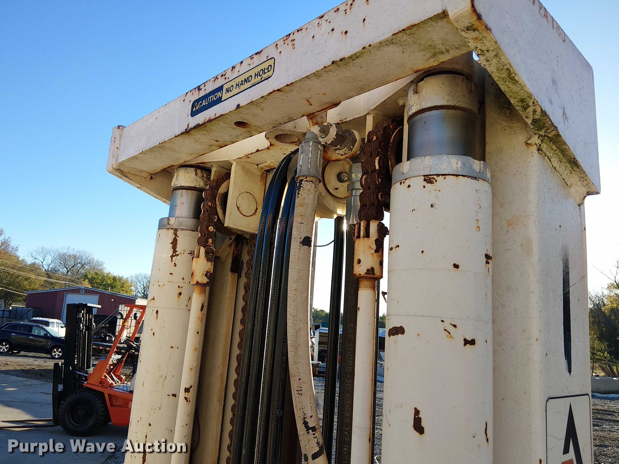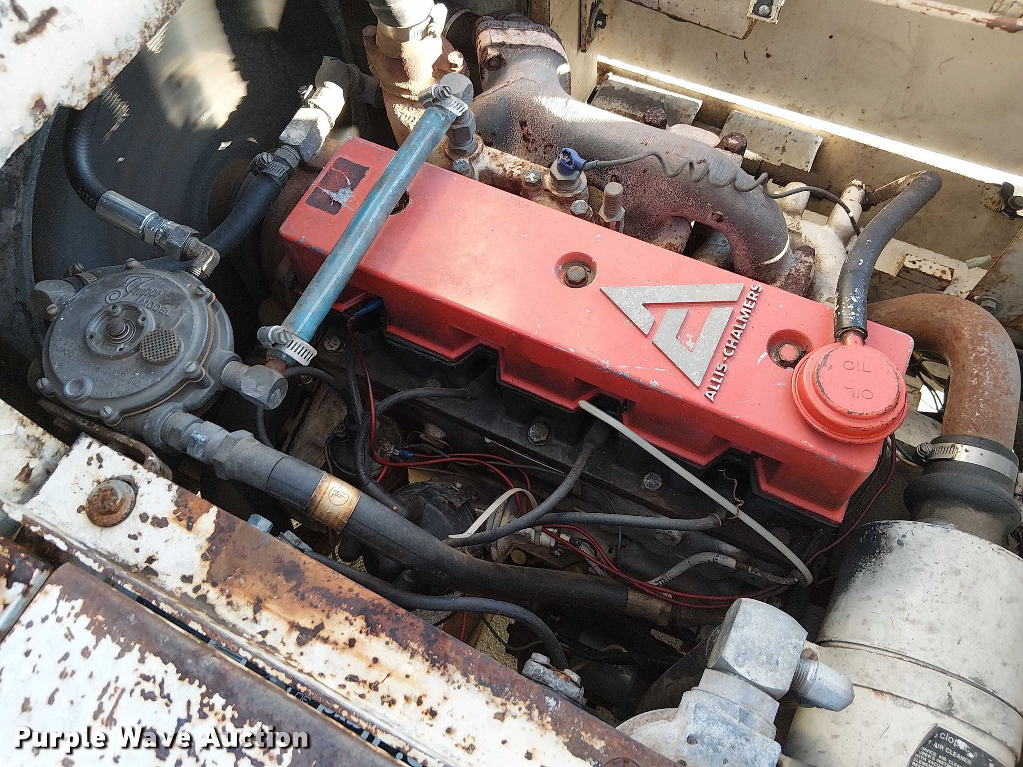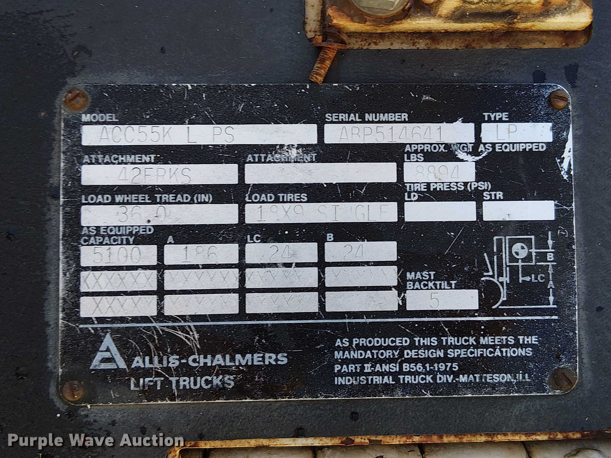 Allis Chalmers ACC55K L PS forklift. Hours: 8,444 on meter, Serial: AVP514641. Engine Allis Chalmers, Cylinders: 4, Fuel type: LPG LP bottle: Not included. Transmission Powershift. Operators station OROPS, Canopy. Features Maximum lift capacity: 5,100 lbs, Maximum lift height: 186", Collapsed mast height: 83", Mast stages: 3, Mast tilt, Fork length: 42". Tires Solid. Notes Right rear tire damaged. Tonganoxie, KS 66086