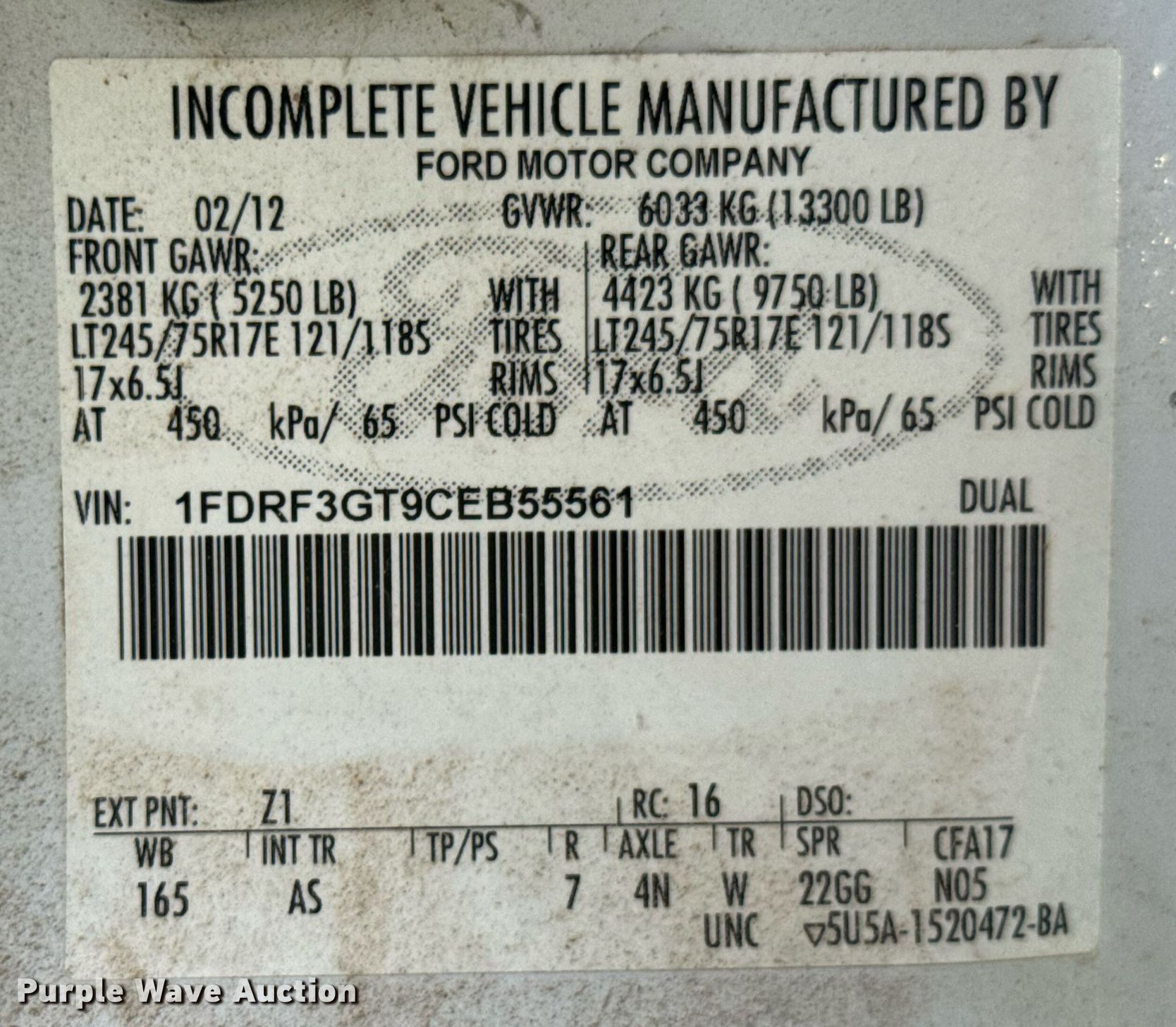 2012 Ford F350 Super Duty utility bed pickup truck. Miles: Unknown, VIN: 1FDRF3GT9CEB55561. Engine No engine. Transmission No transmission. Interior AC, Heat, Cruise control, Auxiliary controls, Brake controller. Features Utility bed 132" L x 96" W. Tires Size: LT245/75R17. Notes Parts only, Parts may be missing, No transmission , No engine , Unit must be towed or hauled , Non-operational unit. Oklahoma title. Mileage has not been verified. Exempt will be written in the odometer disclosure on the title. Title distribution may be delayed up to 14 days from verification of funds. Adair, OK 74330