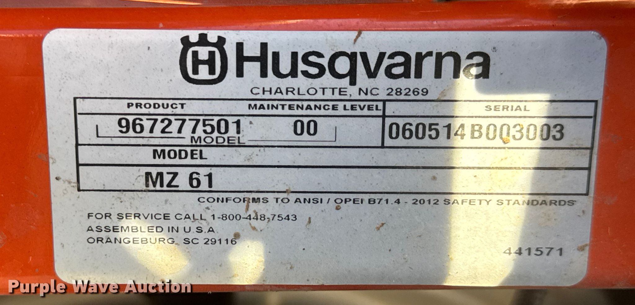 Purple Wave is selling a used Commercial Turf Mower in Kansas. This item is a 2006 Husqvarna MZ 61 ZTR lawn mower with the following: Hours: Unknown, Cutting width: 61", Serial: 060514B003003