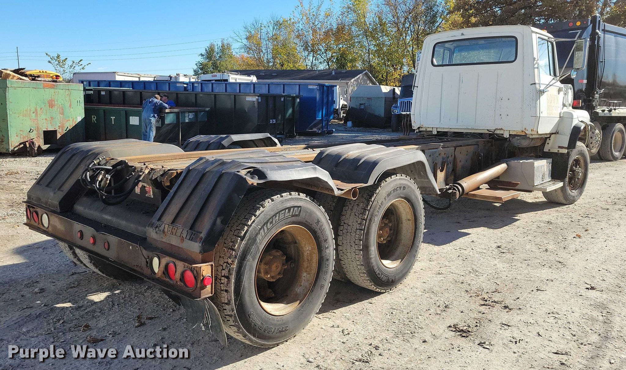 1988 Ford L8000 truck cab and chassis. Miles: 325,336 on odometer, VIN: 1FDYY82A1JVA44444. Engine Displacement: 7.8L, Cylinders: 6, Fuel type: Diesel. Transmission Eaton Fuller, Manual. Chassis Axles: Tandem, Suspension: Spring over walking beam, Brakes: Air, PTO, Wet kit, Truck chassis: 18', GVWR: 54,000 lbs. Interior Heat. Tires Front: 385/65R22.5, Rear: 275/80R22.5. Notes Bed removed, Tire needs replaced. Iowa title. Title distribution may be delayed up to 14 days from verification of funds. Wiegert Disposal Inc.. Martensdale, IA 50160