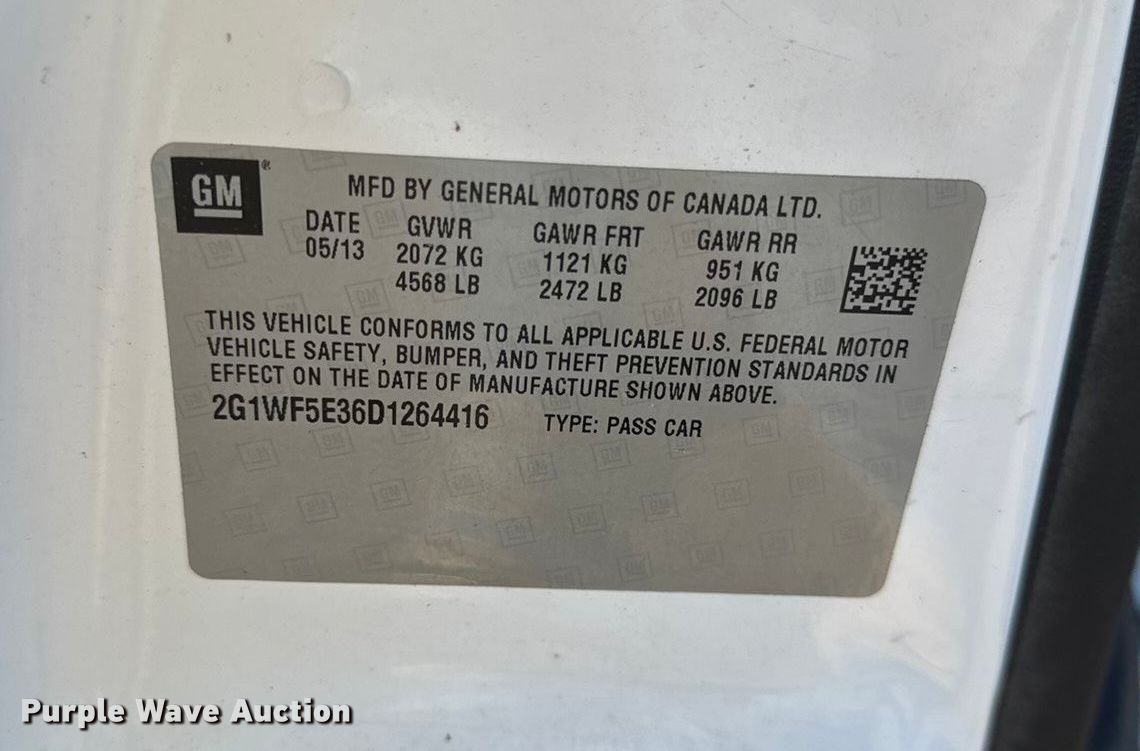 2013 Chevrolet Impala. Miles: 195,883 on odometer, VIN: 2G1WF5E36D1264416, Unit #: CR95. Engine Displacement: 3.6L, Cylinders: 6, Fuel type: Gas. Transmission Automatic. Interior AC, Heat, Power windows, Power locks, Cruise control. Tires Size: 225/60R16. Notes Dash warning indicator: TPMS, Traction control, Exhaust issues, noise. Kansas title. Title distribution may be delayed up to 14 days from verification of funds. Dustrol Inc... Towanda, KS 67144