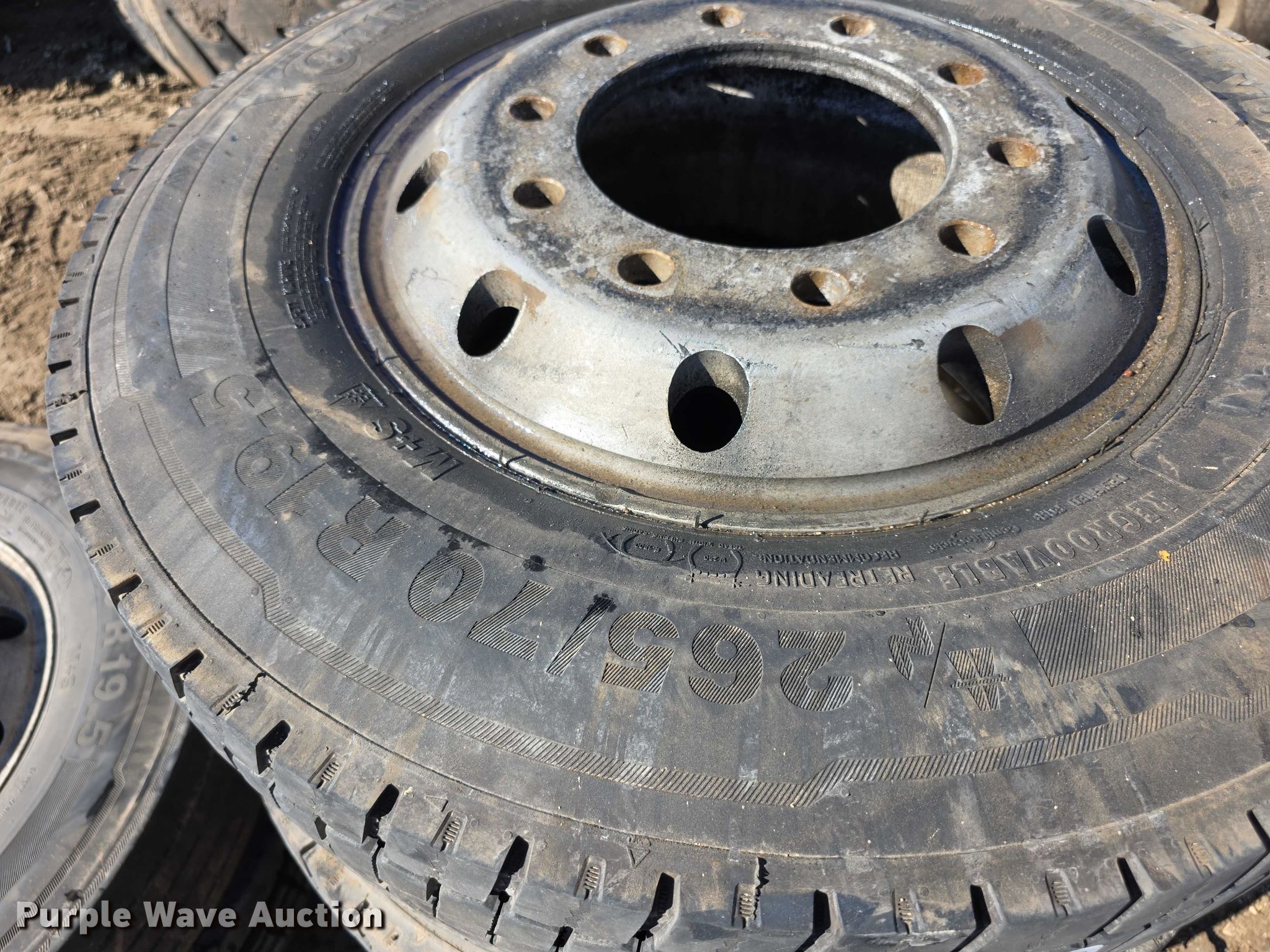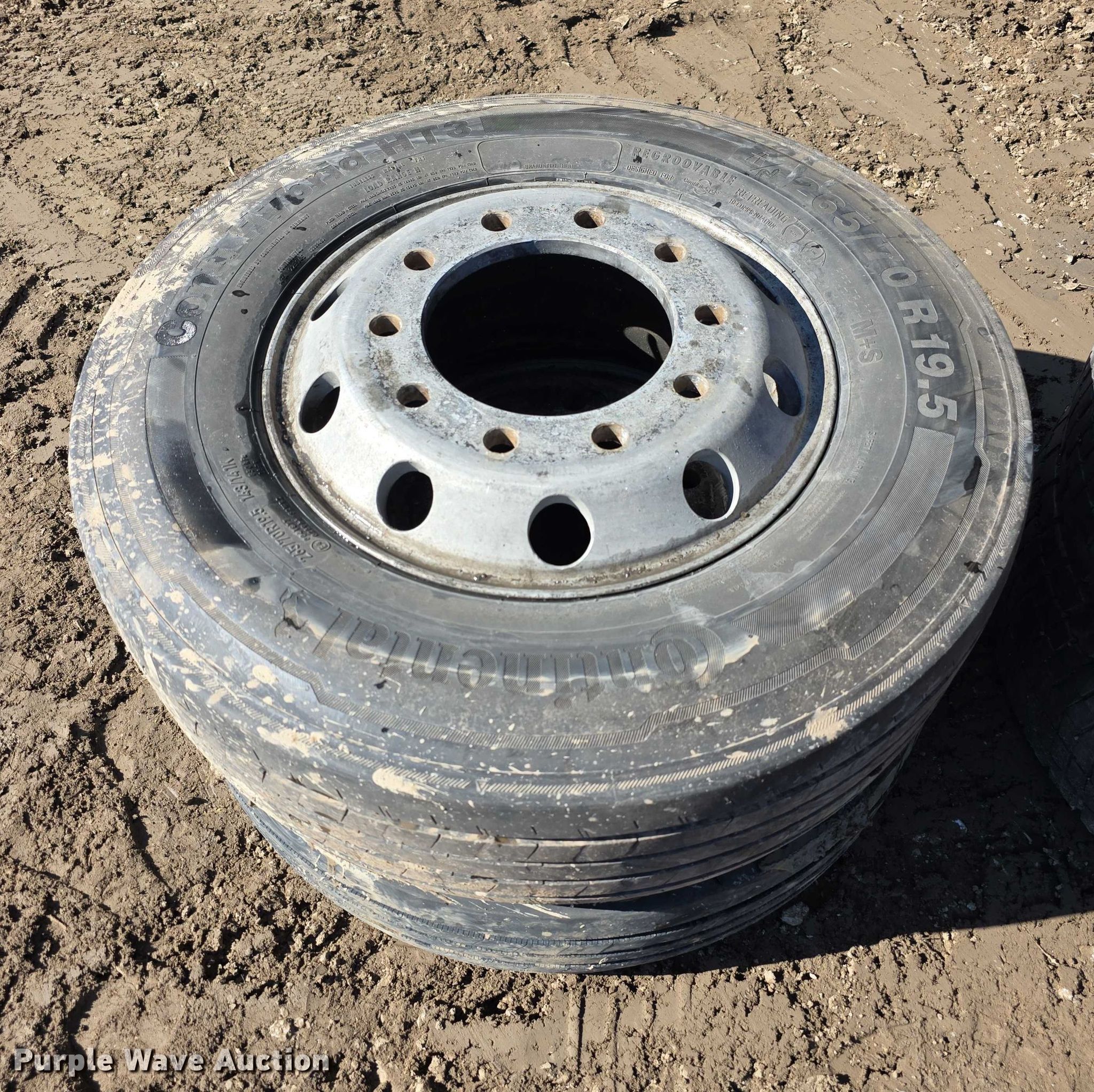Purple Wave is selling a used Fleet Tires in Kansas. This item is a (6) Continental 265/70R19.5 tires and wheels with the following: (6) Continental 265/70R19.5 tires and wheels. Wamego Recycling. Wamego, KS 66547