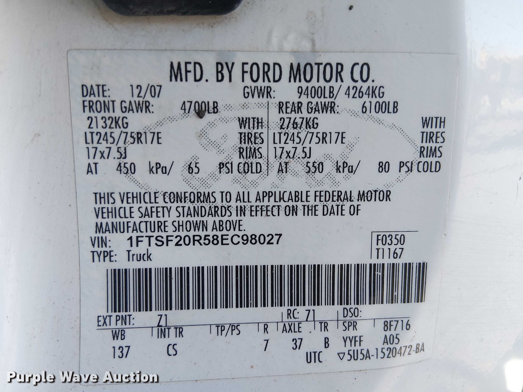 - VIN: 1FTSF20R58EC98027