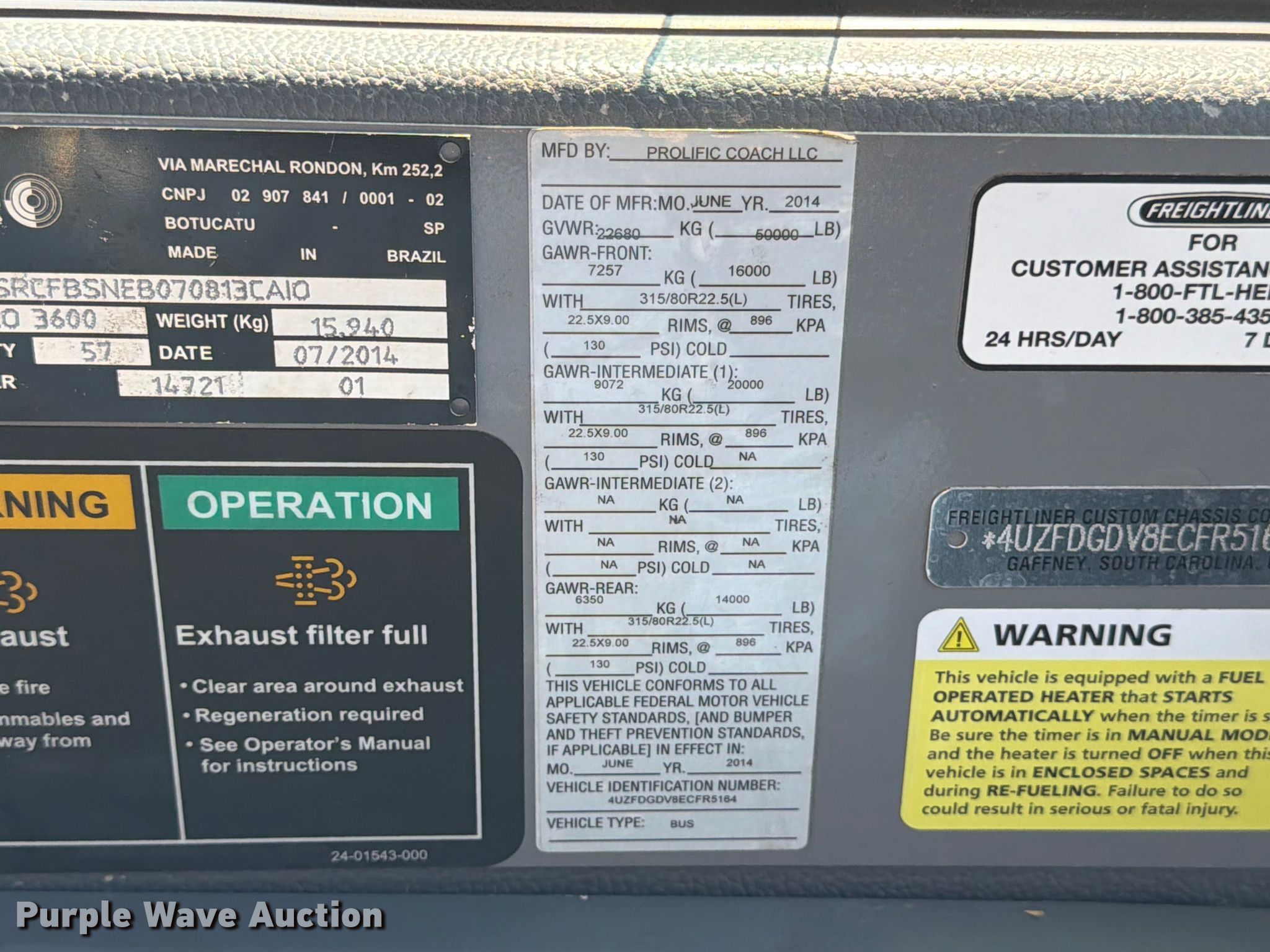 Purple Wave is selling a used Bus in Texas. This item is a 2014 Freightliner Giro 3600 coach bus with the following: Miles: 58,200 on odometer, VIN: 4UZFDGDV8ECFR5164