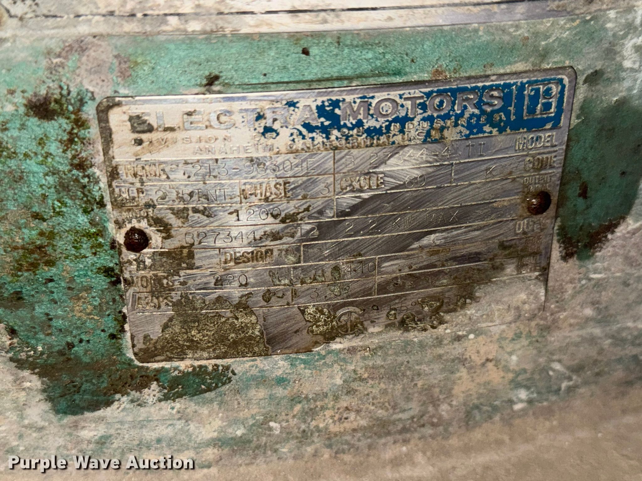 2006 CE X6323A milling machine. Serial: 065559. Electric Motor Weihai Huadong AEVF112-4 Serial: 2007 01, HP: 3, Volts: 440/220, Phase: Three. Features Sweco Vibro-Energy FM-10-7 deburring/finishing mill Electra Motors electric motor, Phase: Three. Notes Bearing seized, Unknown operating condition. Fab Works LLC. Inman, KS 67546