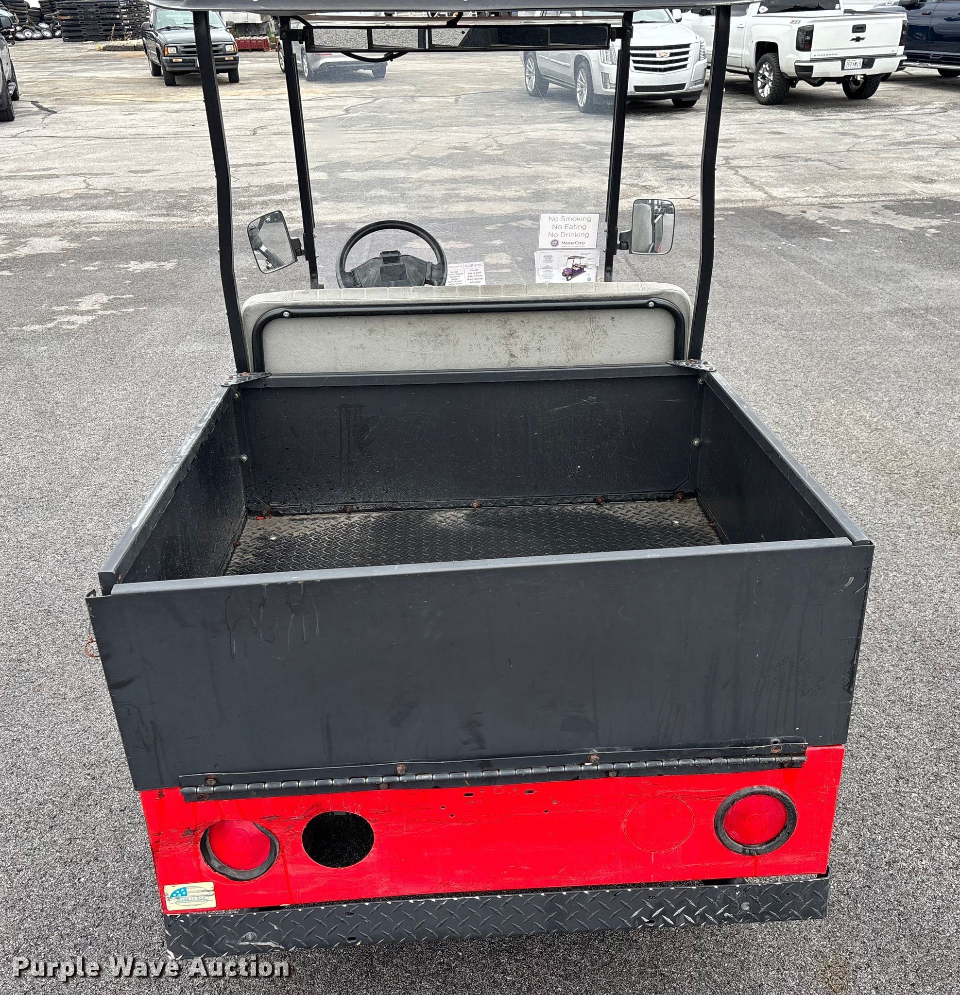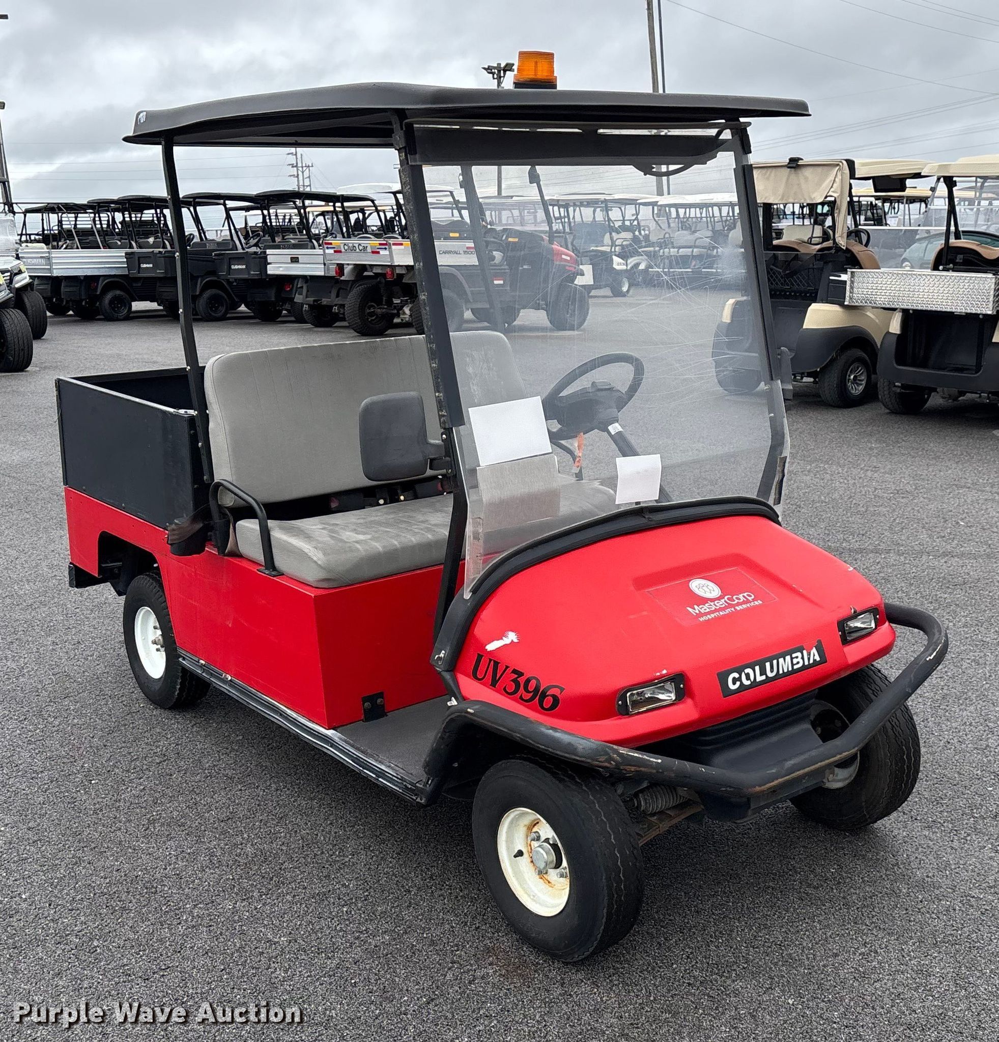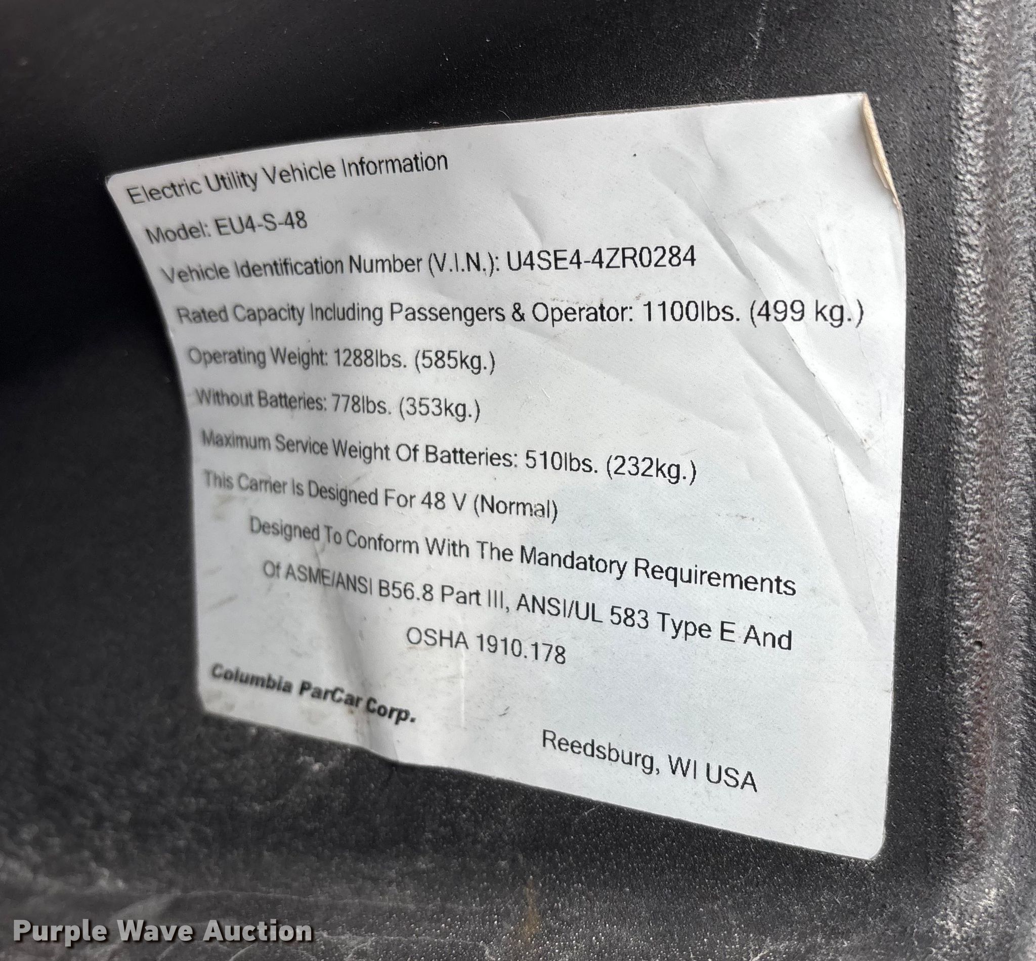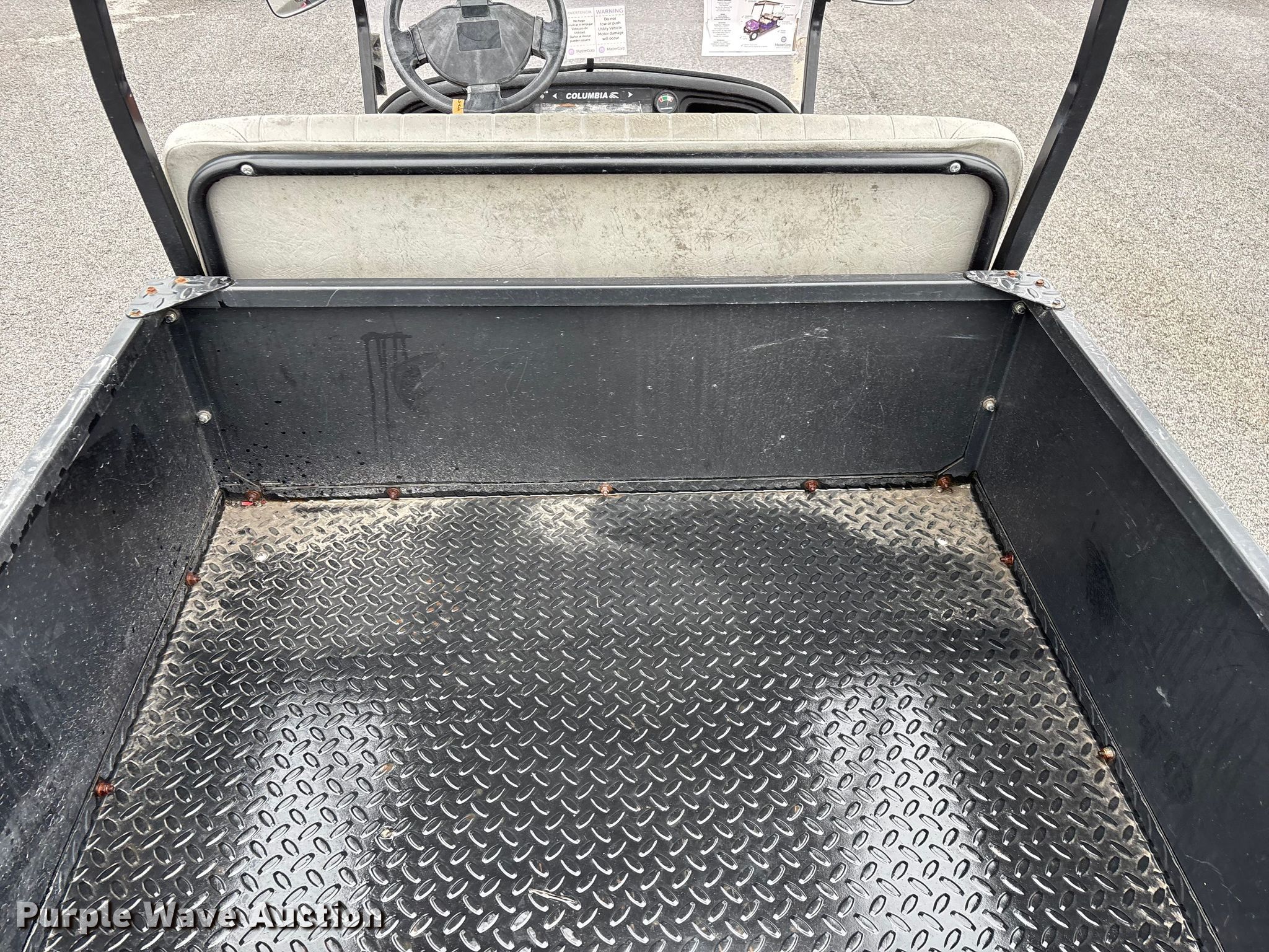 Columbia EU4-S-48 golf cart. VIN: U4SE4-4ZR0284, Unit #: UV396. Electric Motor Volts: 48, Charger: Single phase. Transmission Automatic. Operators station Canopy. Features Box bed 37" L x 43" W, Built in charger. Tires Size: 5.70-8. Notes Tailgate hinge issues, Headlight damage, Taillight damage. Transfer of ownership documentation will be a bill of sale. Clear Creek Golf Car & Utility Vehicles, LLC. Ozark, MO 65721