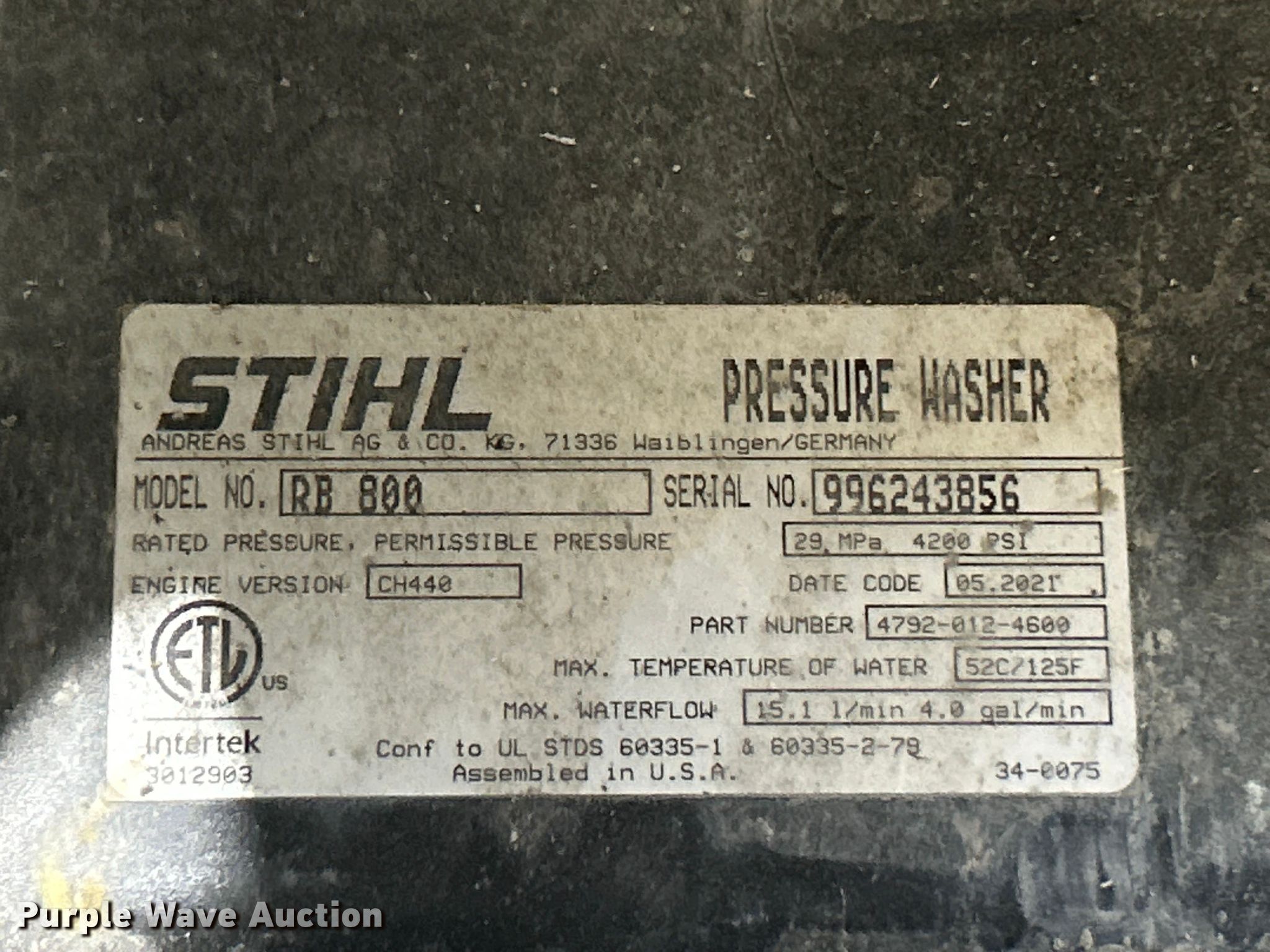 Purple Wave is selling a used Pressure Washer in Illinois. This item is a Stihl RB 800 pressure washer with the following: Serial: 996243856