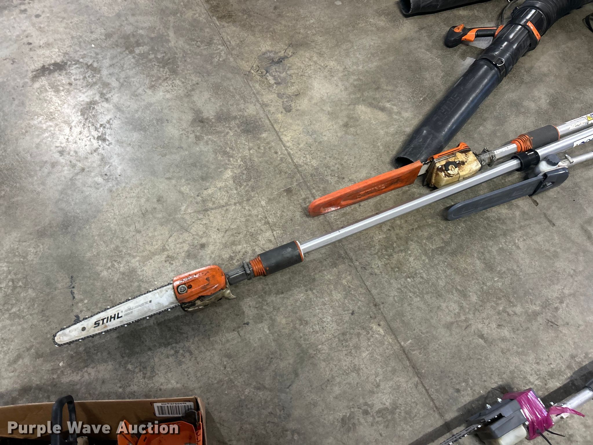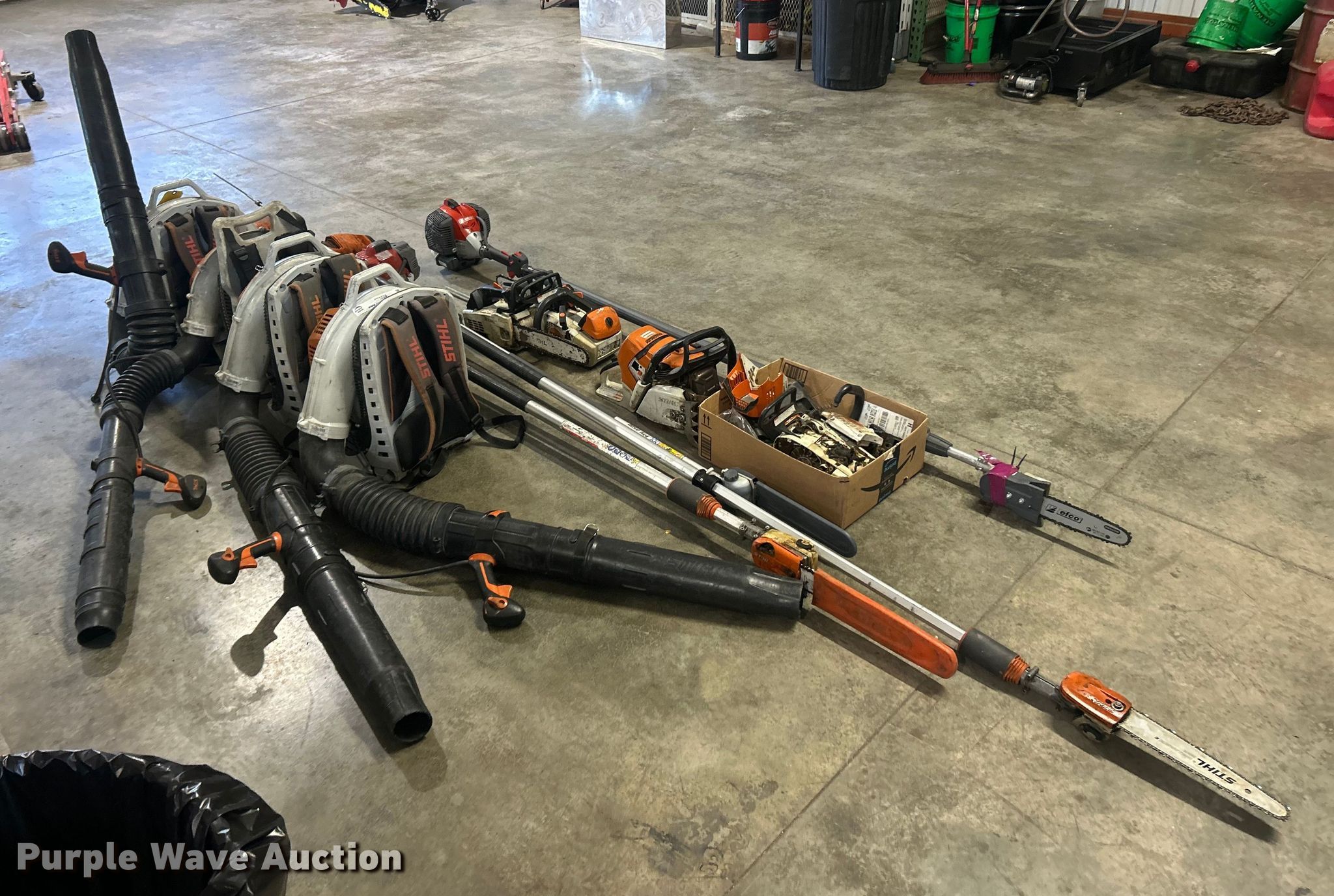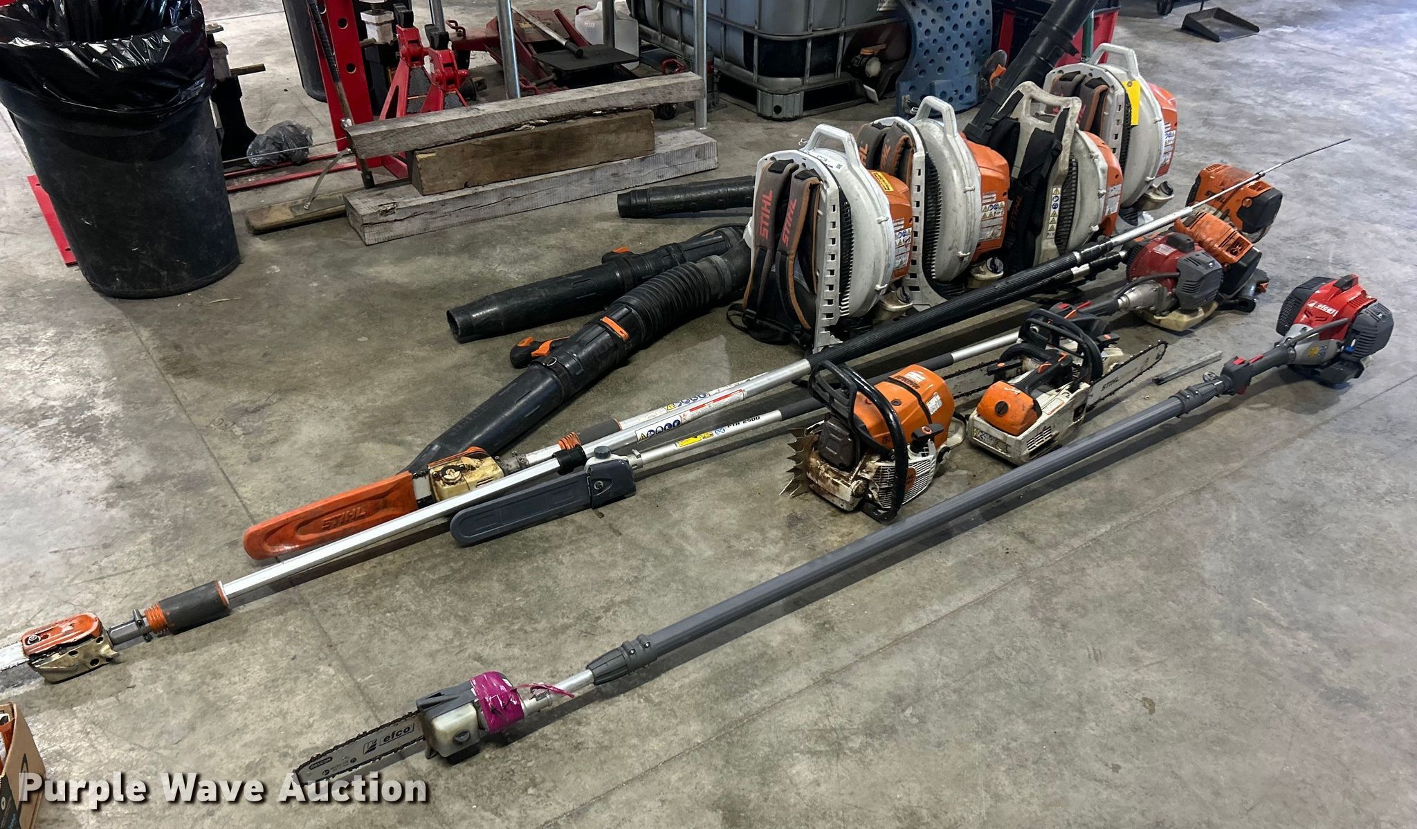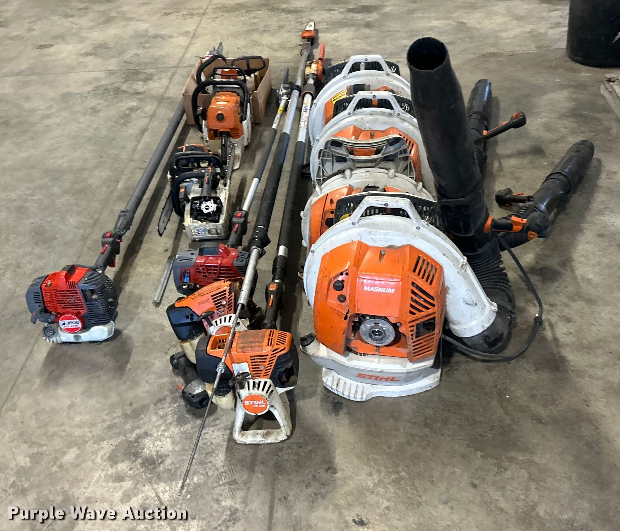 Purple Wave is selling a used Lawn and Garden in Illinois. This item is a Lawn and garden equipment with the following: (4) Stihl Magnum BR800X leaf blowers, One recoil start cord missing, (4) pole saws, Stihl HT 135, Stihl HT 133, Non-operational, Engine separated from pole, Efco PTH 2500, Efco PTX 2710, (2) Stihl MS 201TC chainsaws and more
