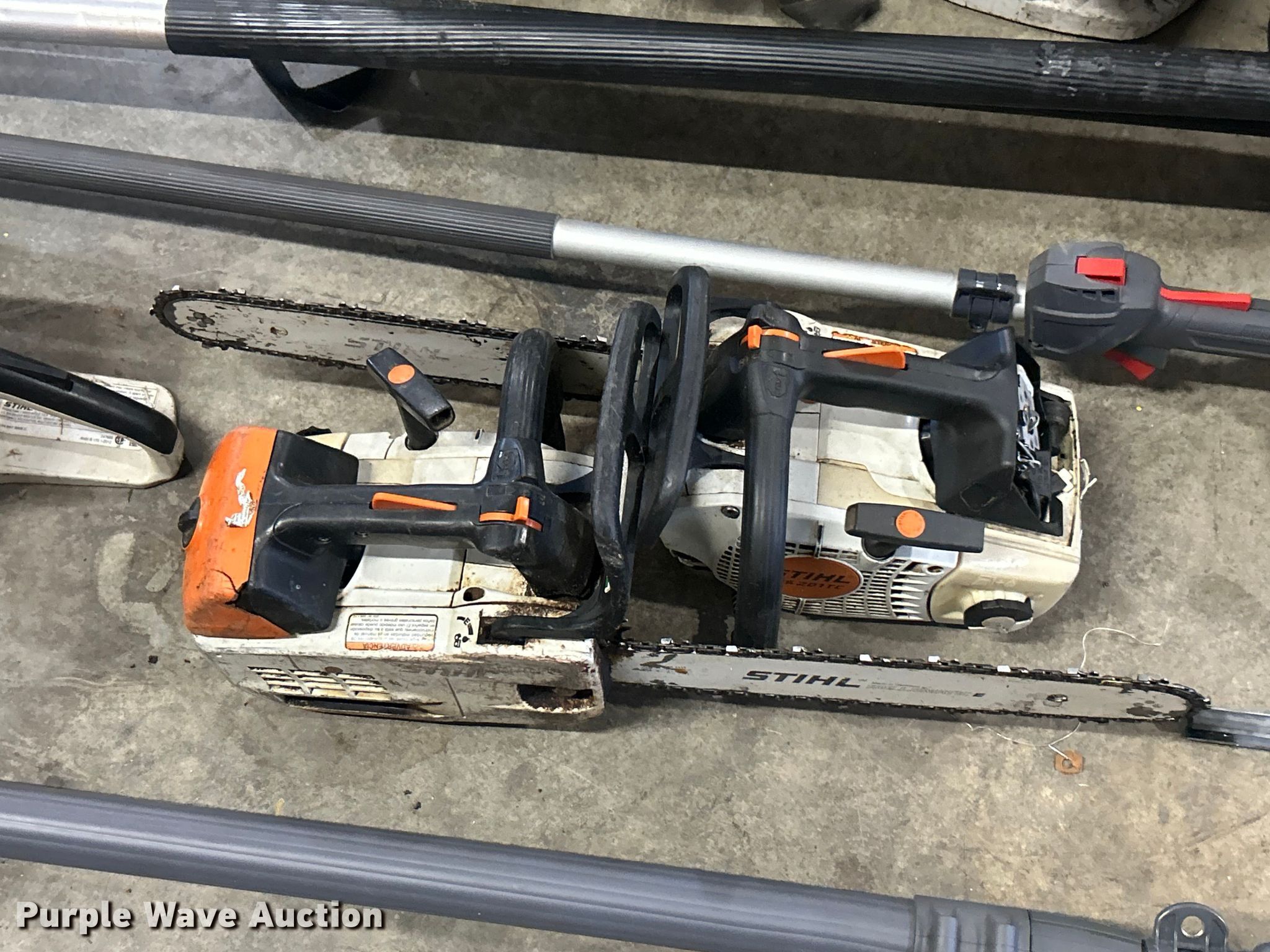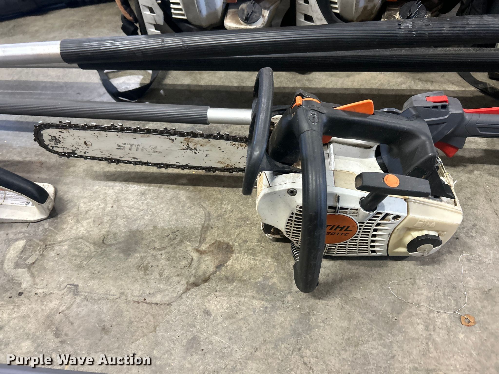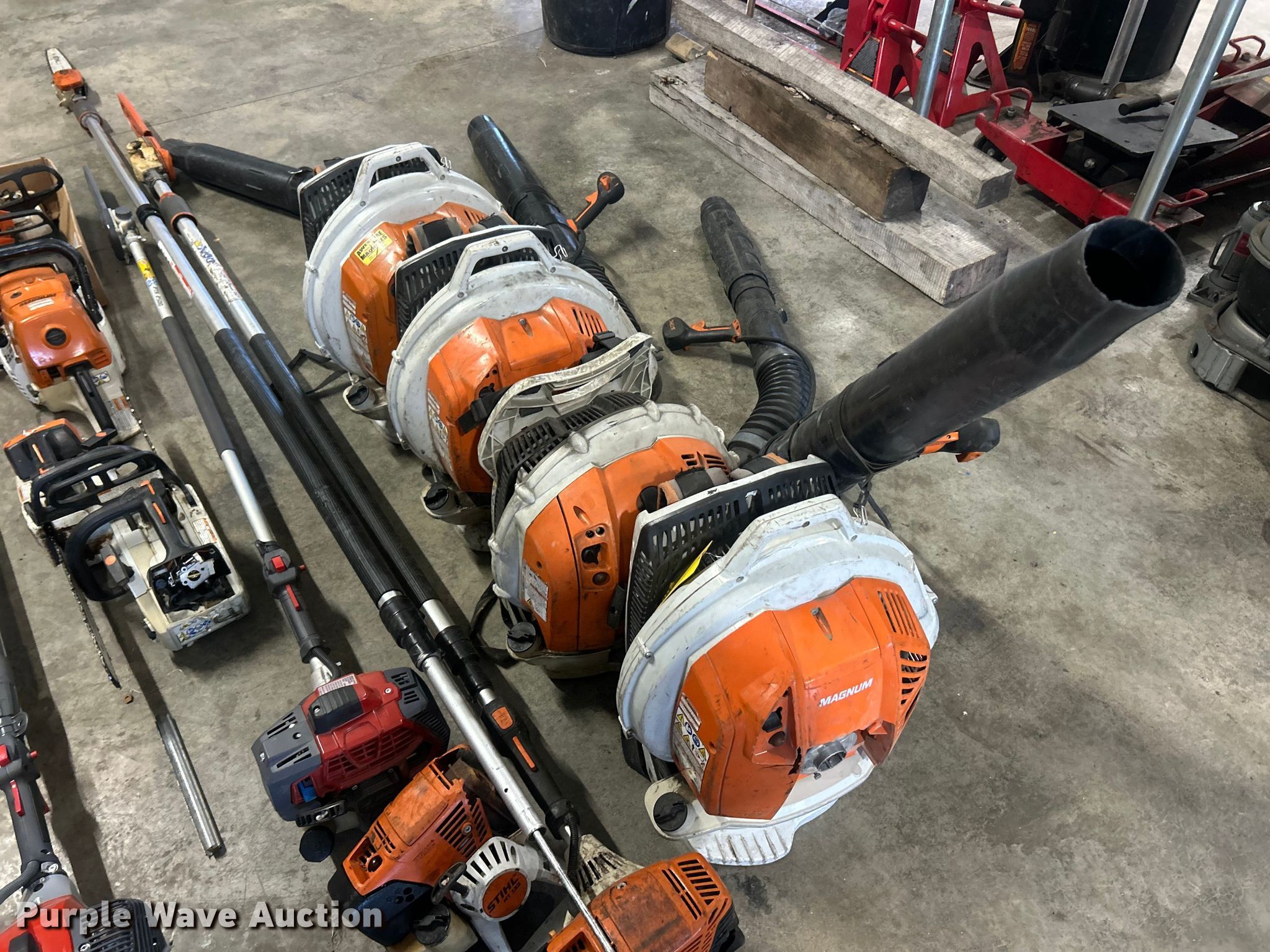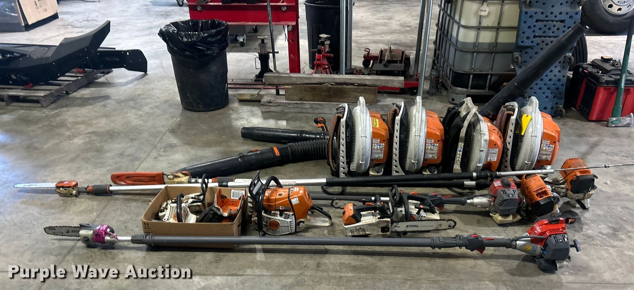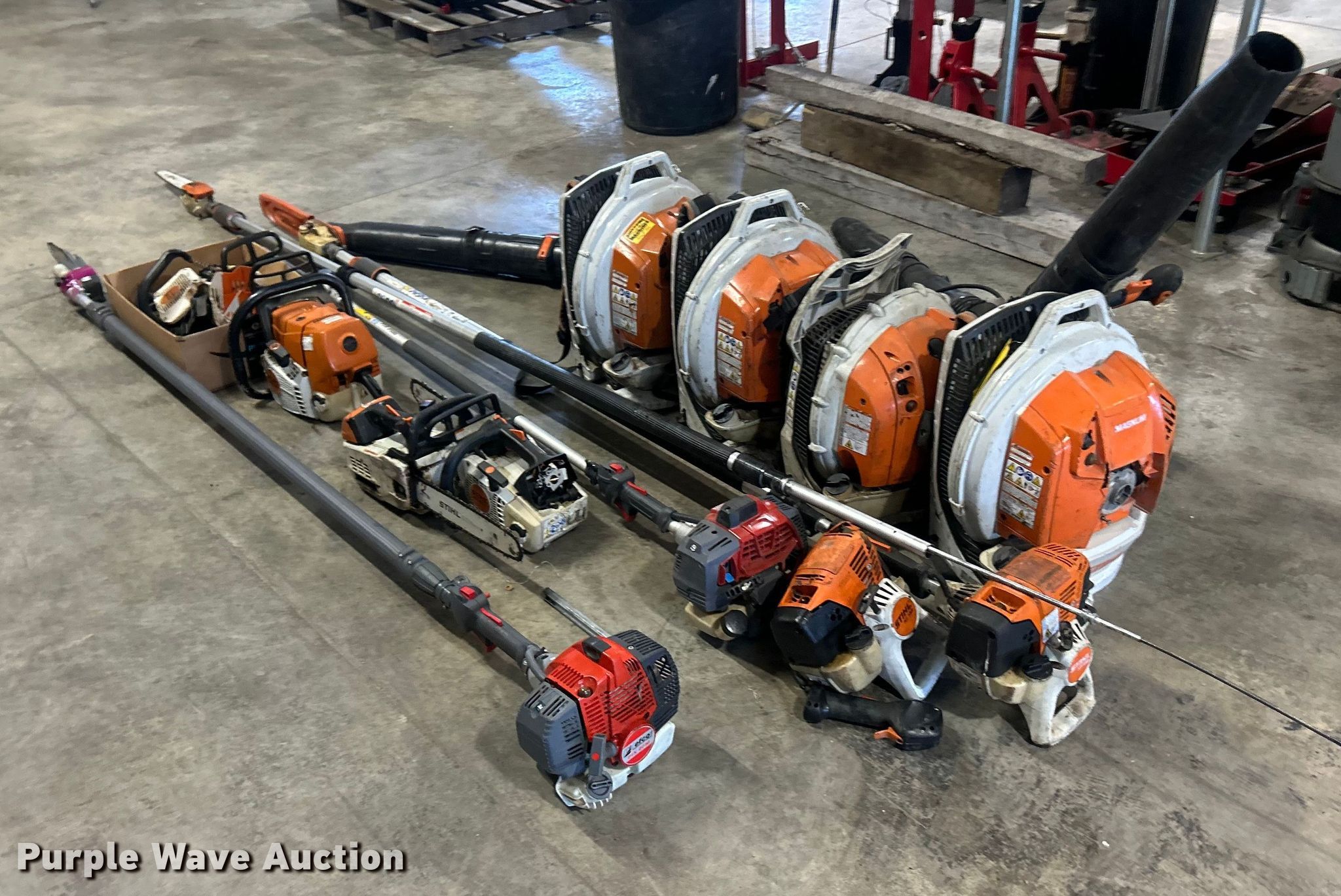 Purple Wave is selling a used Lawn and Garden in Illinois. This item is a Lawn and garden equipment with the following: (4) Stihl Magnum BR800X leaf blowers, One recoil start cord missing, (4) pole saws, Stihl HT 135, Stihl HT 133, Non-operational, Engine separated from pole, Efco PTH 2500, Efco PTX 2710, (2) Stihl MS 201TC chainsaws and more