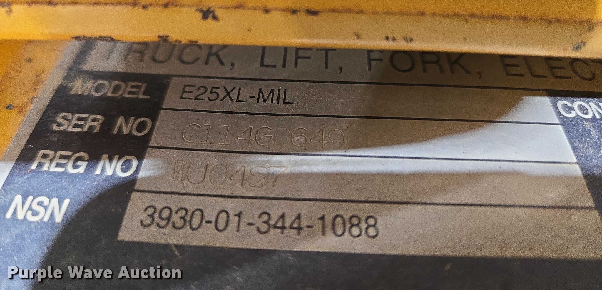 Purple Wave is selling a used Warehouse Forklift in Oklahoma. This item is a 2016 Hyster E25XL-MIL forklift with the following: Hours: 5,326 on meter, Serial: C114G06490P