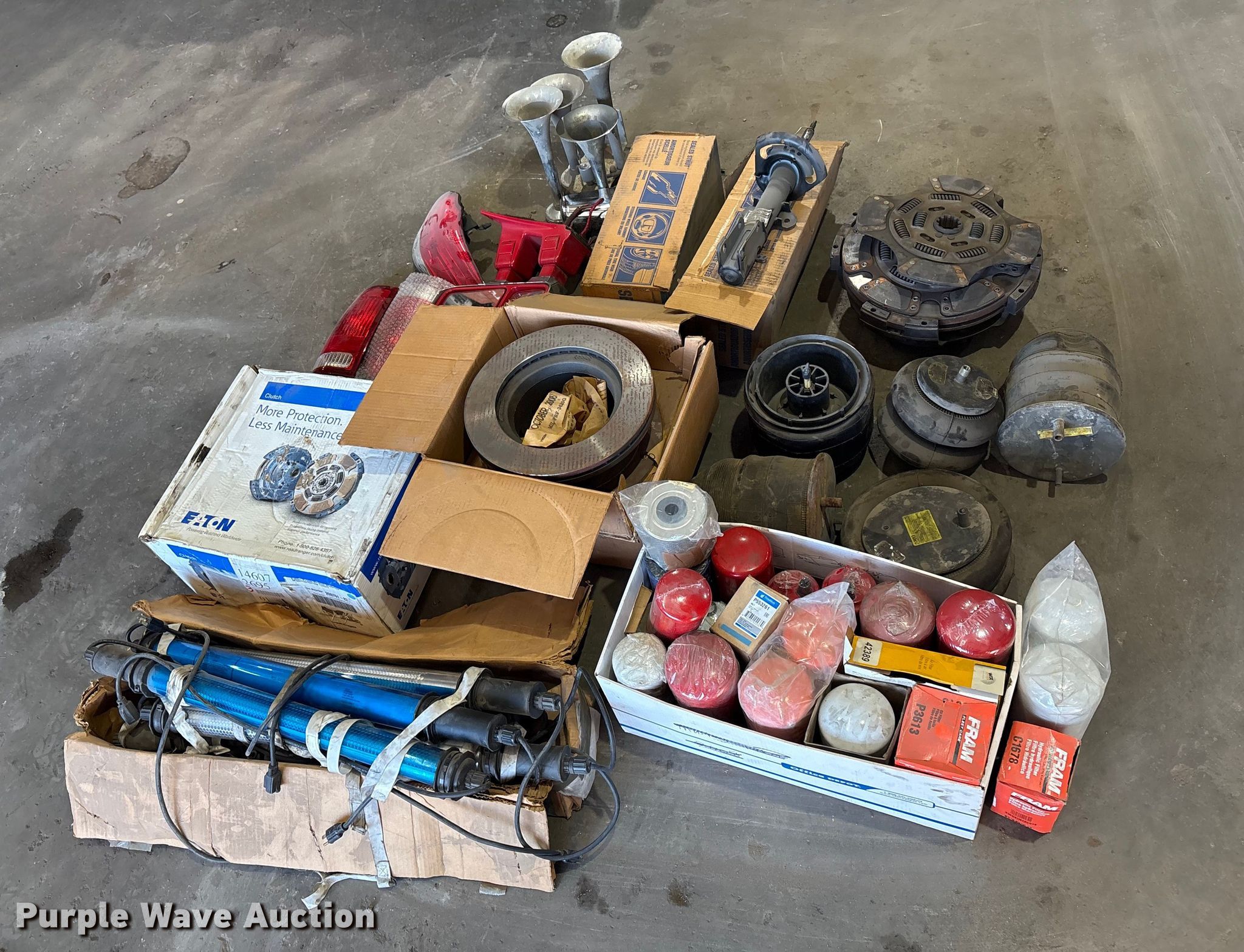 Purple Wave is selling a used Truck Part and Attach. in Oklahoma. This item is a Heavy truck parts with the following: Self adjusting 15.5" clutch, Adjustable 15.5" clutch, Oil filters, Fuel filter, Air filter, Air bags, Work lights, Horn