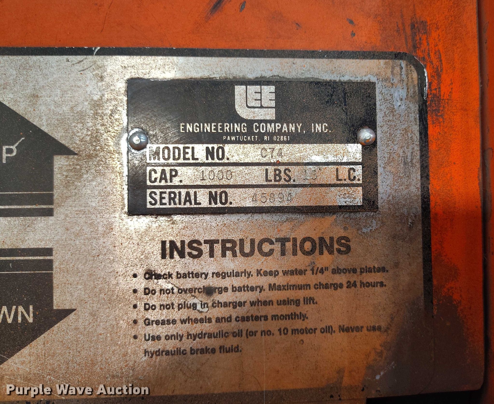 Lee Engineering 74 forklift. Serial: 45894. Electric Motor Volts: 12. Features Maximum lift capacity: 1,000 lbs, Mast stages: 1, Fork length: 25". Tires Solid. Inland Truck Parts. Denver, CO 80239
