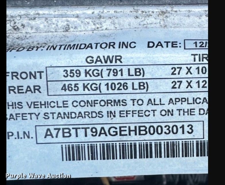 Purple Wave is selling a used Utility Vehicle in Nebraska. This item is a 2017 Intimidator 2500 utility vehicle with the following: Miles: 1,581 on odometer, VIN: A7BTT9AGEHB003013