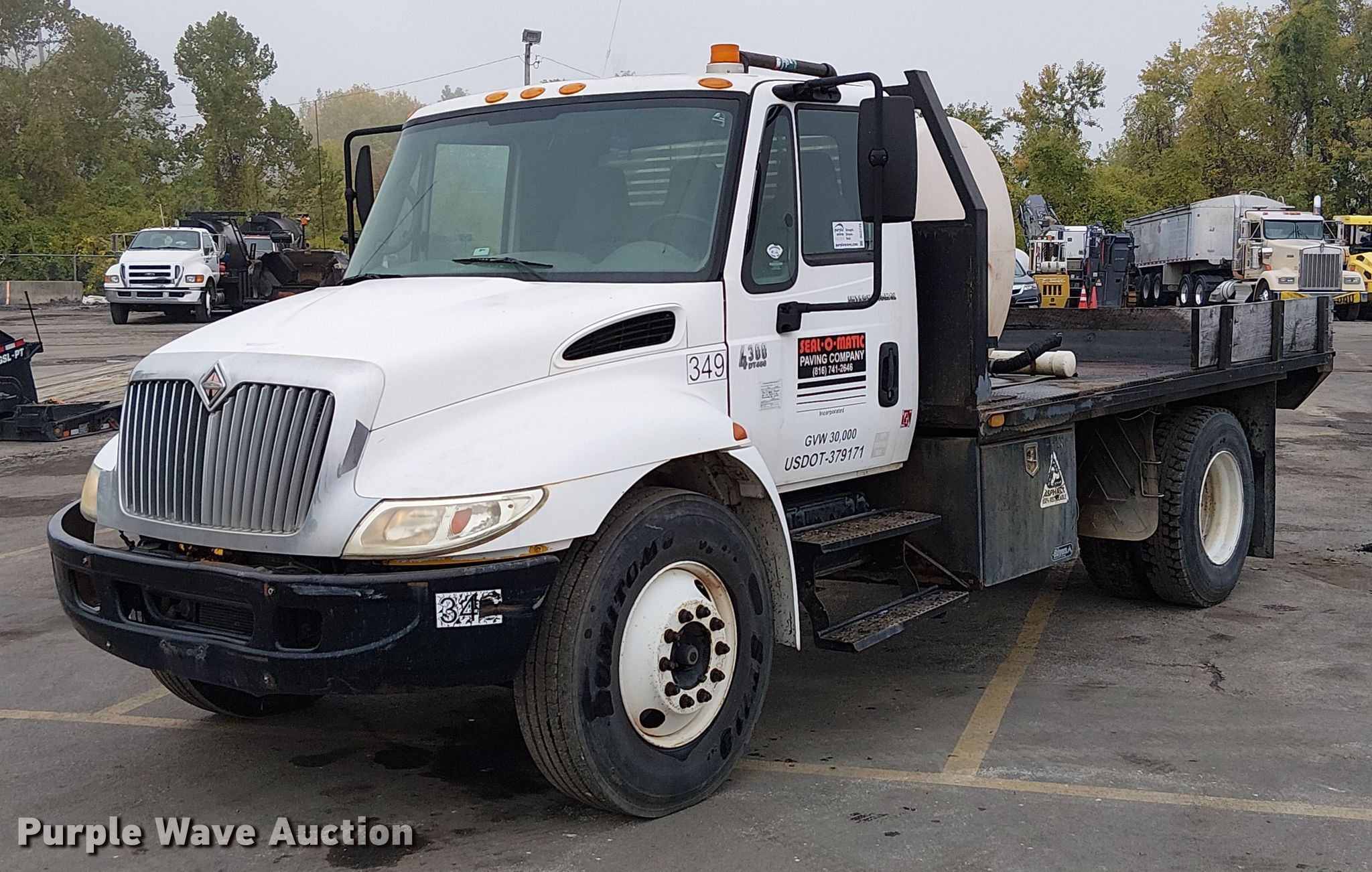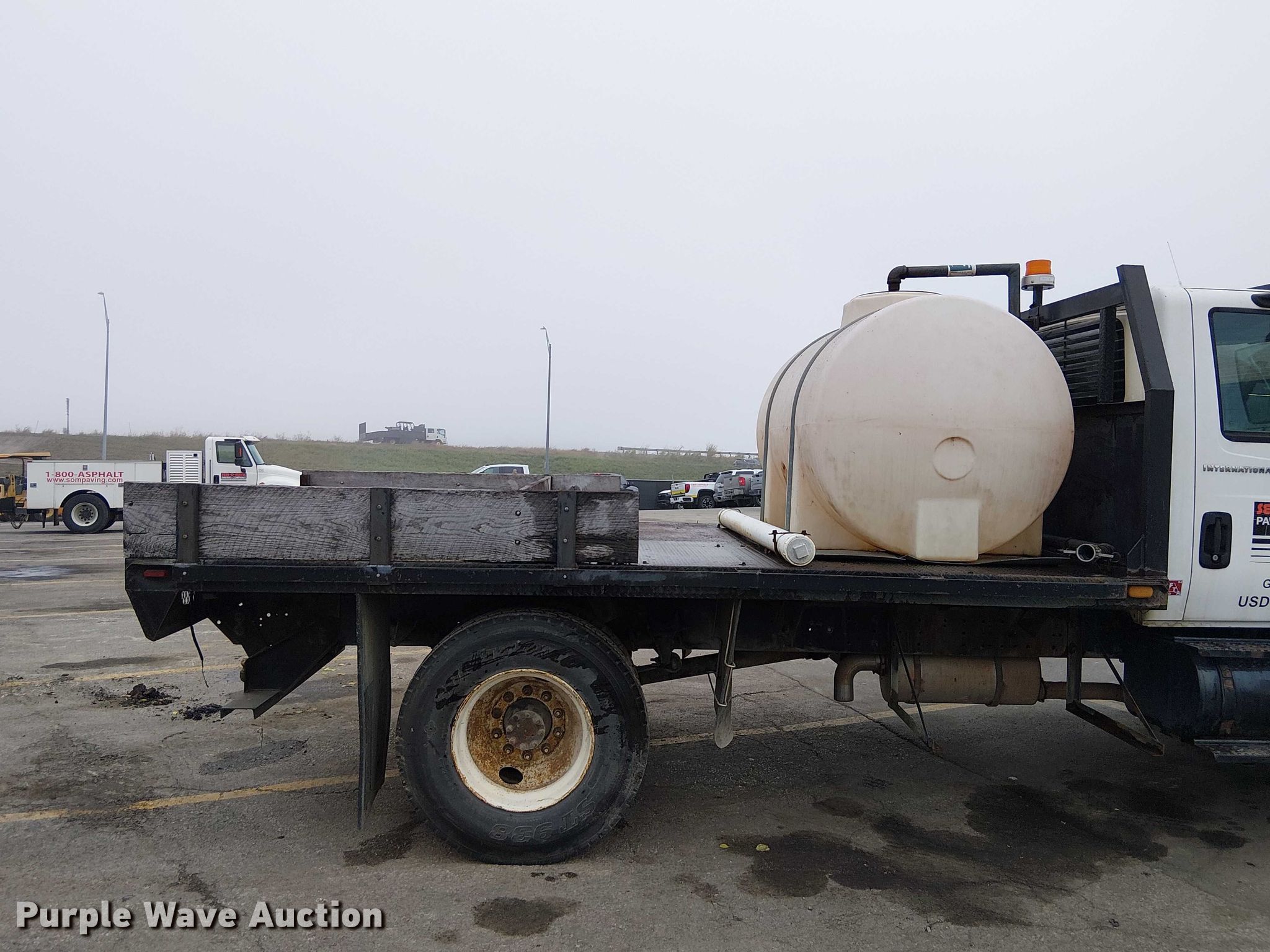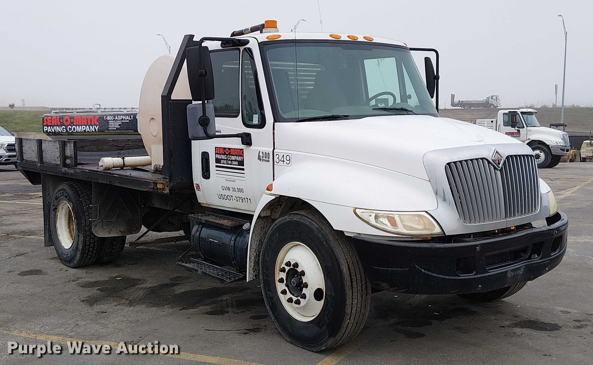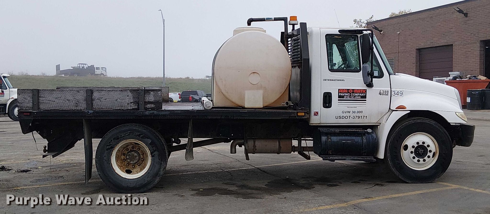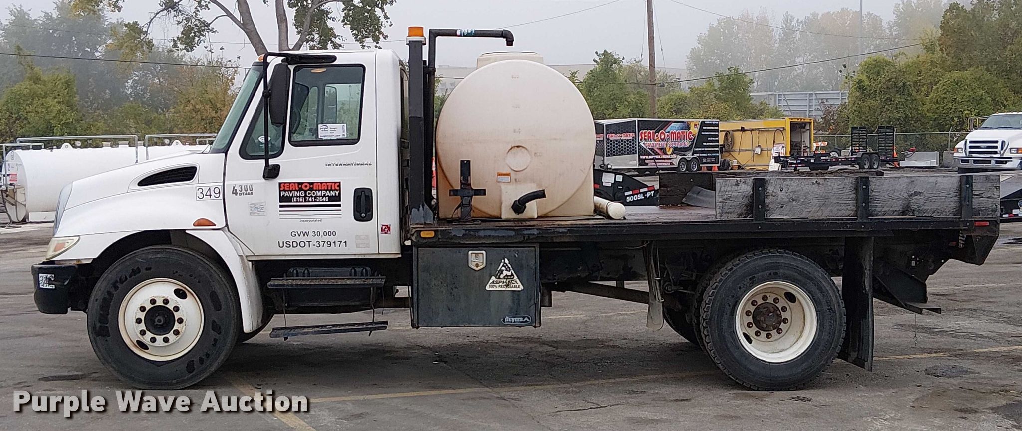 2004 International 4300 flatbed truck. Miles: 245,930 on odometer, VIN: 1HTMMAAM84H593744. Engine International DT466, Displacement: 7.64L, Cylinders: 6, Fuel type: Diesel. Transmission Automatic. Chassis Axles: Single, Suspension: Spring, Brakes: Hydraulic, GVWR: 25,500 lbs. Interior AC, Heat, Cruise control. Features Bed Flatbed, Length: 14', Width: 98", Poly tank Capacity: 500 gallons. Tires Size: 11R22.5. Notes Contents not included, Dash warning indicator: ABS, Windshield chipped or cracked, Jump start required during on-site data collection. Missouri title. Title distribution may be delayed up to 14 days from verification of funds. Seal-O-Matic Paving. Riverside, MO 64150