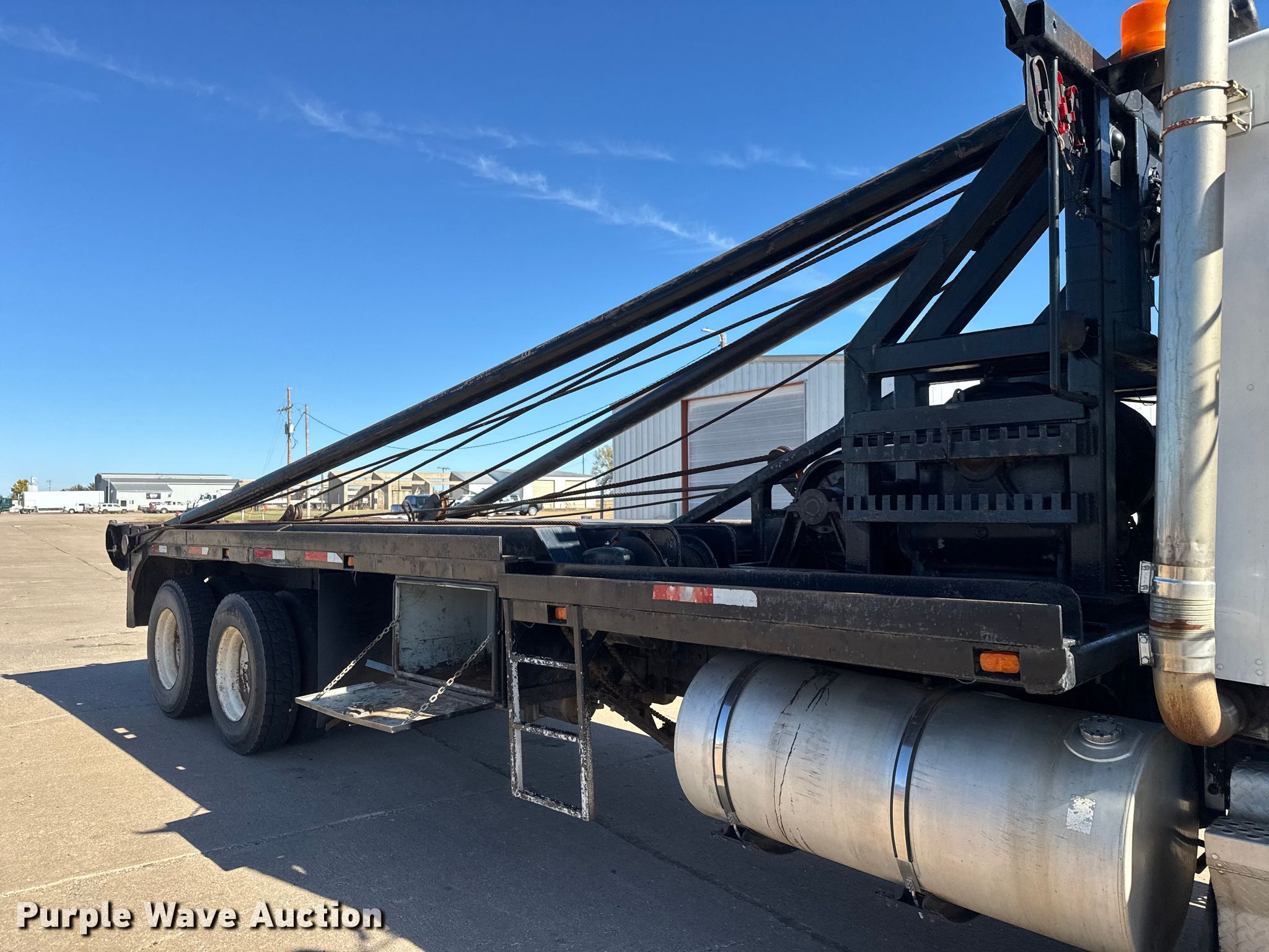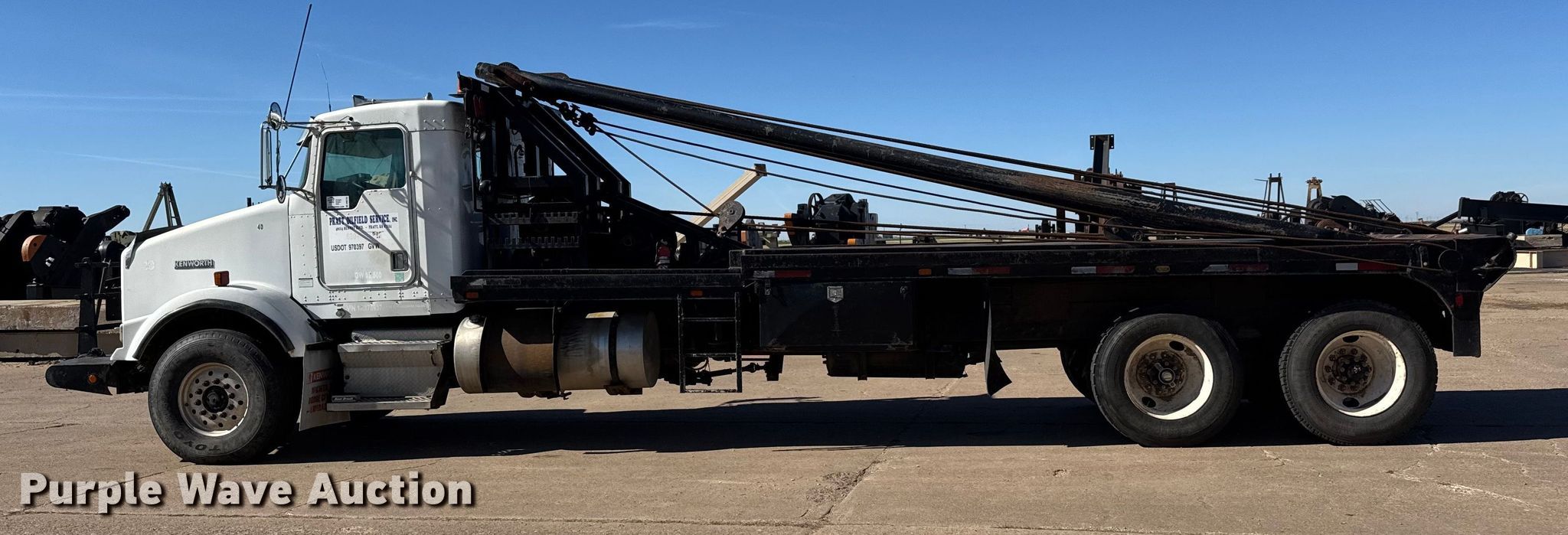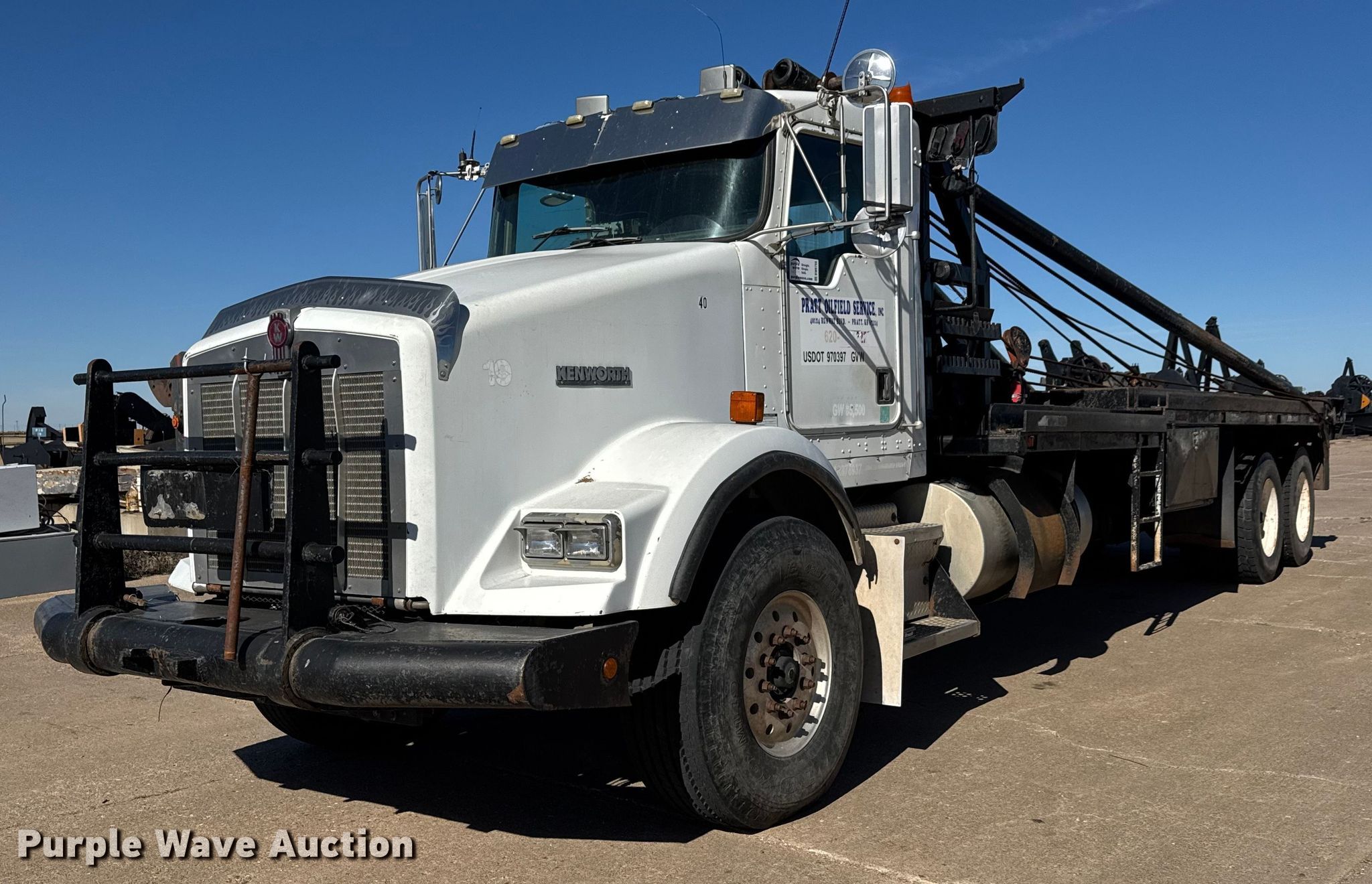 2001 Kenworth T800 winch truck. Miles: 171,829 on odometer, Hours: 22,286 on meter, VIN: 1NKDLB0X21R876937, Unit #: 40. Engine Caterpillar C15, Serial: 6NZ37625, Displacement: 15.2L, Cylinders: 6, Fuel type: Diesel, Engine brake. Transmission Eaton Fuller RTL016913AP, Manual, Speed: 13. Chassis Differential lock: Full, Axles: Tandem, Suspension: Spring over walking beam, Brakes: Air, PTO, GVWR: 64,740 lbs. Interior AC, Heat, Heated mirrors, Cruise control. Features Bed Flatbed, Length: 25' 9", Width: 111", Gin poles: 24.5' L, Rolling tailboard, Winch Tulsa Winch RN100WM-RF0 Capacity: 100,000, Tulsa Winch, Tulsa Winch M24-SLLFU Serial: 90005000006.. Tires Front: 425/65R22.5, Rear: 11R24.5. Notes Windshield chipped or cracked. Kansas title. Title distribution may be delayed up to 14 days from verification of funds. Pratt Oilfield Service, Inc. Retirement - Open inspection December 2, 2025. Pratt, KS 67124