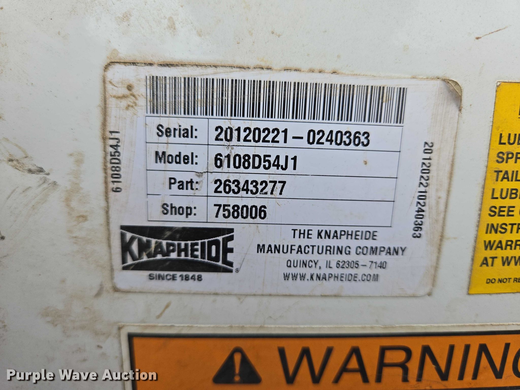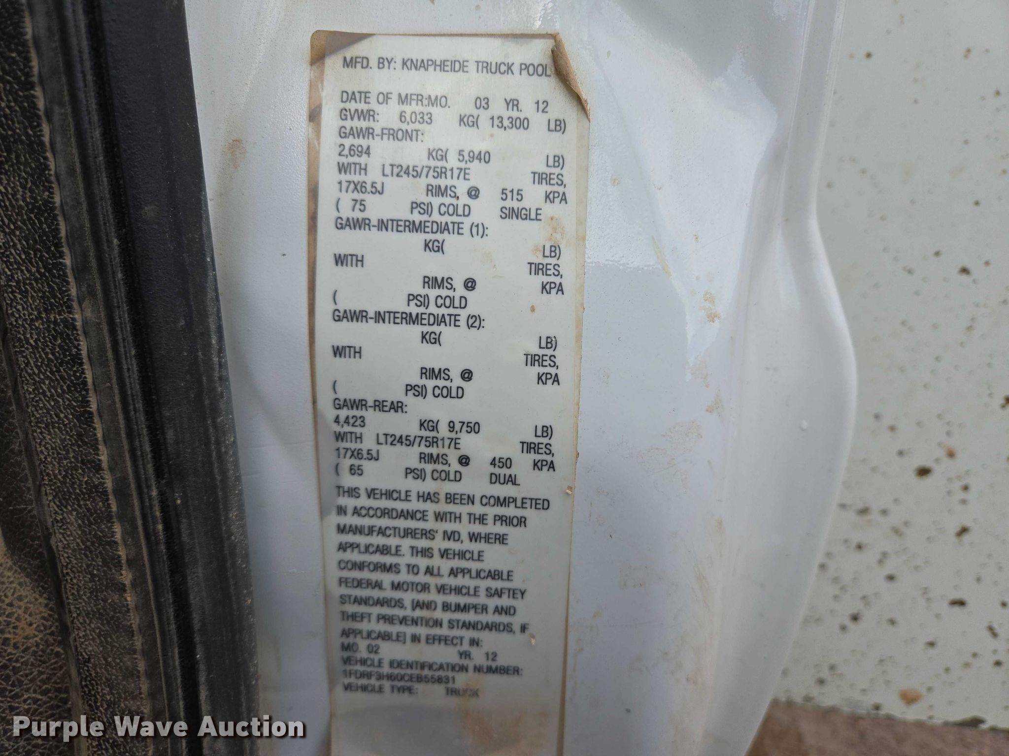 2012 Ford F350 Super Duty XL utility bed pickup truck. Miles: 211,072 on odometer, VIN: 1FDRF3H60CEB55831. Engine Displacement: 6.2L V8 OHV, Cylinders: 8, Fuel type: Gas. Transmission Automatic, Four wheel drive. Interior AC, Heat, Cruise control, Auxiliary controls, Brake controller. Features Bed Utility bed, Knapheide 6108D54J1, Serial: 20120221-0240363, Length: 9', Width: 96". Tires Size: 247/75R17. Notes Dash warning indicator: Airbag, Windshield chipped or cracked, Hail damage, Jump start required during on-site data collection, Transmission issues. South Dakota title. Title distribution may be delayed up to 14 days from verification of funds. Heavy Constructors, Inc. Rapid City, SD 57709