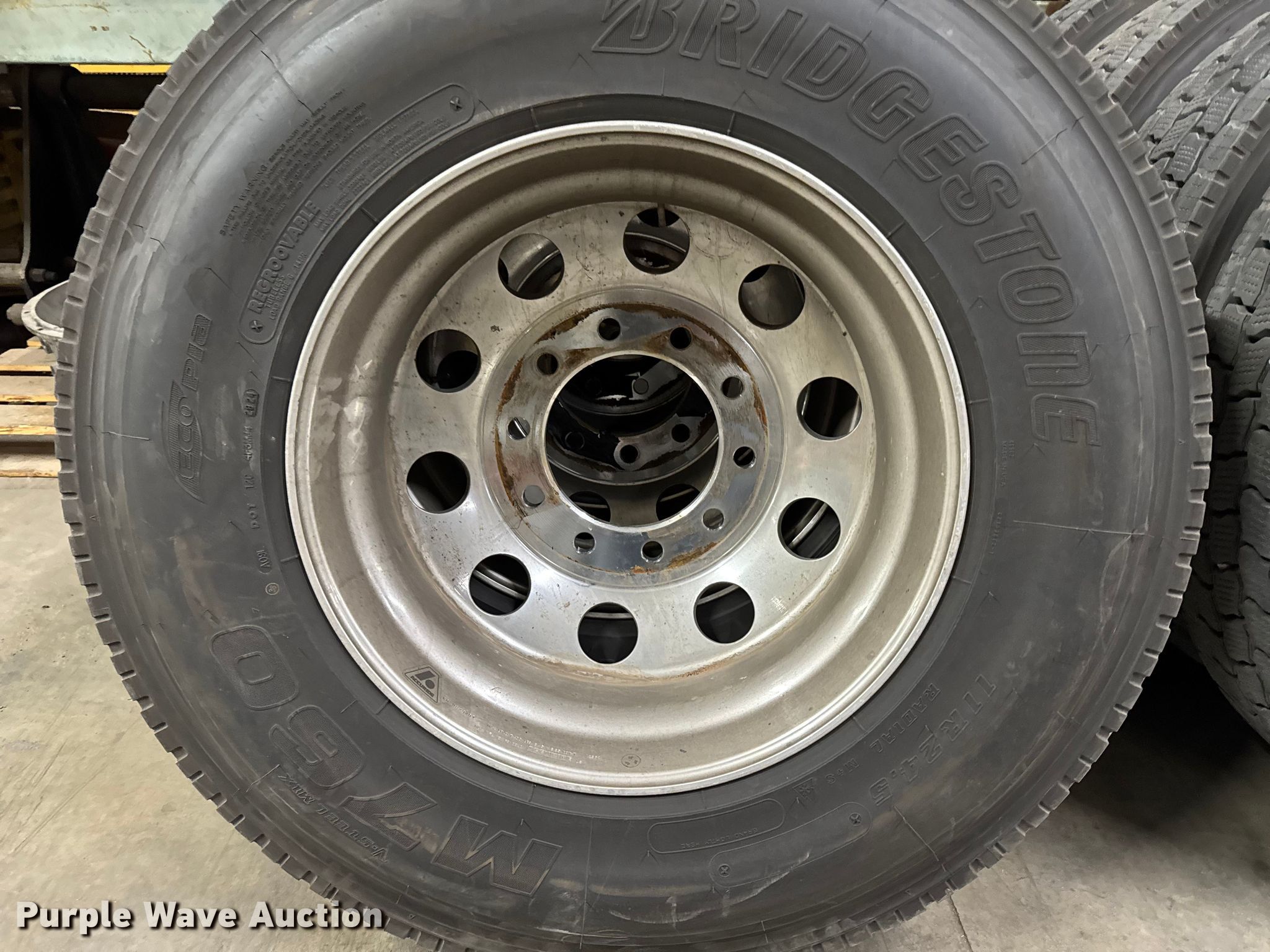 Purple Wave is selling a used Industrial Tires or Tracks in Iowa. This item is a (16) Bridgestone M760 11R24.5 tires and wheels with the following: Aluminum wheels