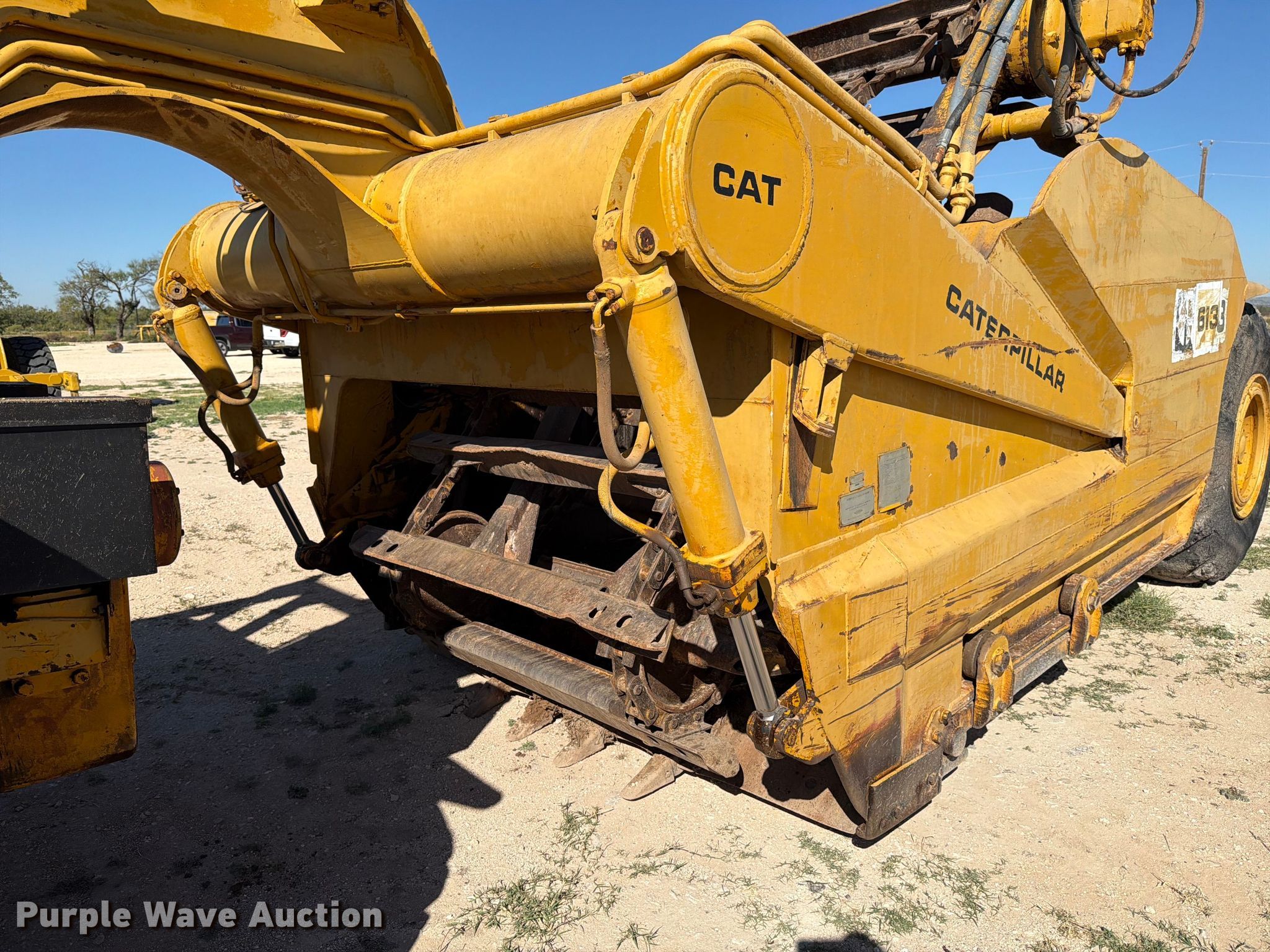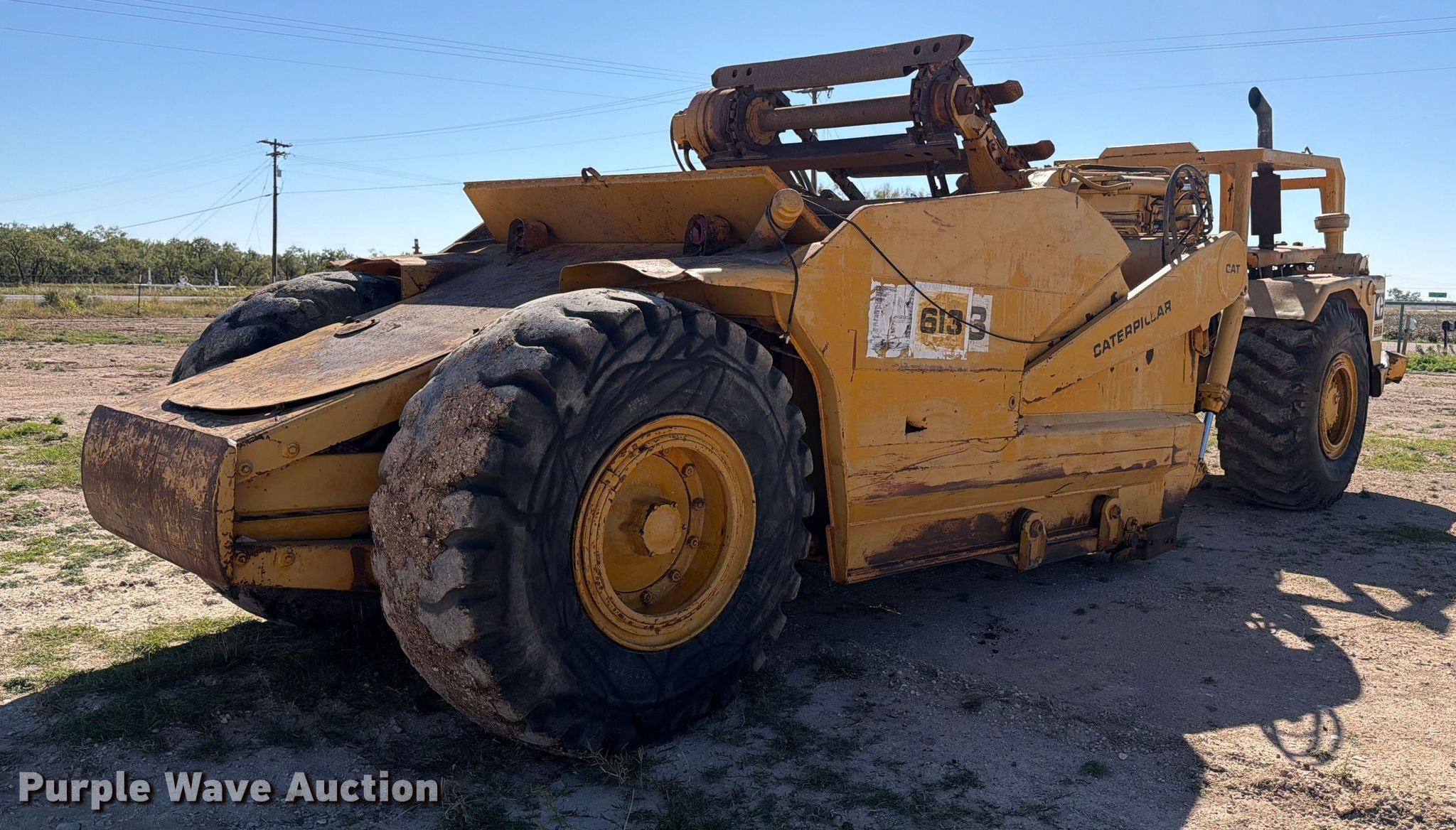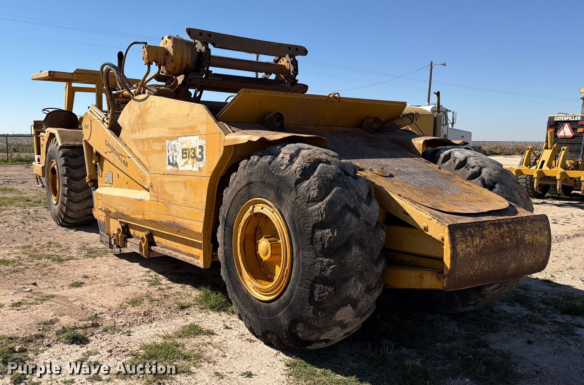 1972 Caterpillar 613 elevating scraper. Hours: 889 on meter, Serial: 72M1373. Engine Caterpillar 3160, Cylinders: 8, Fuel type: Diesel. Transmission Powershift, 4F - 2R. Chassis Brakes: Air. Operators station OROPS. Features Reversible cutting edge, Elevator reverse, Hydraulic lift, Scraper controls: Lever controls No. of controls: 3, Rear push block. Tires Size: 23.5-25. Notes Hydraulic cylinder leak. Roger's Motorgrader Service. San Angelo, TX 76905