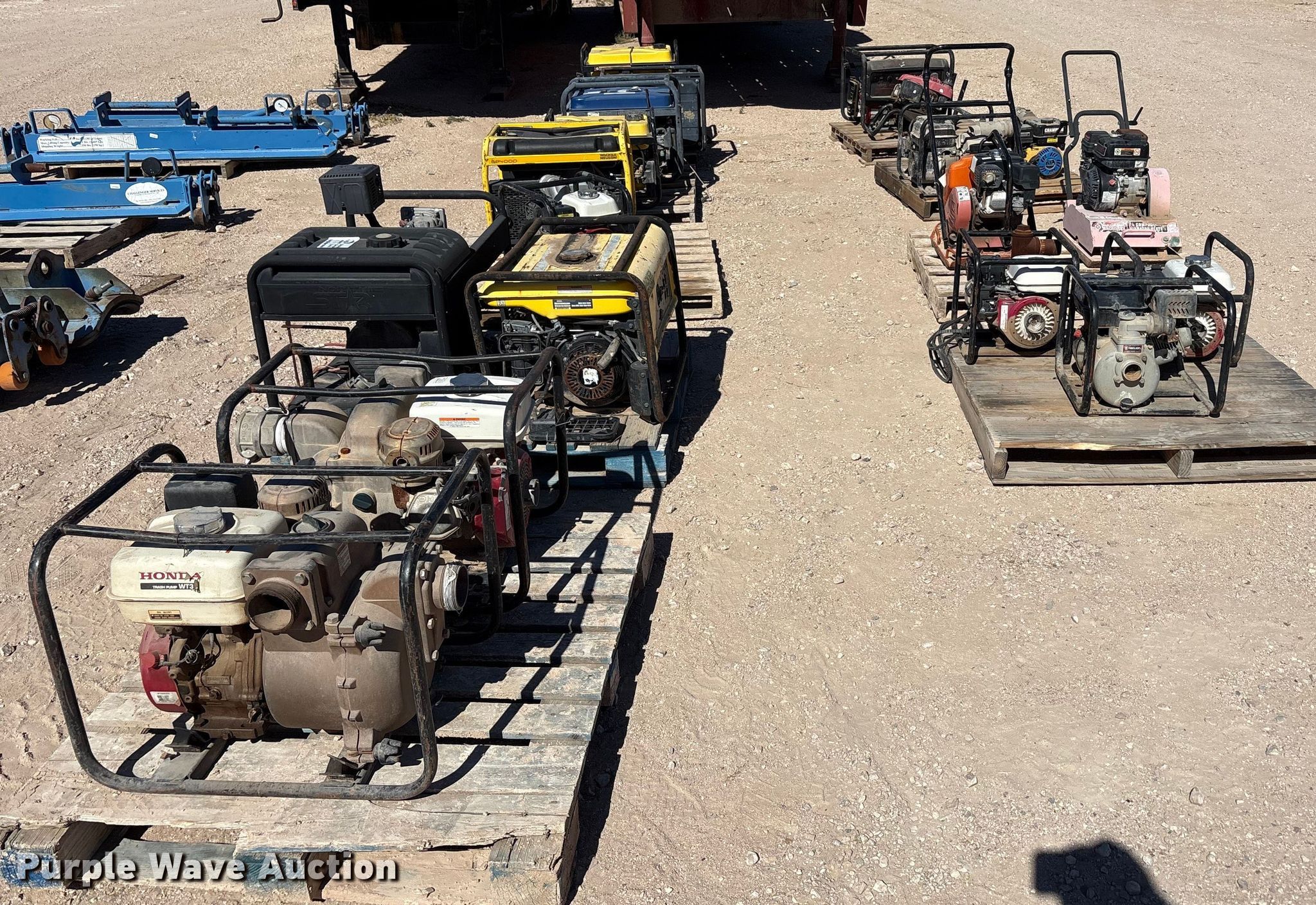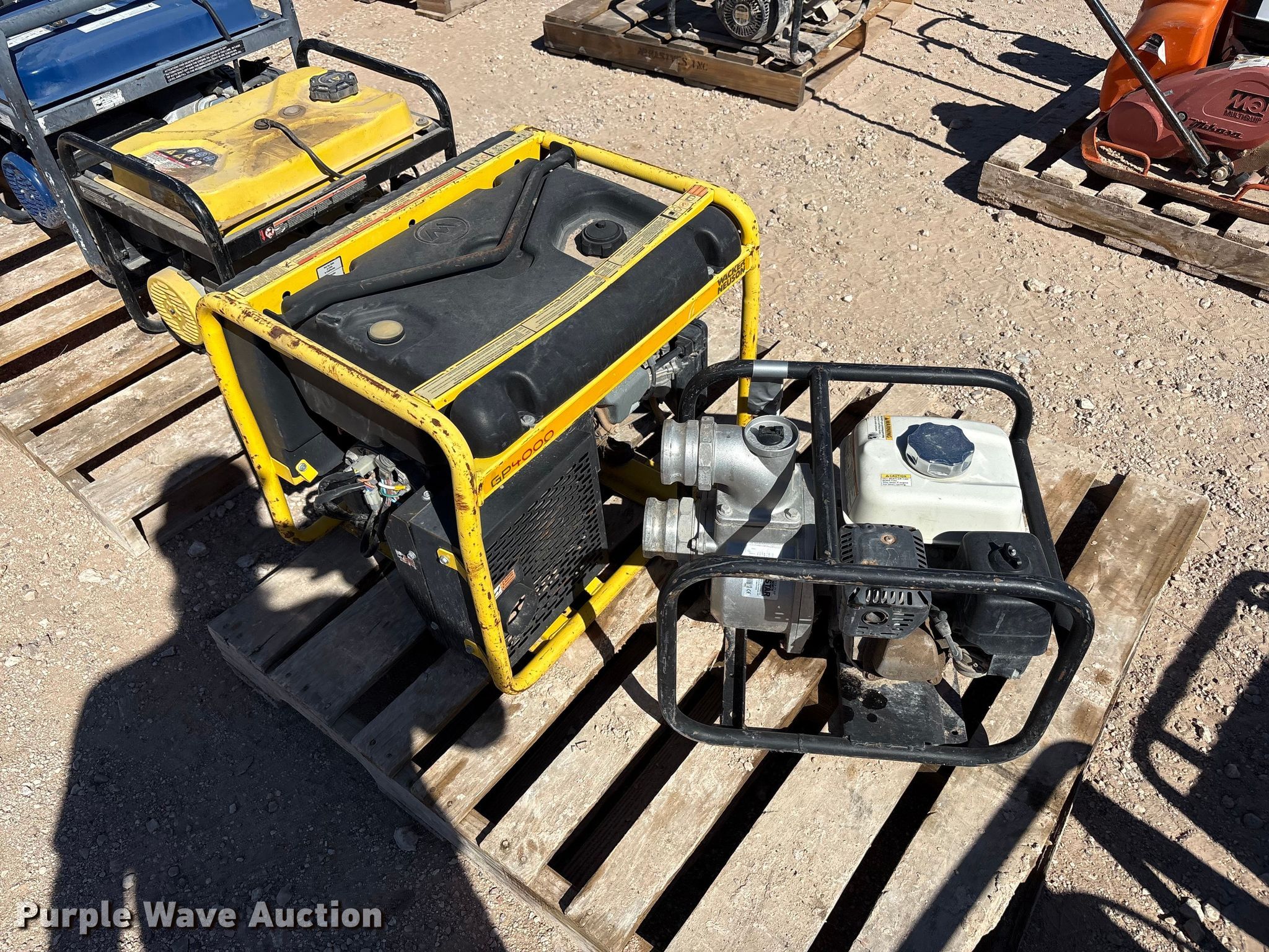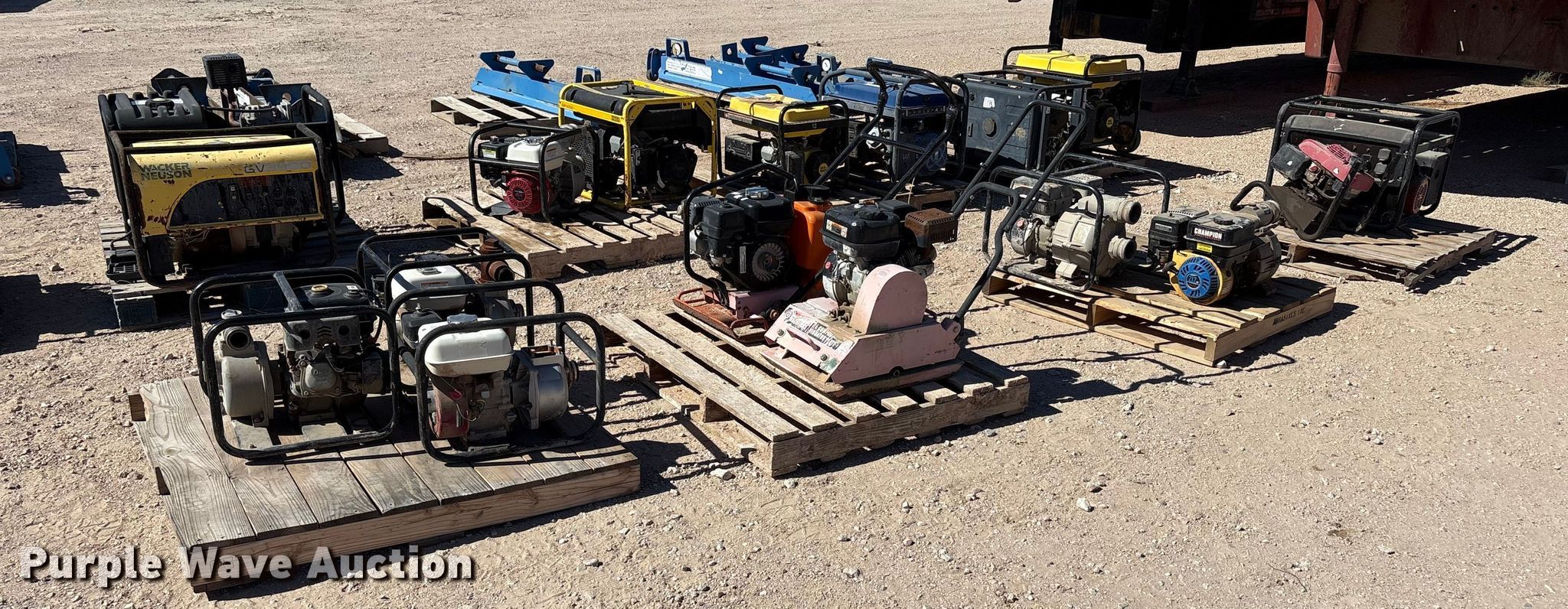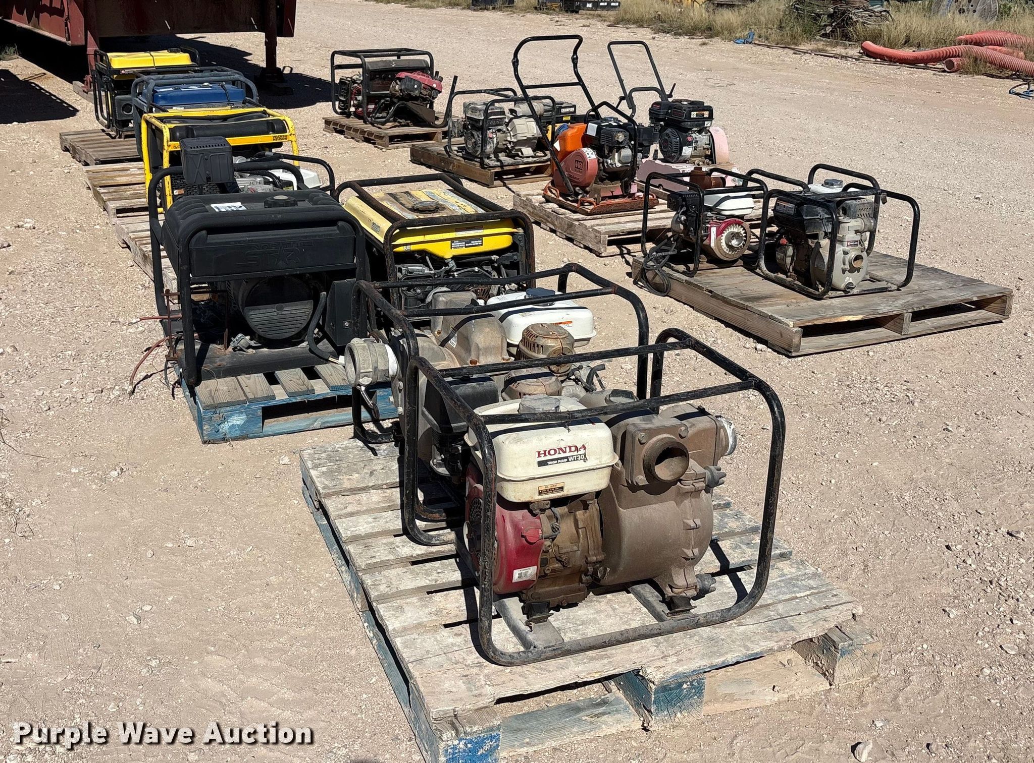 Purple Wave is selling a used Tools in Texas. This item is a Tools with the following: (8) generators, (8) water pumps, (2) plate compactors, Pressure washer