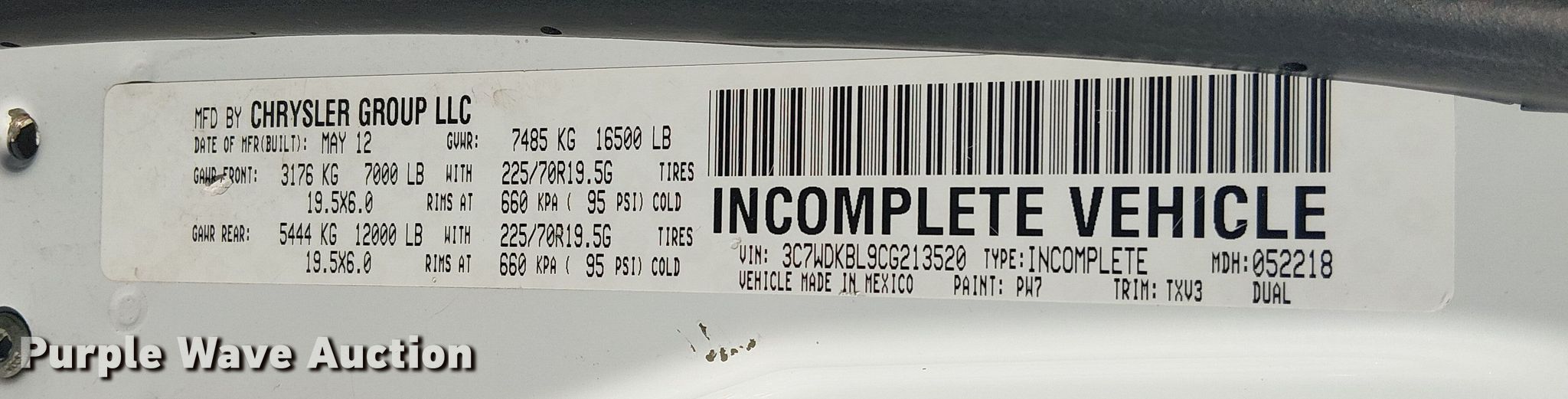 - VIN: 3C7WDKBL9CG213520