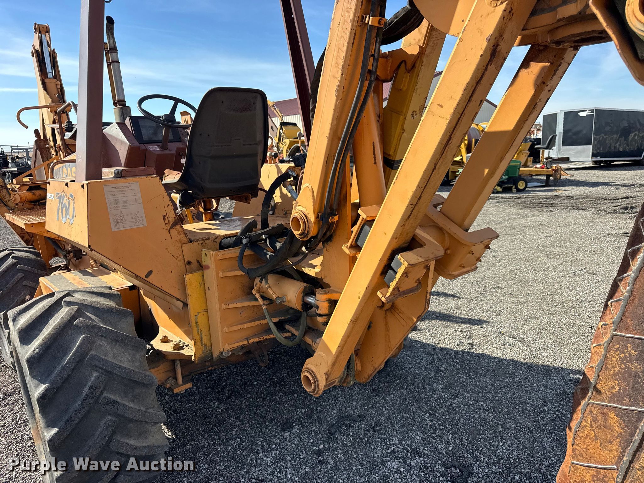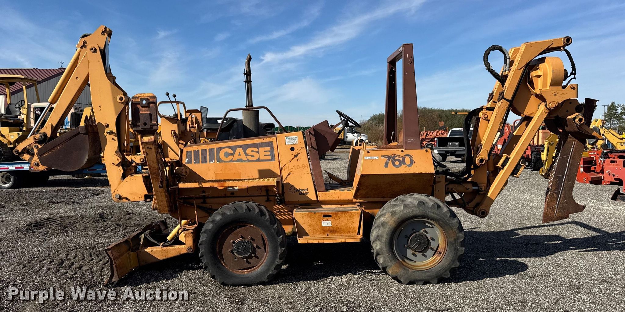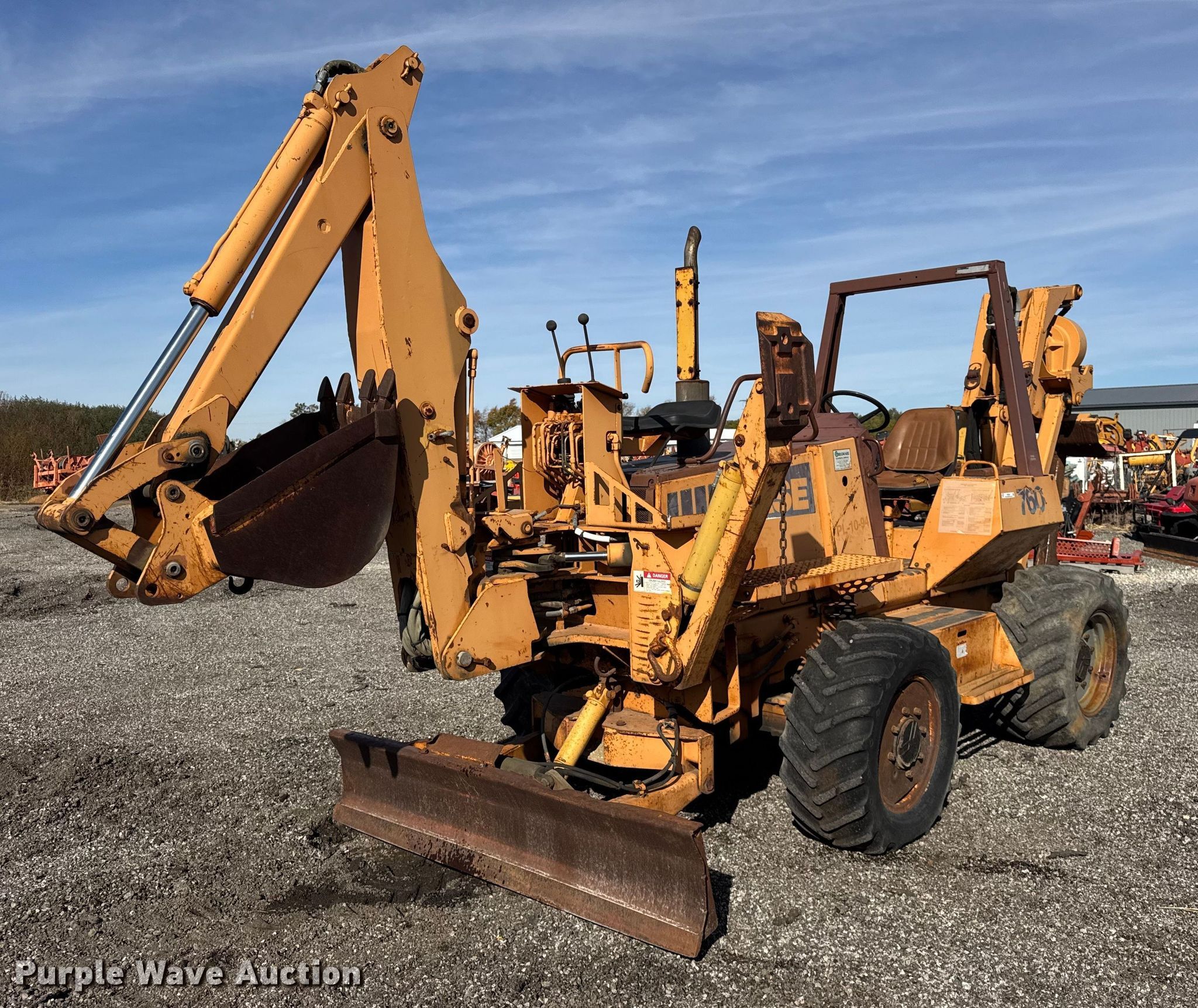 1989 Case 760 vibratory cable plow. Hours: 2,261 on meter, Serial: JAF0023094. Engine Case 4-390, Serial: 44409159, Cylinders: 4, Fuel type: Diesel. Transmission Hydrostatic. Chassis Four wheel drive, Four wheel steer. Operators station OROPS. Features Vibratory plow Depth: 48", Backhoe Bucket width: 18", Backfill blade Width: 81". Tires Size: 38x18.00-20. Notes Non-operational front left outrigger hydraulic valve. EquipmentCity LLC. Clinton, IL 61727