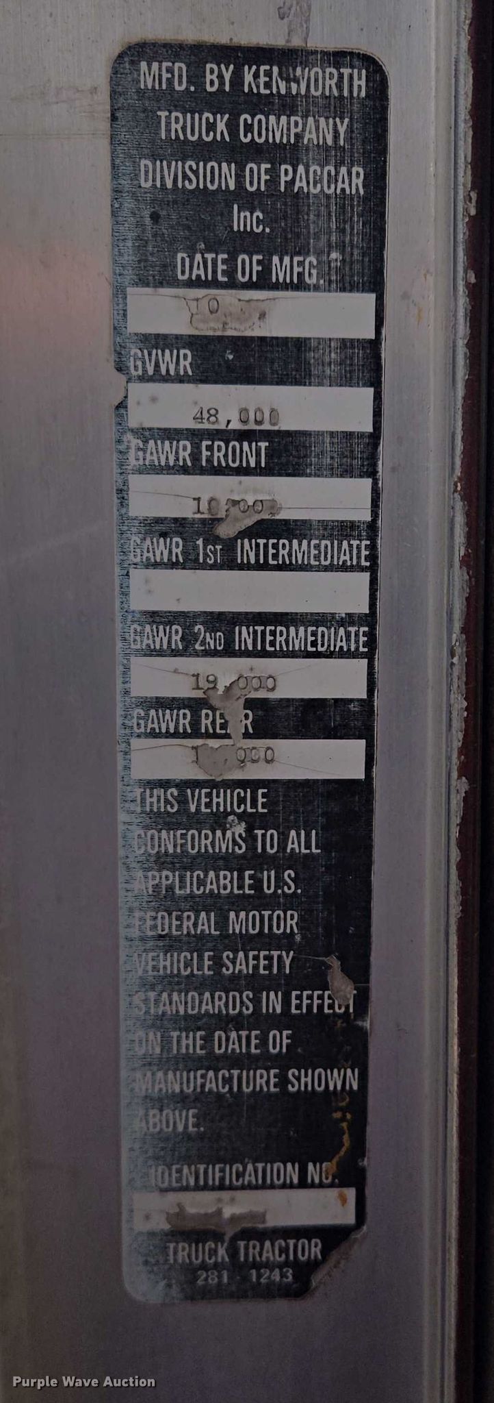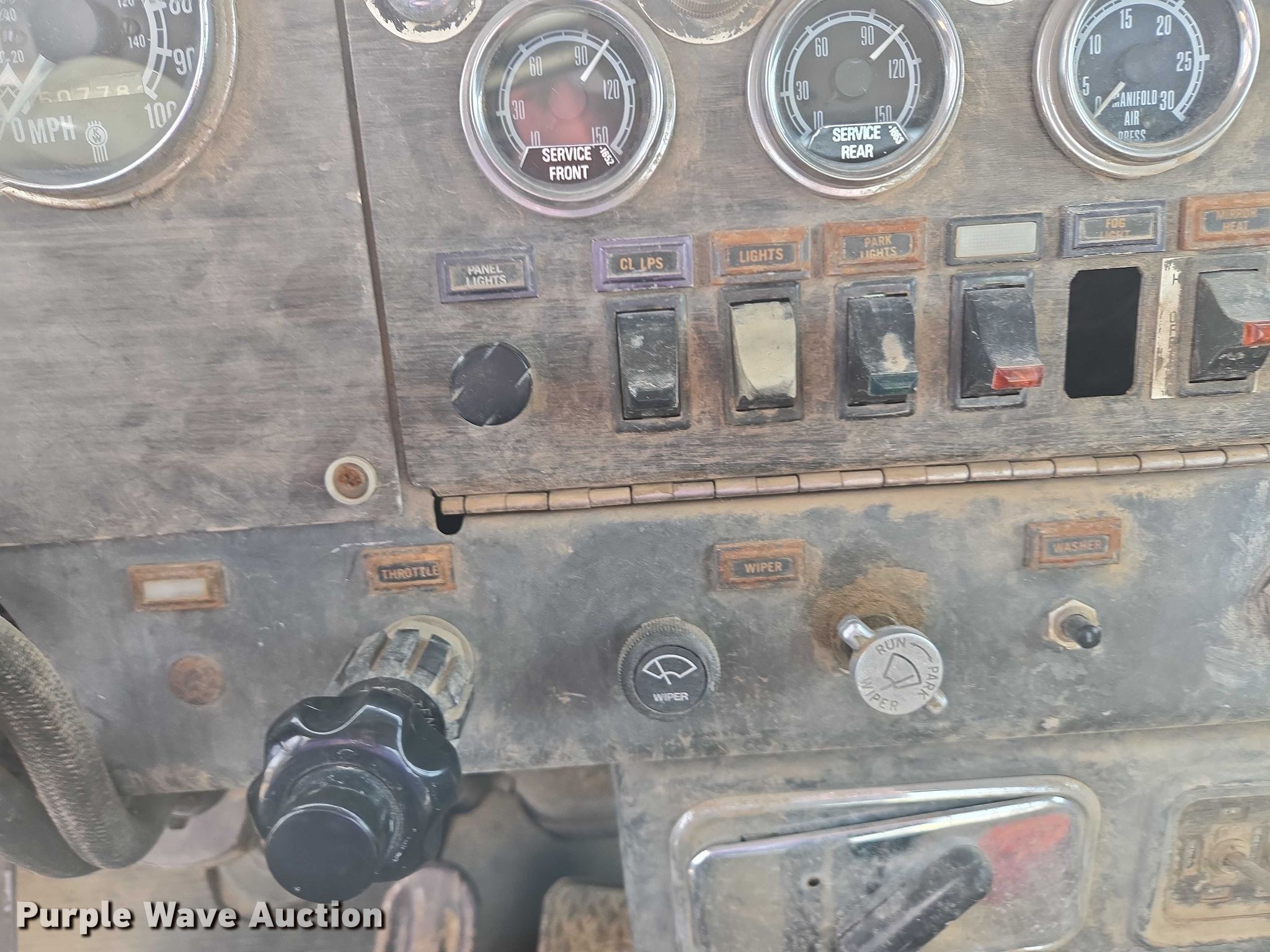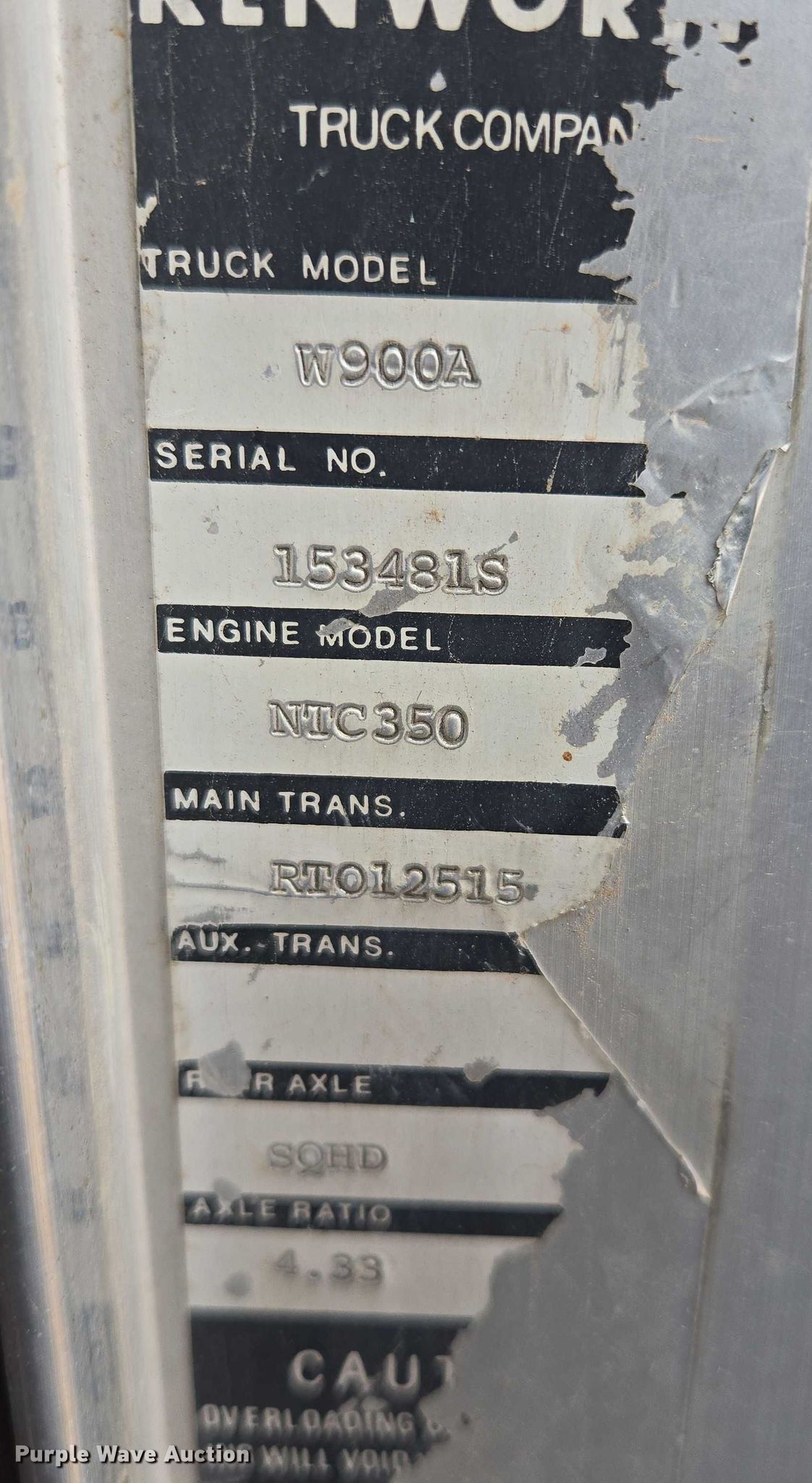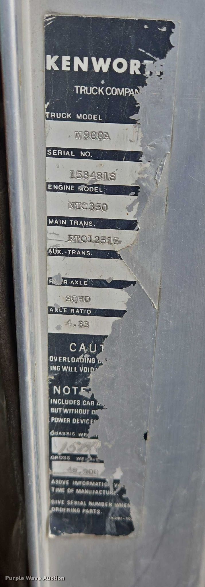 1977 Kenworth W900A truck cab and chassis. Miles: 607,783 on odometer, Hours: 2,707 on meter, VIN: 153481S. Engine Cylinders: 6, Fuel type: Diesel. Transmission Eaton Fuller, Manual, Speed: 13. Chassis Axles: Tandem, Differential lock: Inter-axle, Suspension: Air, Brakes: Air, Truck chassis: 19' 6", GVWR: 48,000 lbs. Interior Heat. Features Fuel tank: Single. Tires Size: 285/75R24.5. Notes Non-operational drivers window, does not roll up, Windshield chipped or cracked, Front differential issues Must be engaged to move. South Dakota title. Title distribution may be delayed up to 14 days from verification of funds. Heavy Constructors, Inc. Rapid City, SD 57709