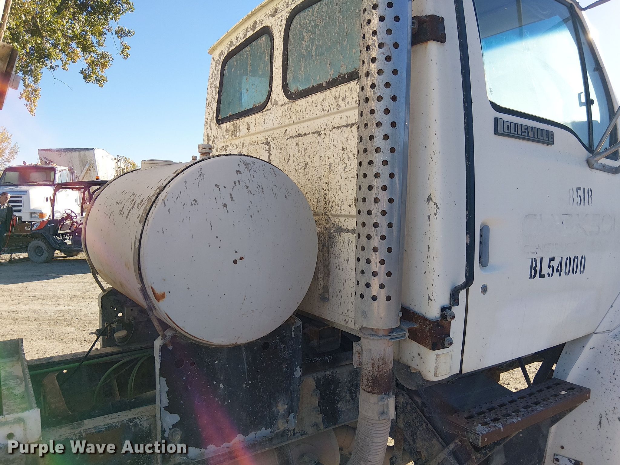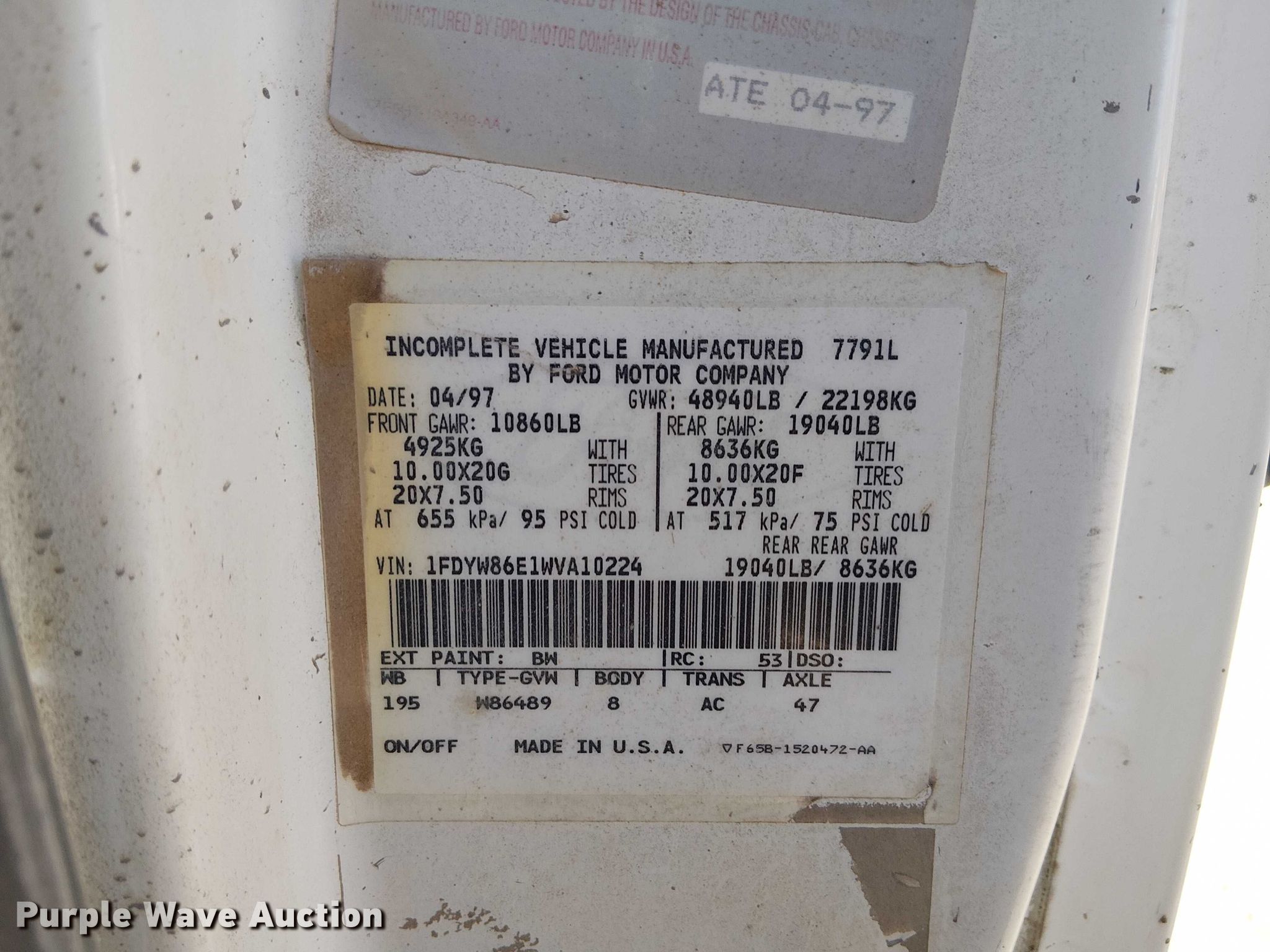 1998 Ford LT8500 concrete agitator truck. Miles: 119,623 on odometer, VIN: 1FDYW86E1WVA10224. Engine Cummins, Displacement: 8.3L, Cylinders: 6, Fuel type: Diesel. Transmission Automatic. Chassis Axles: Tandem, Suspension: Spring, Brakes: Air, Front mount PTO, GVWR: 48,940 lbs FAWR: 10,860 lbs, IAWR: 19,040 lbs, RAWR: 19,040 lbs. Interior Heat. Features Mixer Maxxon Agitor, Discharge: Rear, Chute Extensions: 2, Chute type: Steel.. Tires Size: 11R22.5. Notes Jump start required during on-site data collection. Missouri title. Title distribution may be delayed up to 14 days from verification of funds. Clarkson Construction Co.. Kansas City, MO 64120