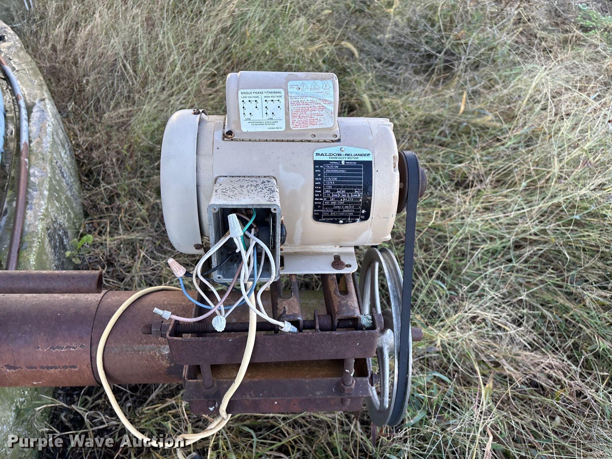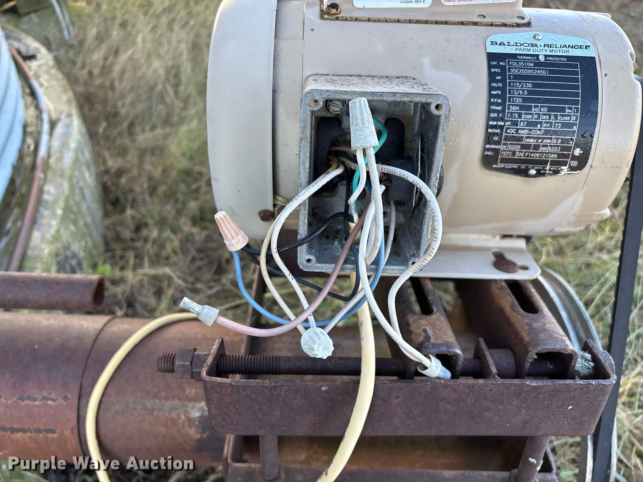 MFS grain bin. Features. Diameter: 17'10", (6) rings Approx. 32", Unload auger Diameter: 6", Length: 33.5", Electric motor Baldor Reliance Farm Duty, HP: 1, Volts: 115/230, Phase: Single, Drying fan. Notes Concrete pad not included, Top lid missing, Unknown operating condition of electric motors, Unknown operating condition. Buyer responsible for all aspects of teardown and removal. Hutto Grain & Livestock Inc.. Spring Valley Township, KS 66713